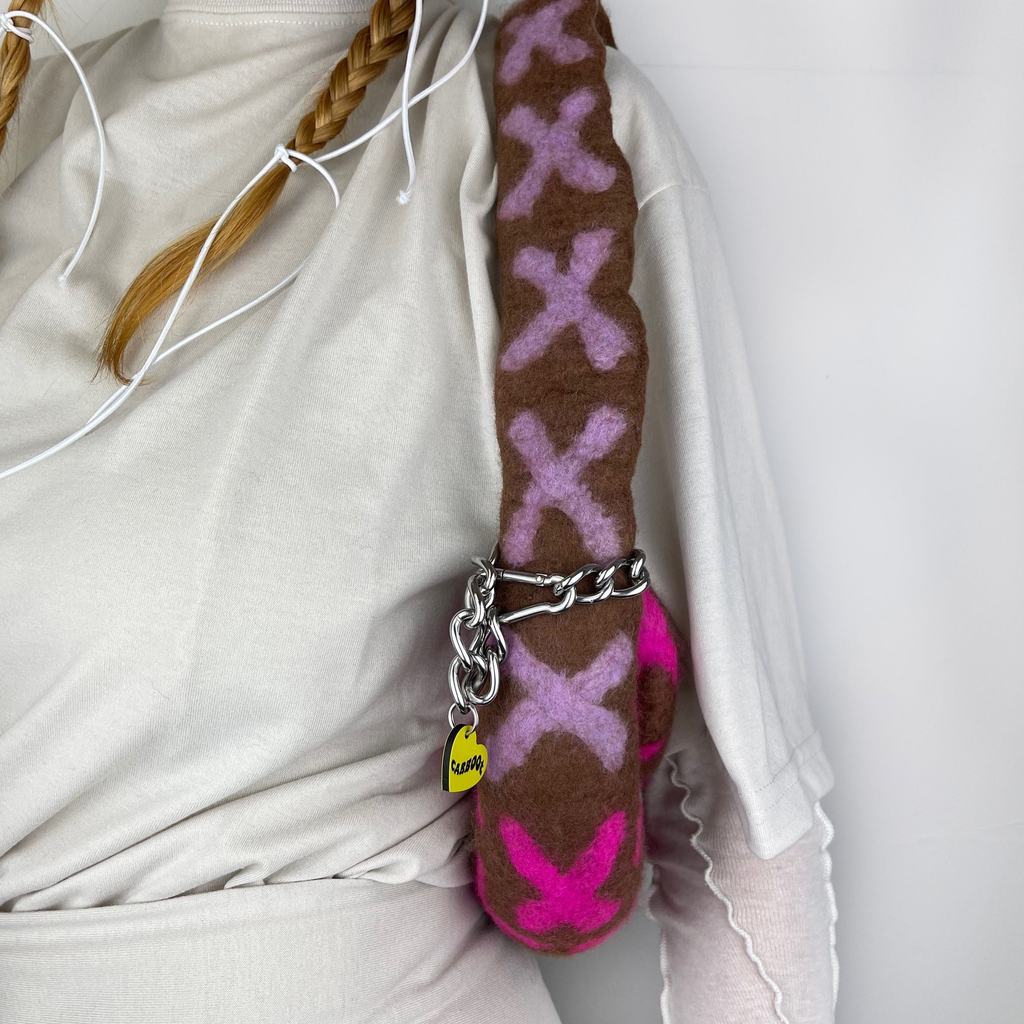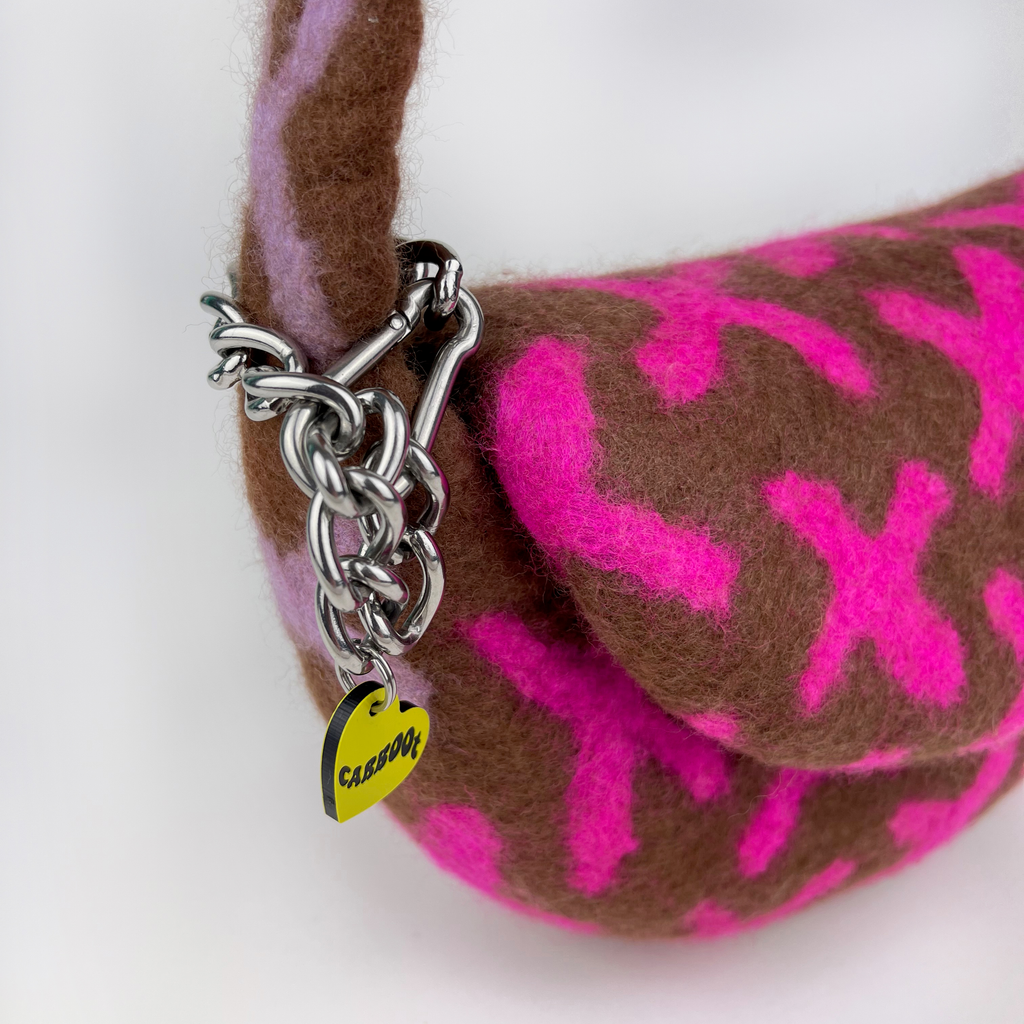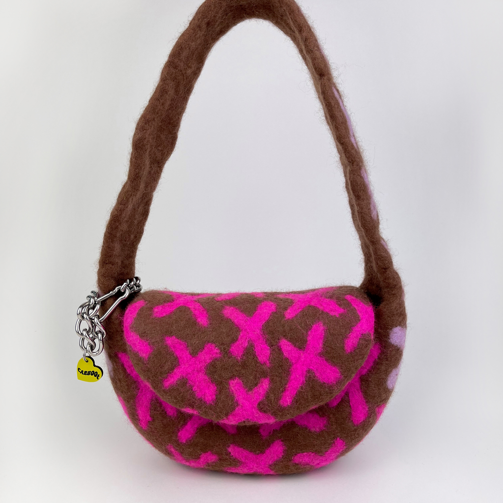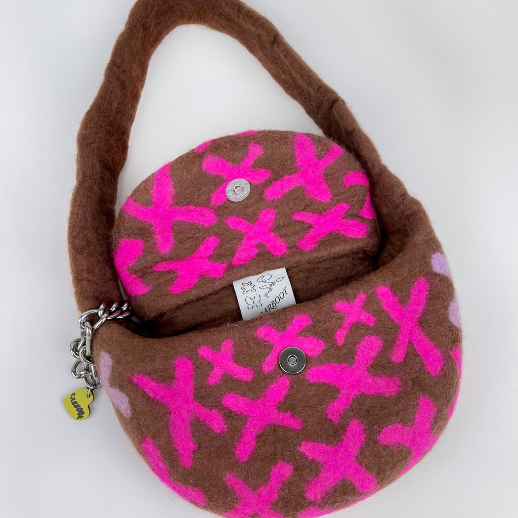 A solid, hand-felted, rounded handbag with an integrated marble effect. Fastened with a magnetic snap closure and finished with a stainless steel chain and heart shaped Carboot tag. Fits an iphone maxi, slim wallet, keys, lipgloss.