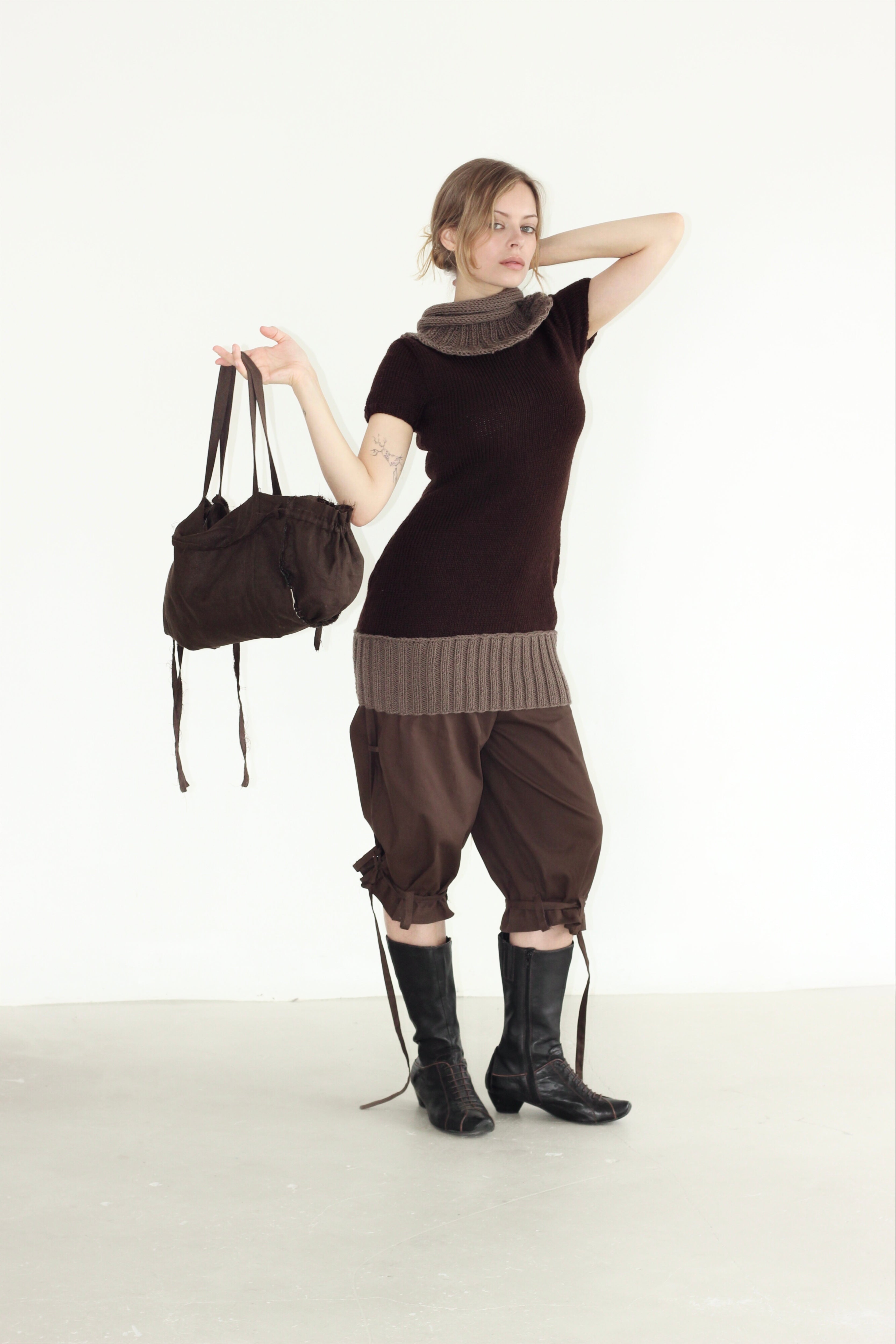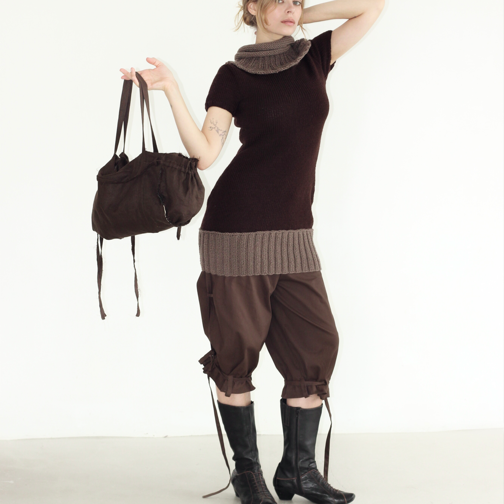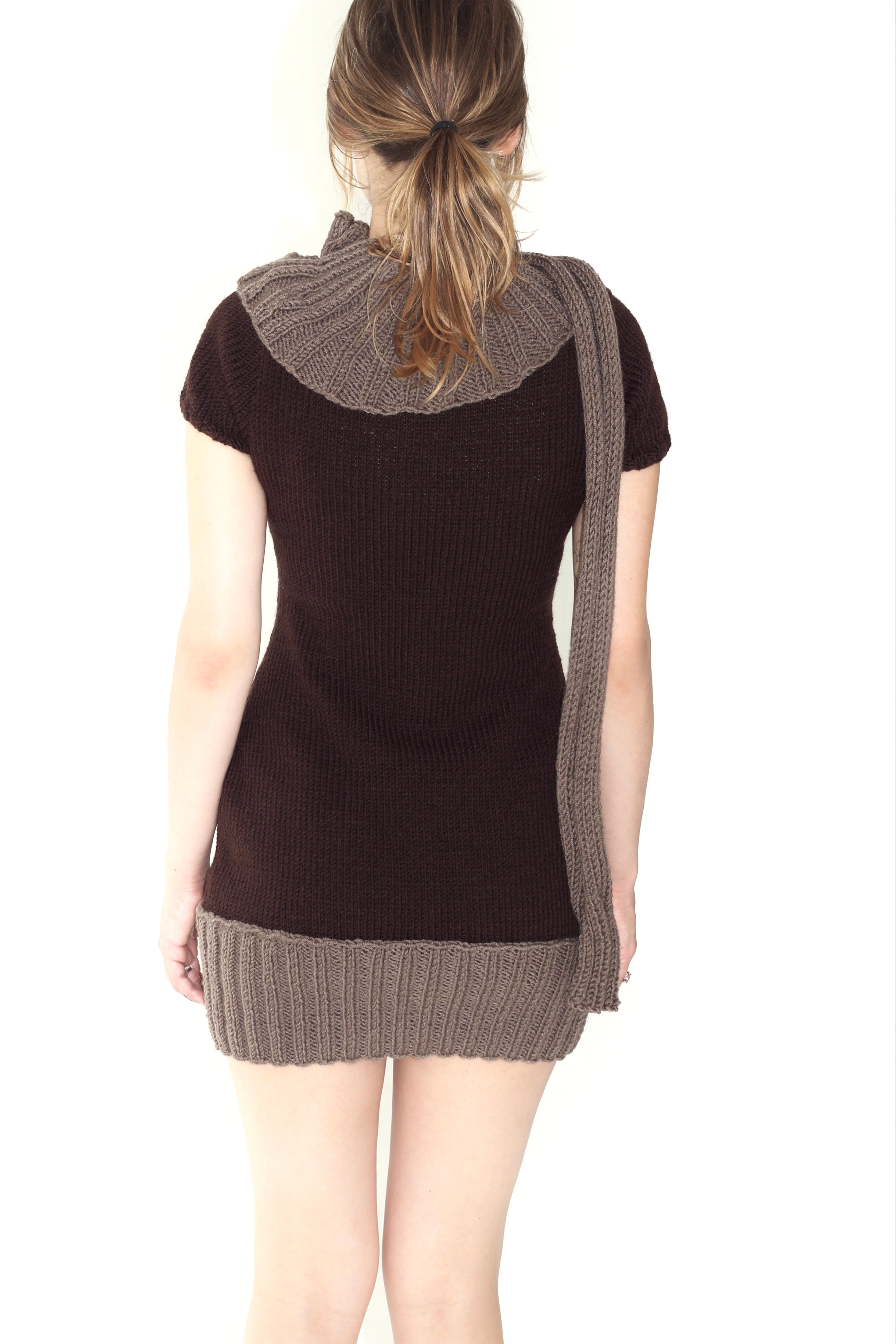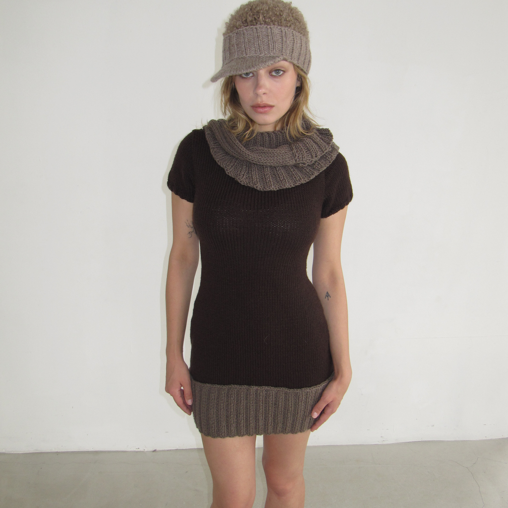 Knitted mini-dress with short sleeves, a unique collar, and hand-knitted details. It can be worn as a dress or styled as a tunic. The yarn is soft to the touch, making it as comfortable as it is charming. A hand-knitted scarf is designed to attach to the collar with snaps — sold separately.