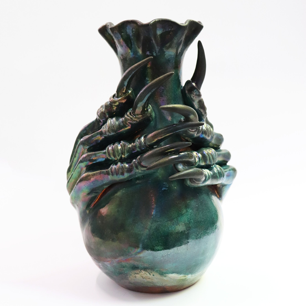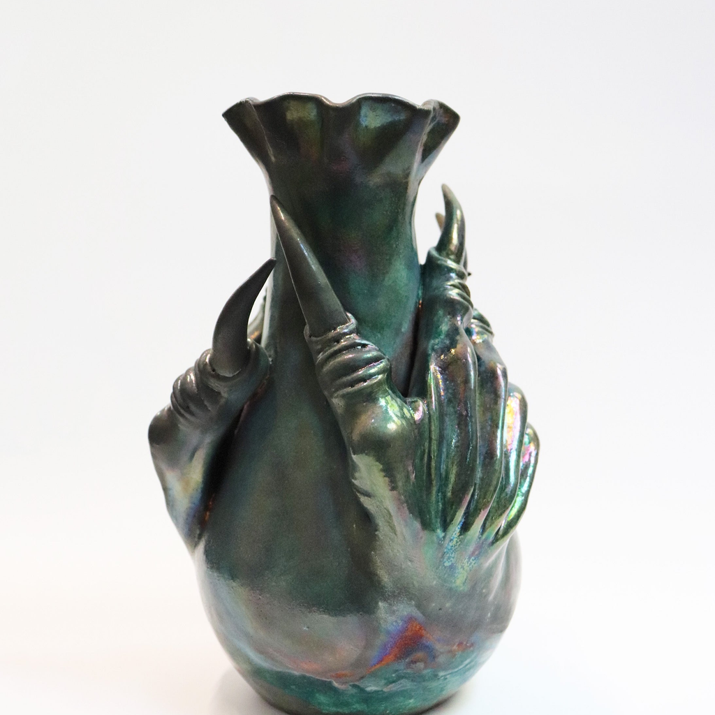 Due to the firing technique, the vase is not waterproof; it is non-functional (or you can use a plastic bag to seal it). This unique piece is handmade.