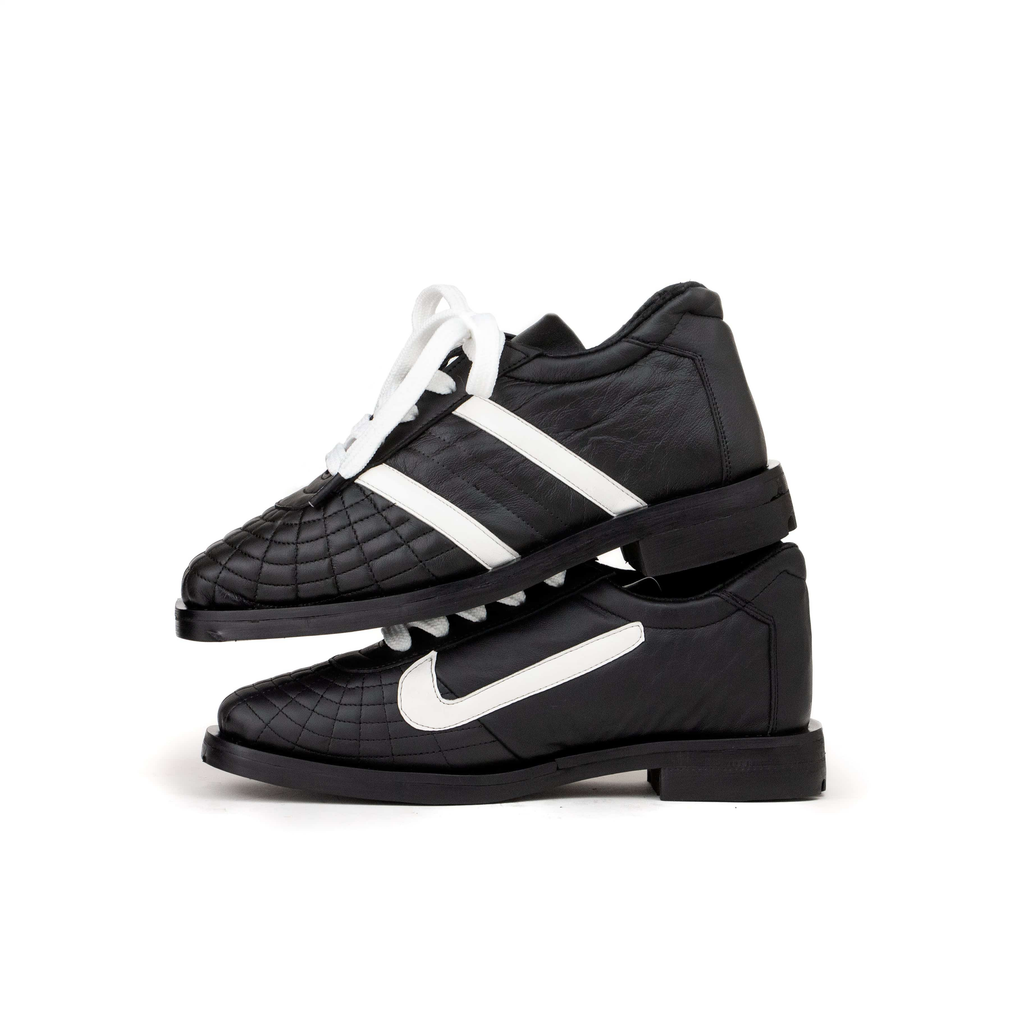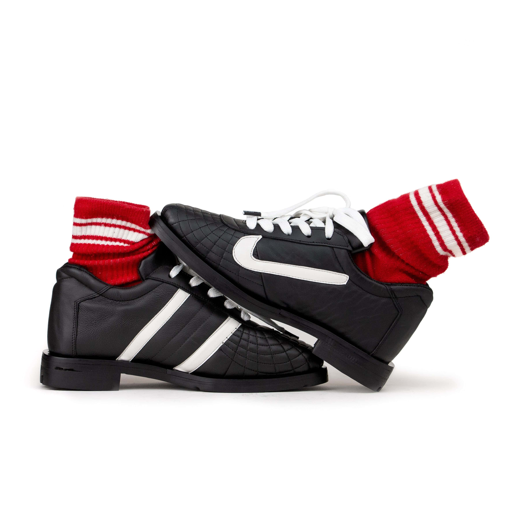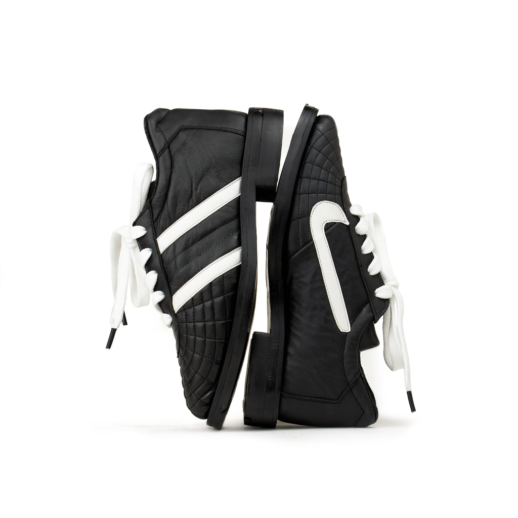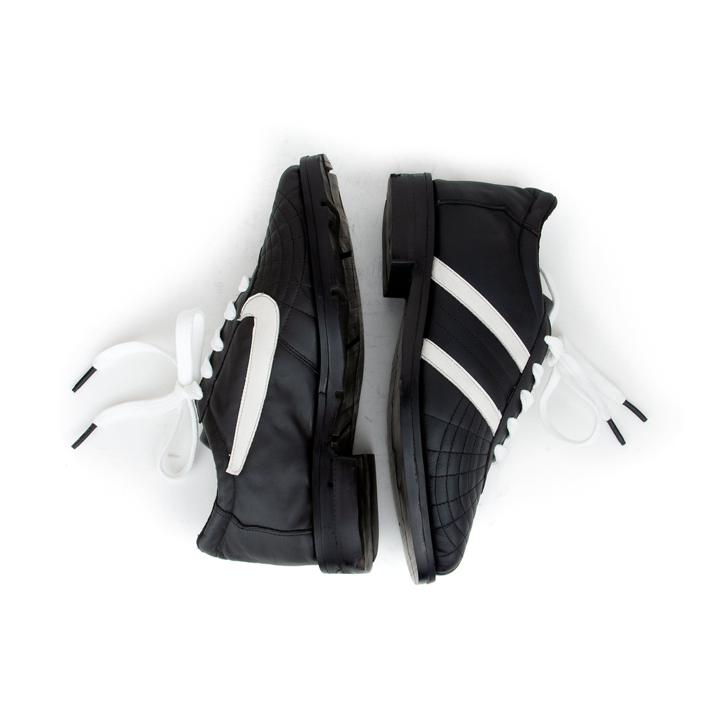 Upcycled leather. Upcycled tire rubber sole.