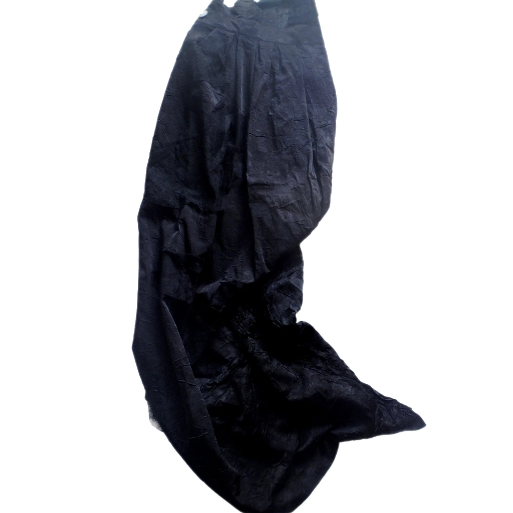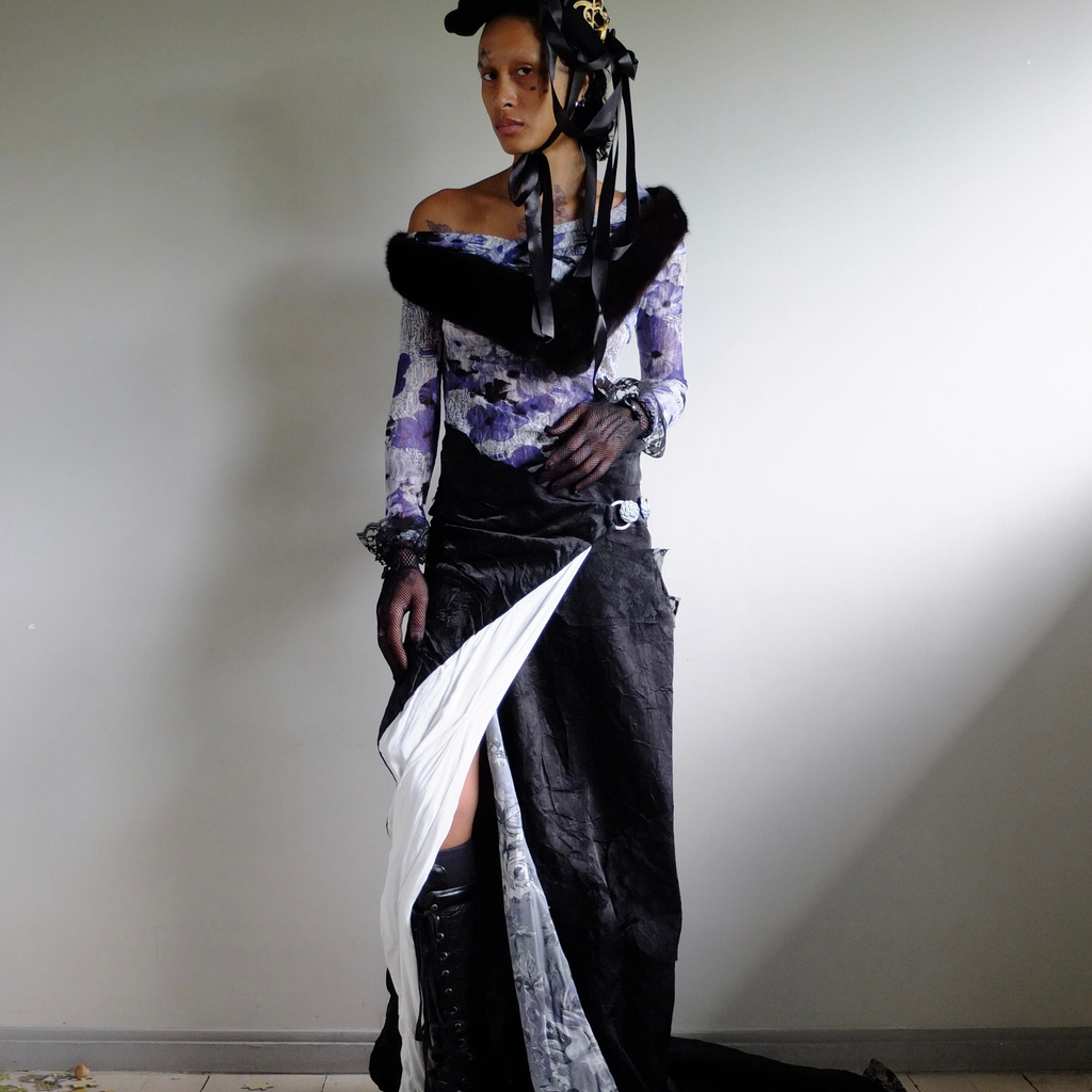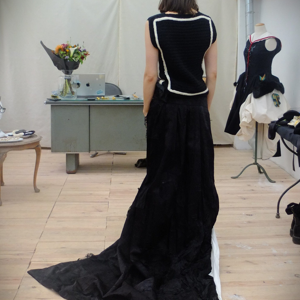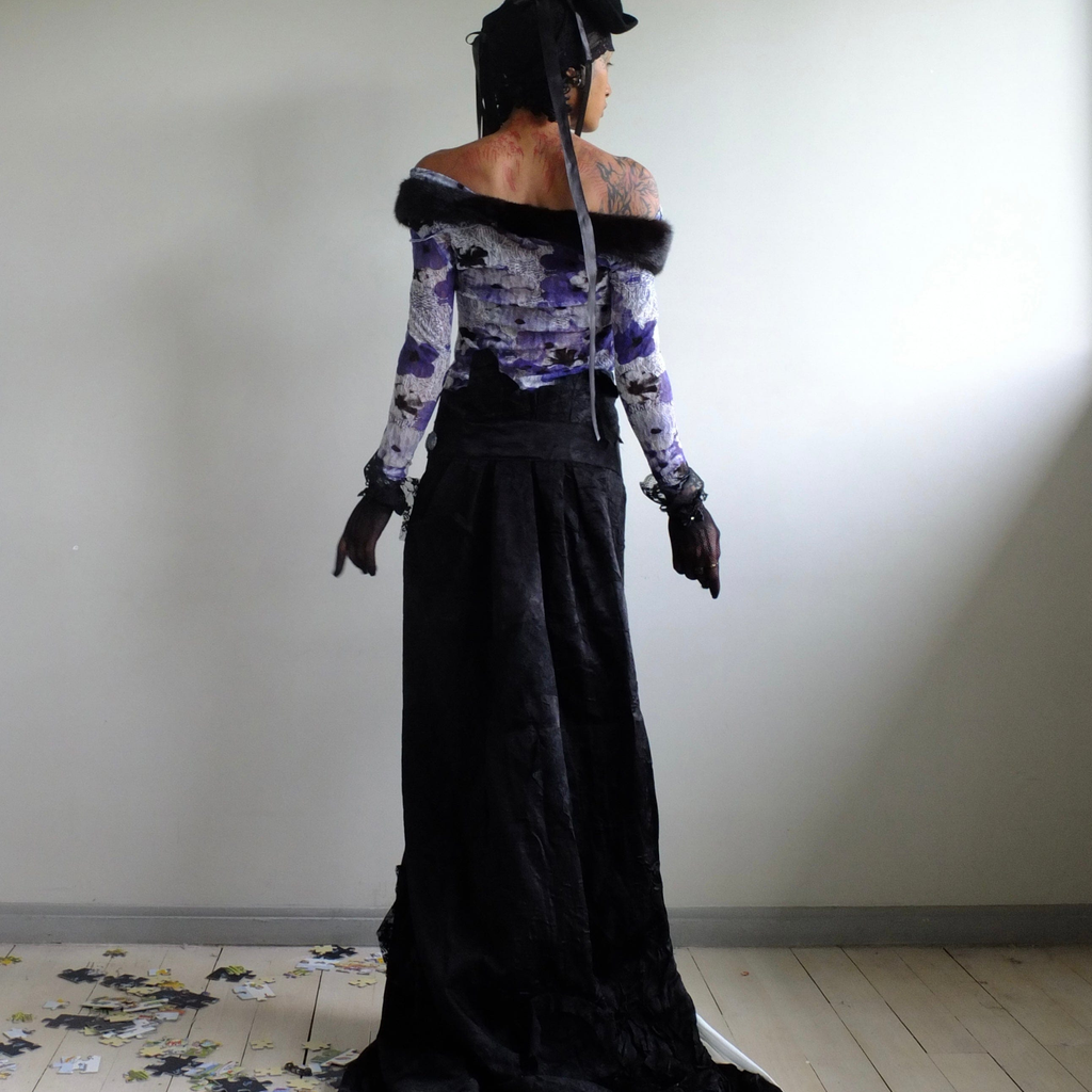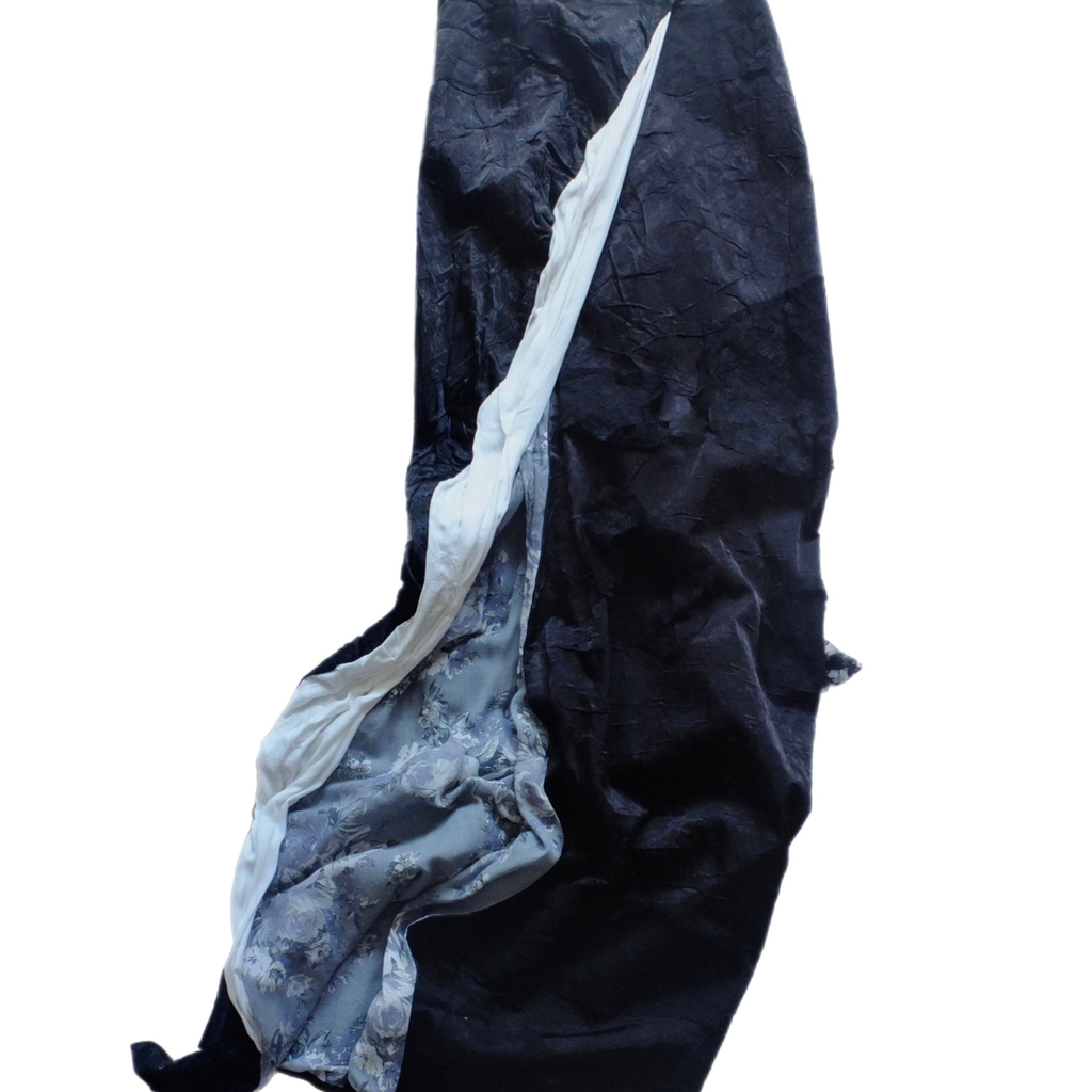 One-of-a-kind long wrapped train skirt made of found cotton amd satin fabric, with a floral wool-cotton blend lining and silky ivory details. Finished with lace appliqués and large vintage metallic buttons.