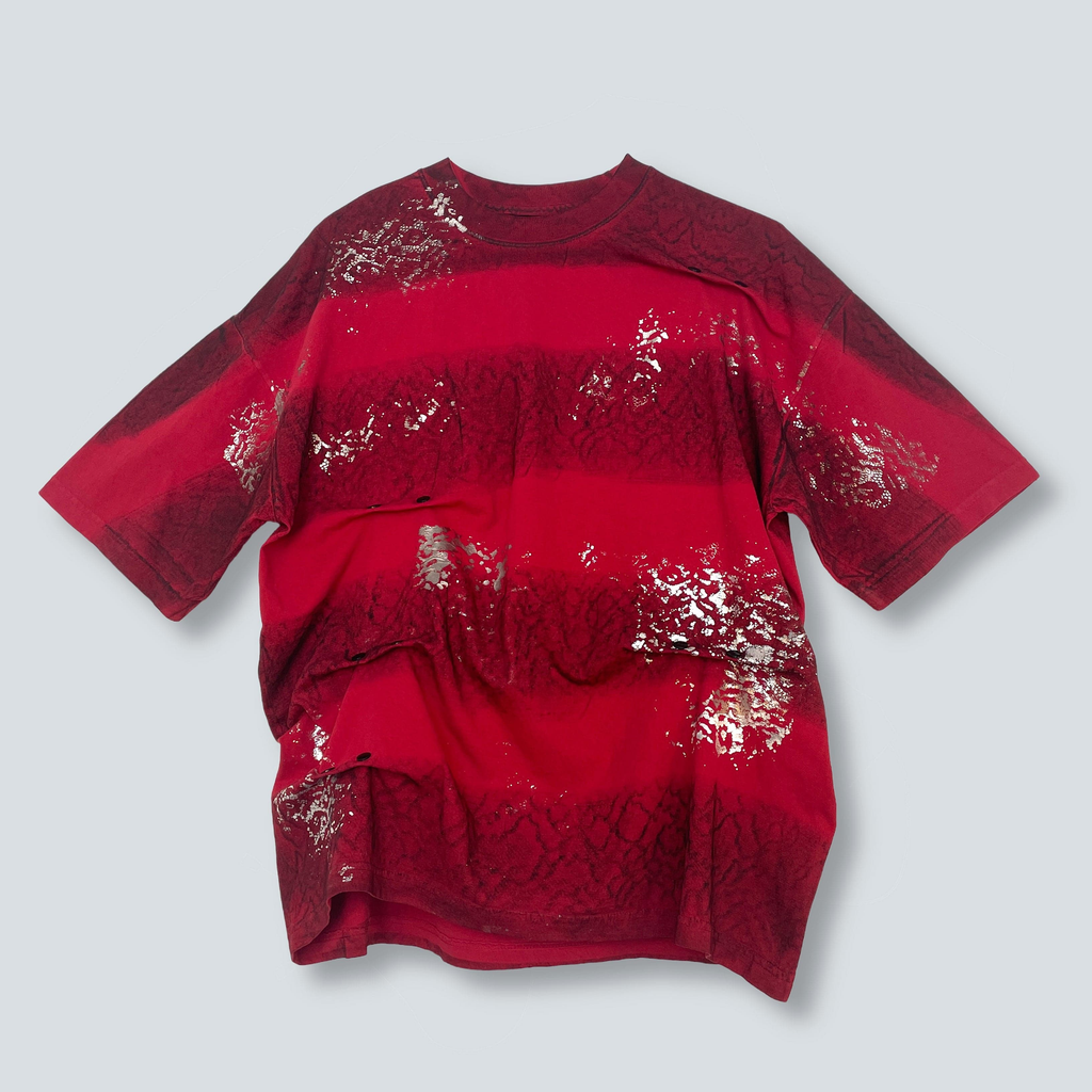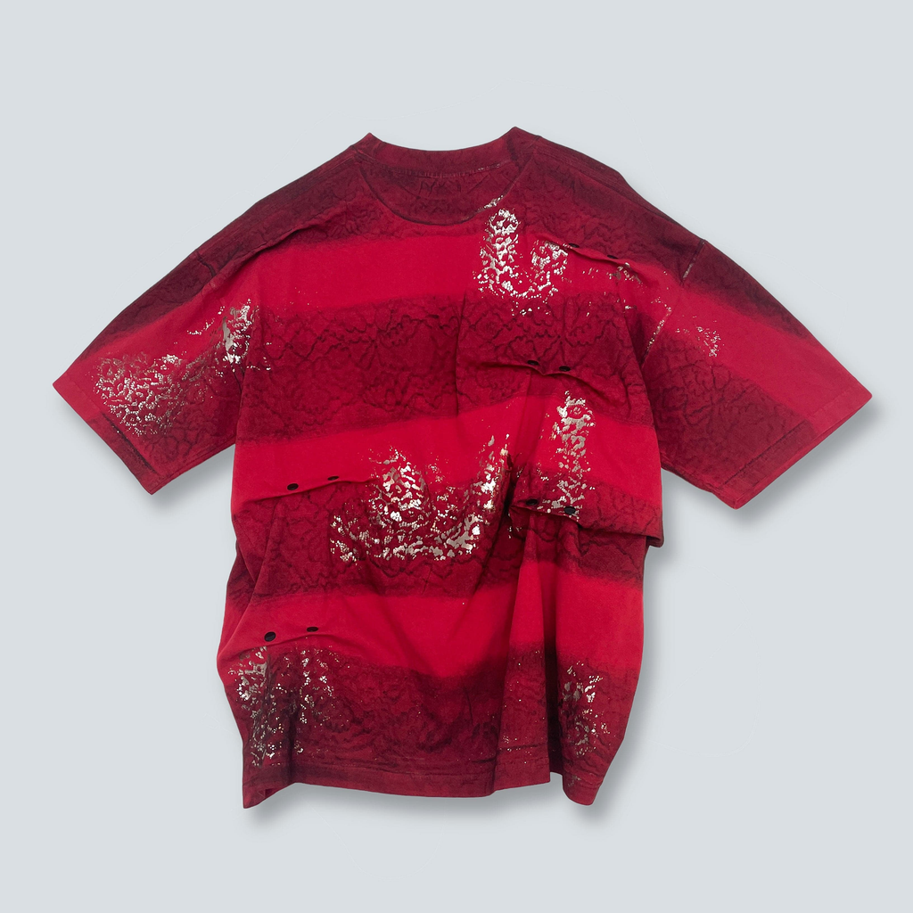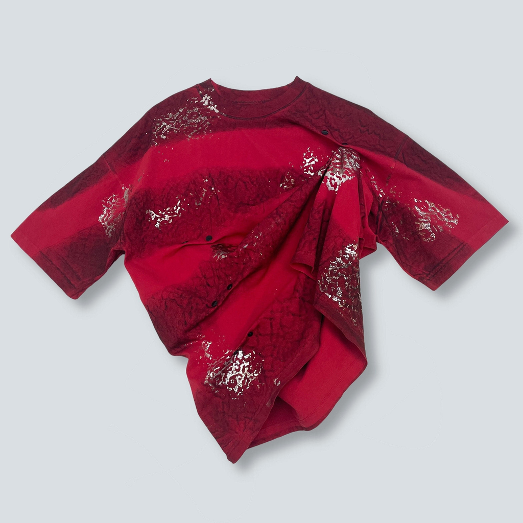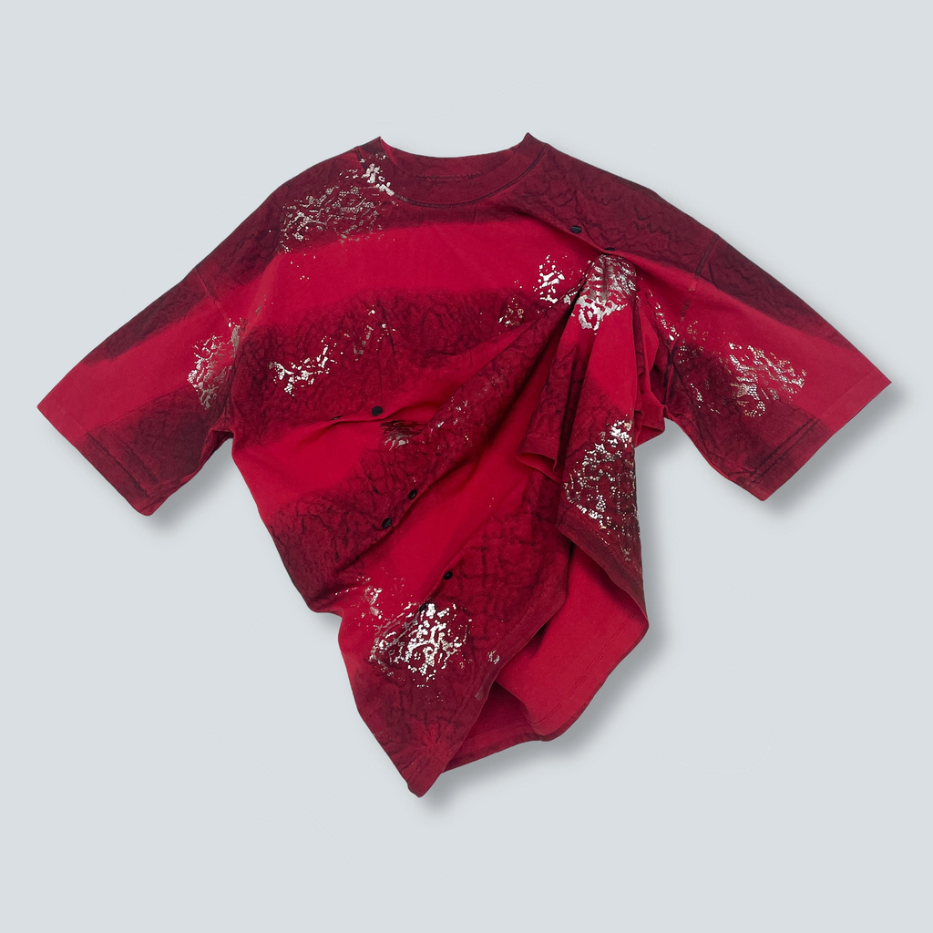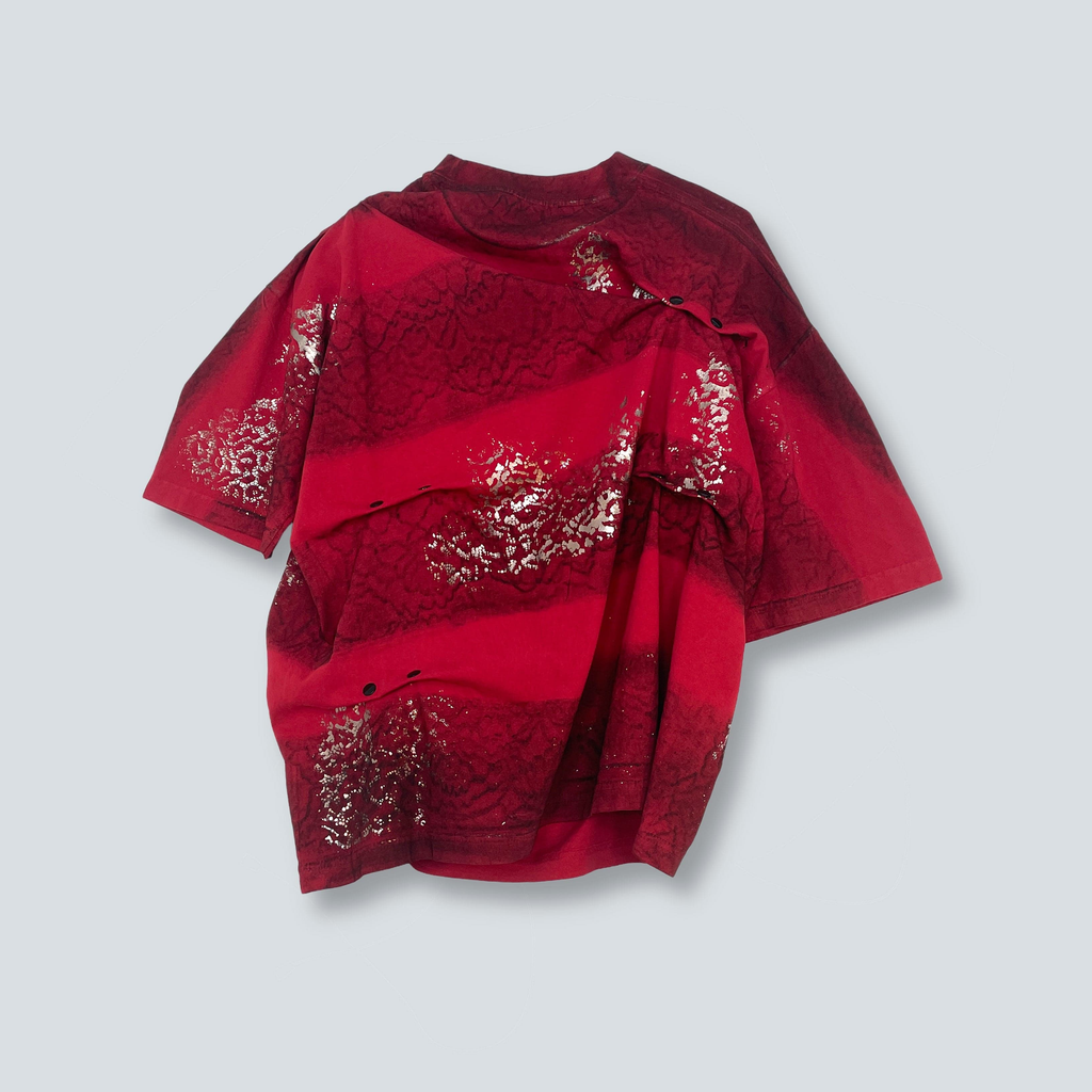 6oz Garment dyed t-shirt featuring hand painted lace and textile foiling with press stud tucks. Designed to be be worn in many different ways by pressing various studs together. You're encouraged to twist, pull, and morph it to express your unique energy.
