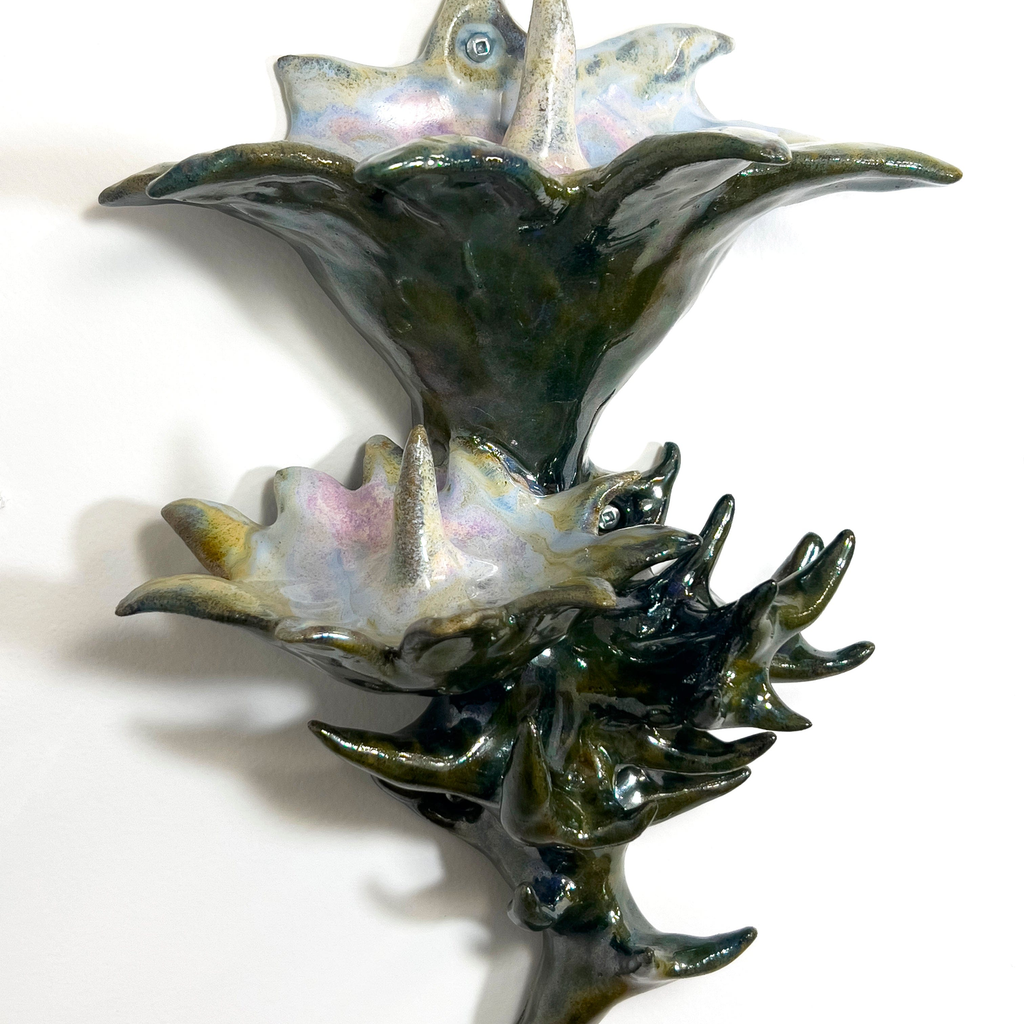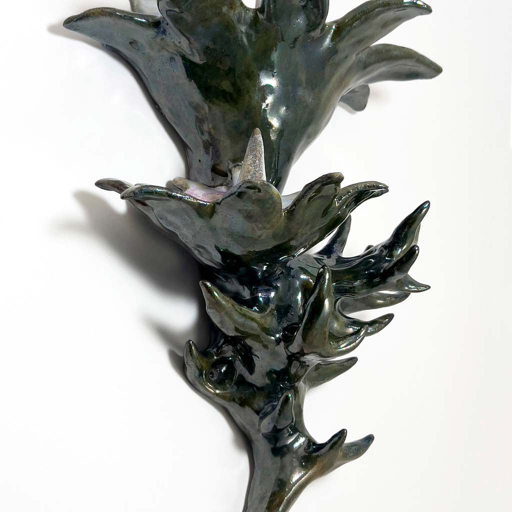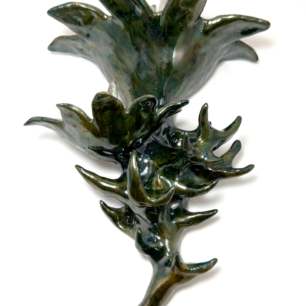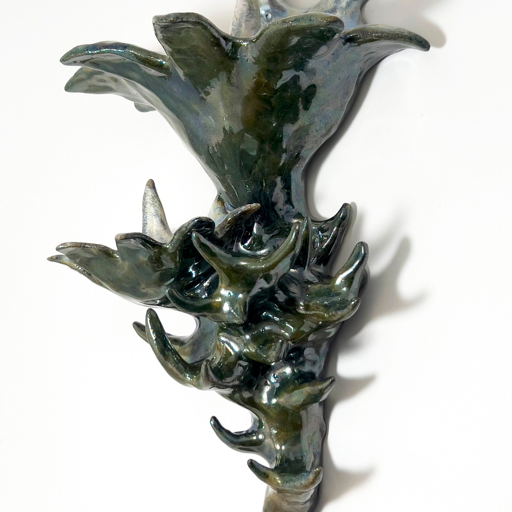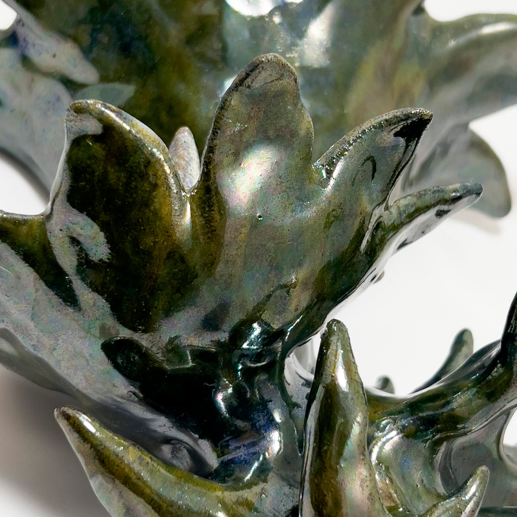 Hand-sculpted ceramic wall sculpture glazed in deep forest green with iridescent highlights. Designed as a functional art object to display your jewelry or enjoy on its own. Rings and earrings can be placed within each bloom, while necklaces and bracelets can hang from the leaves. Each Moss Opal Bloom is individually crafted to order; subtle variations in form and finish make every piece uniquely yours.