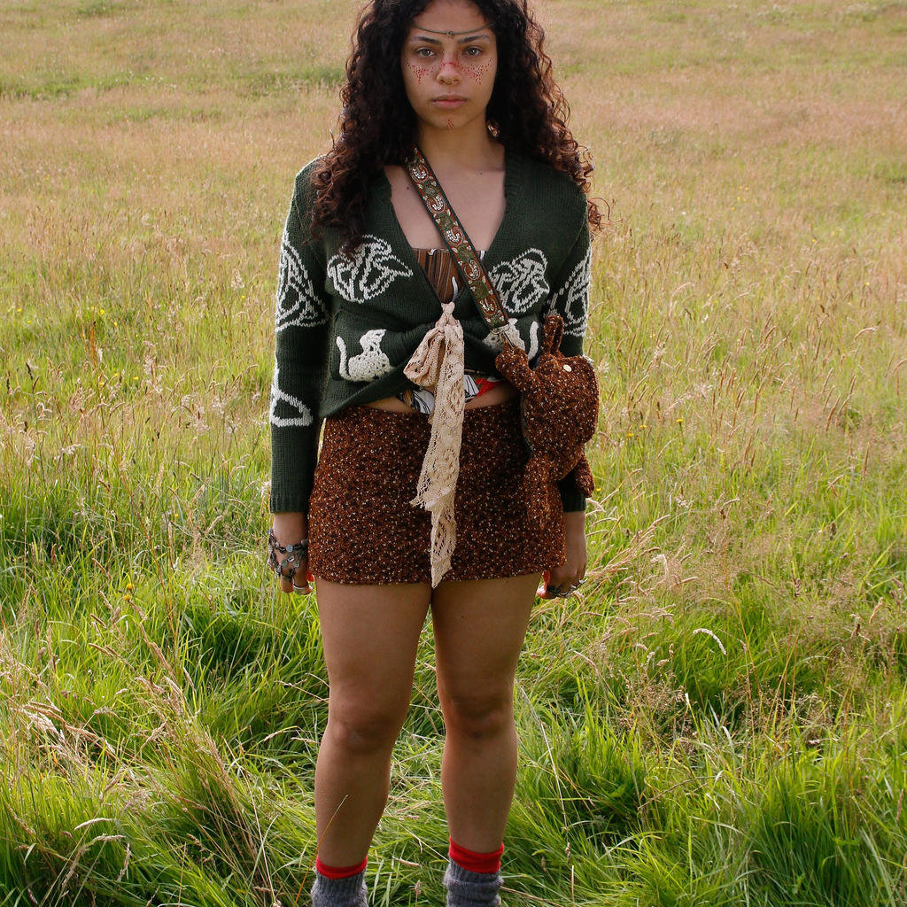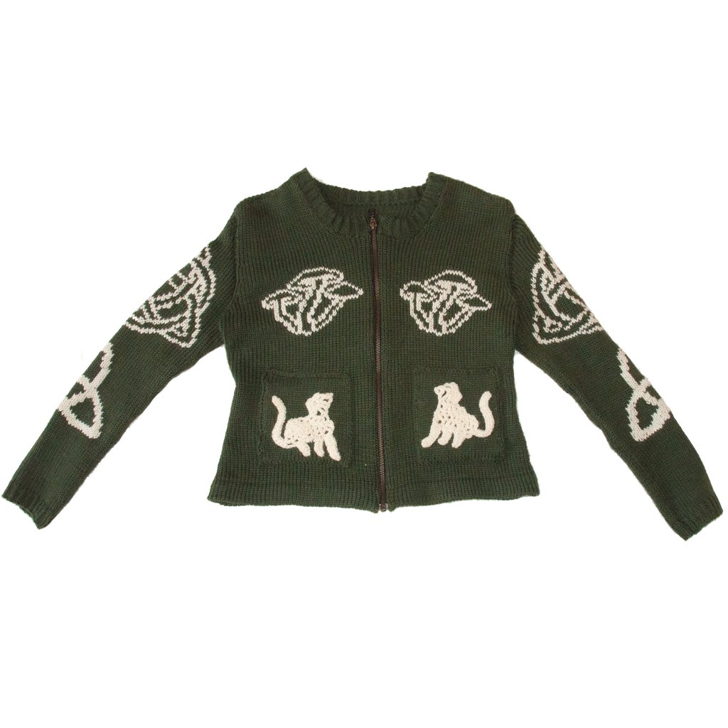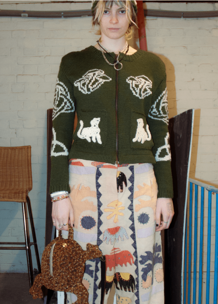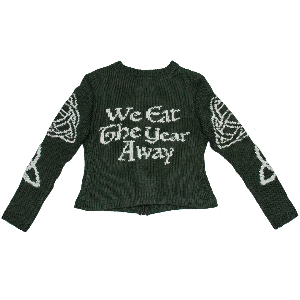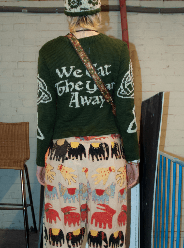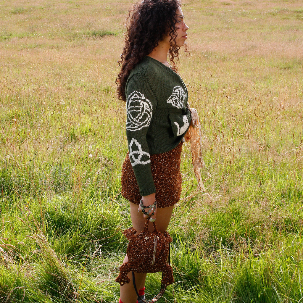 Made from 100% British super wash wool, the Mythic cardigan is knitted on our hand loom in Brighton. A zip-up form-fitting cardigan with hand-stitched embroidered runes and a Shirley Jackson quote.