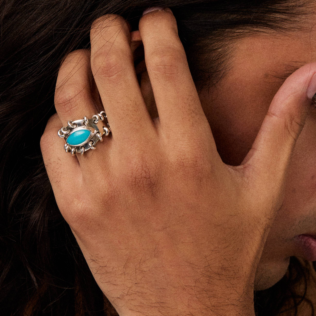 The thick sterling silver band is meticulously hand engraved with fine detail, creating a tactile experience that complements the bold structure. At its center, the bezel holds golden eye fabricated in brass, offering a striking contrast to the silver and enhancing the mystical energy of the "nazar" motif.