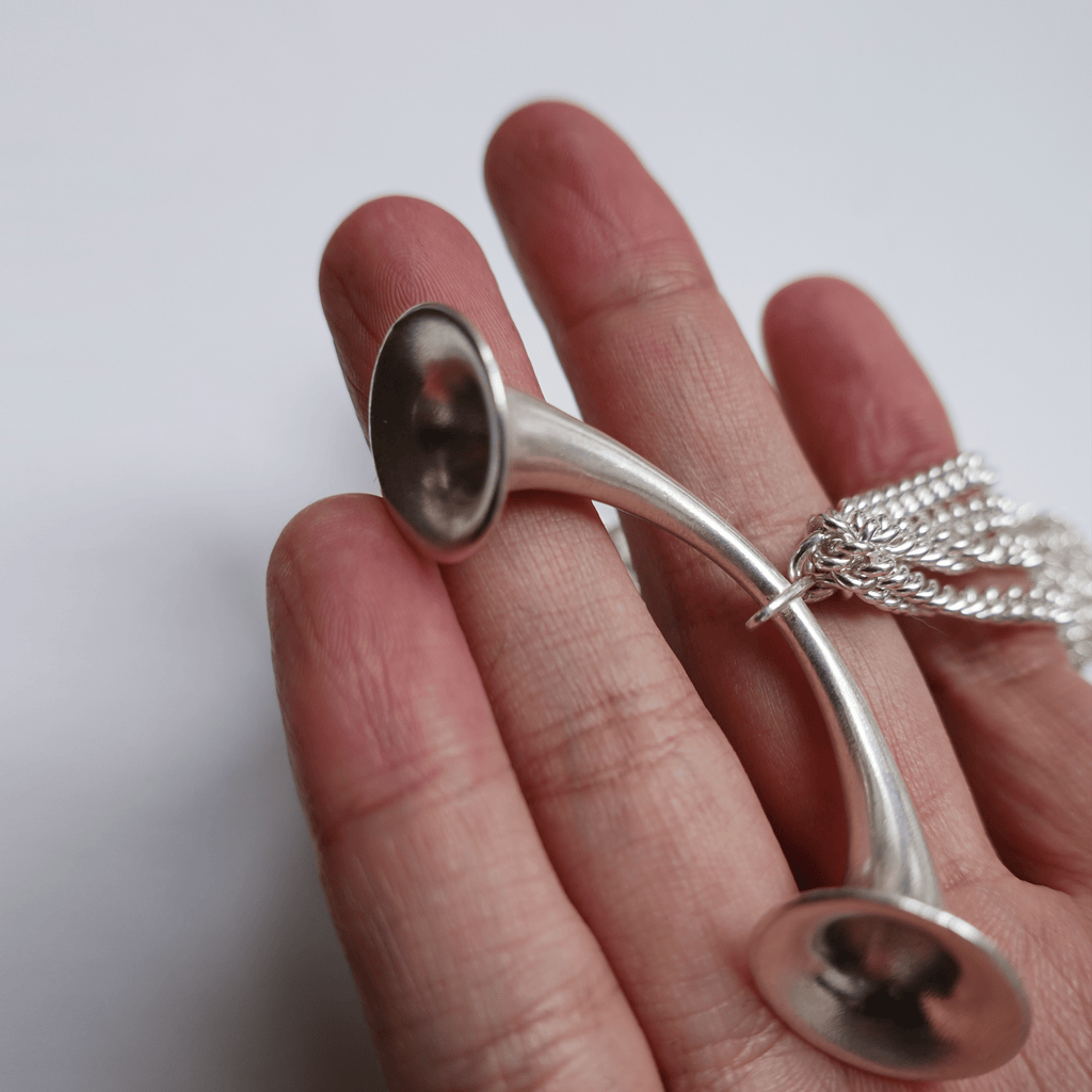 A unique shape of double trumpet in burnt white effect, could be also doubled and worn as a bracelet.