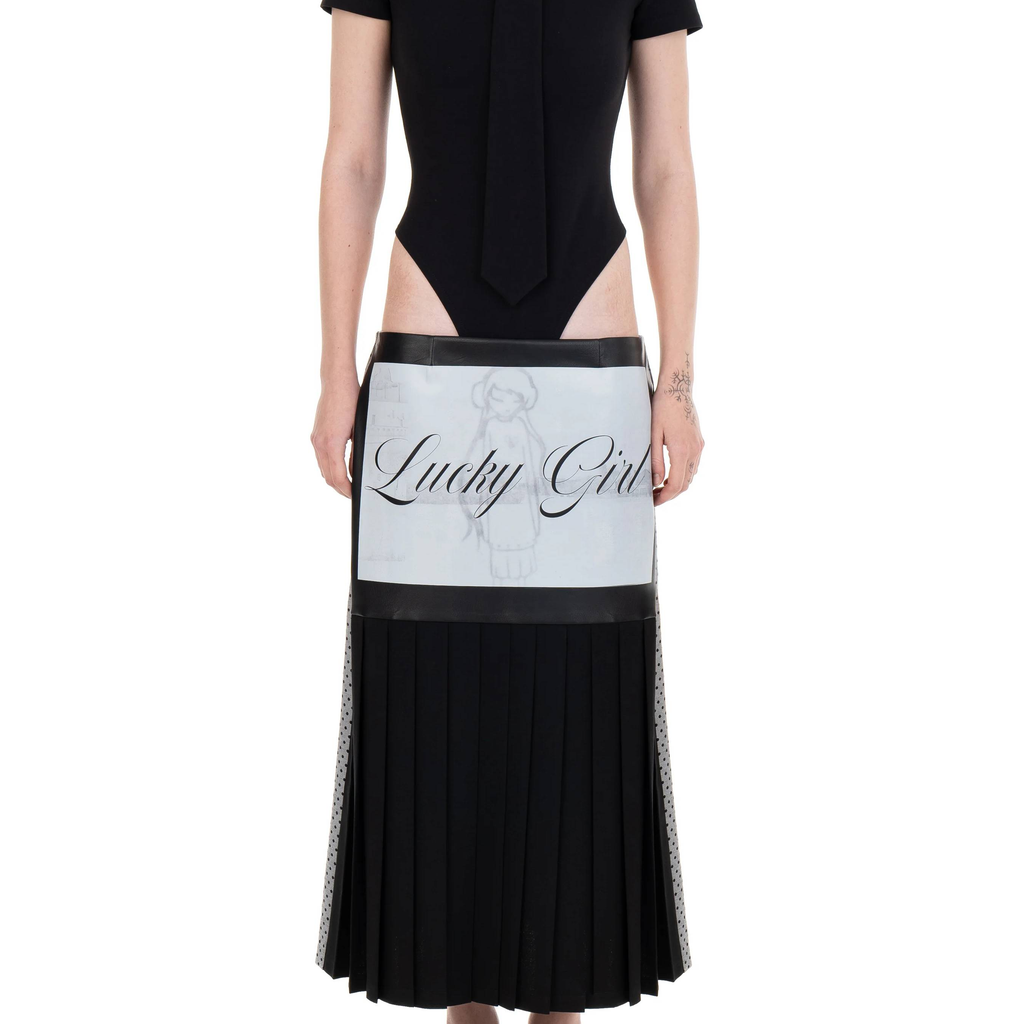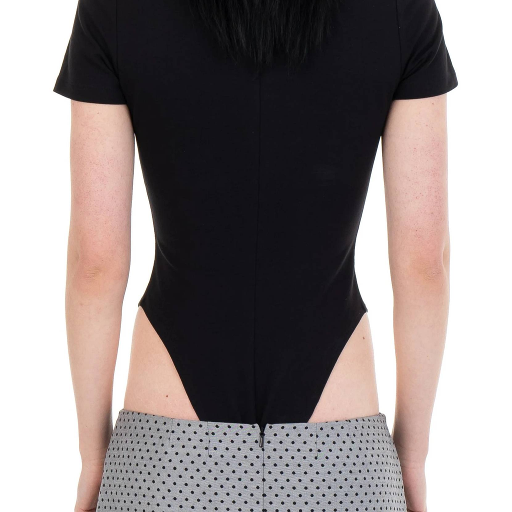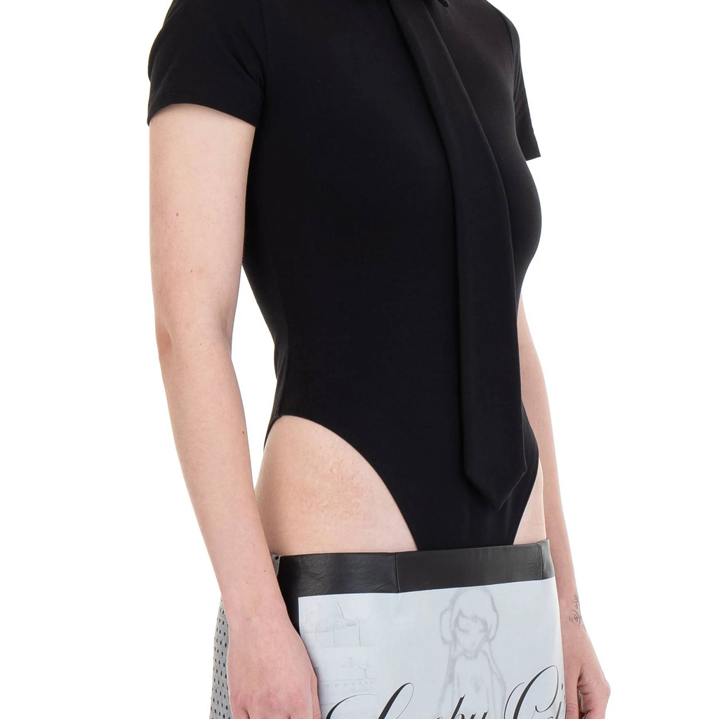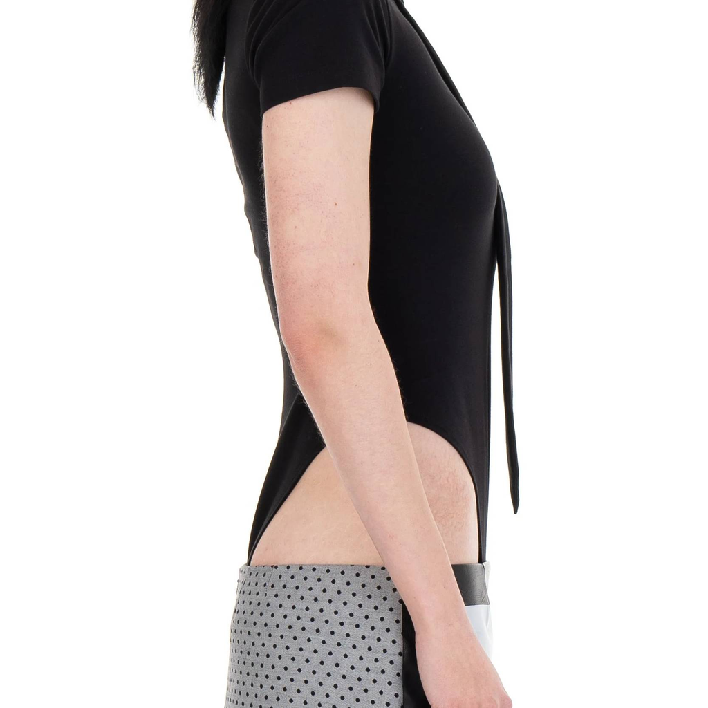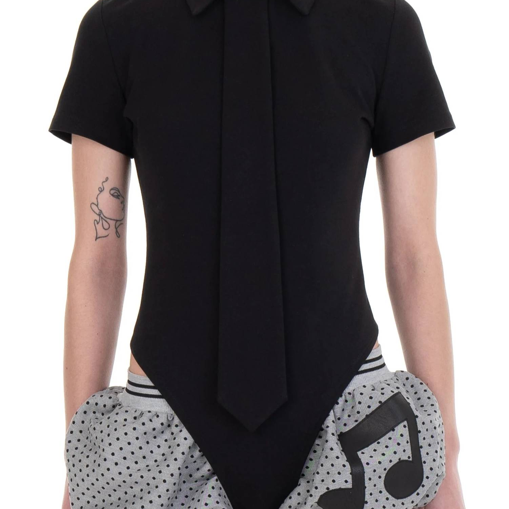 Short sleeved, cotton bodysuit featuring a necktie design. Snap fastening at front and bottom.
