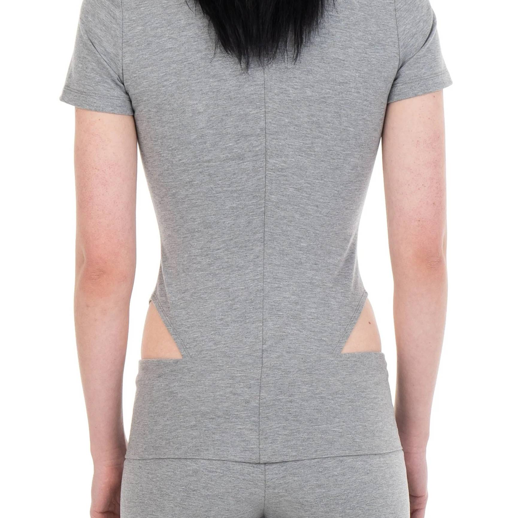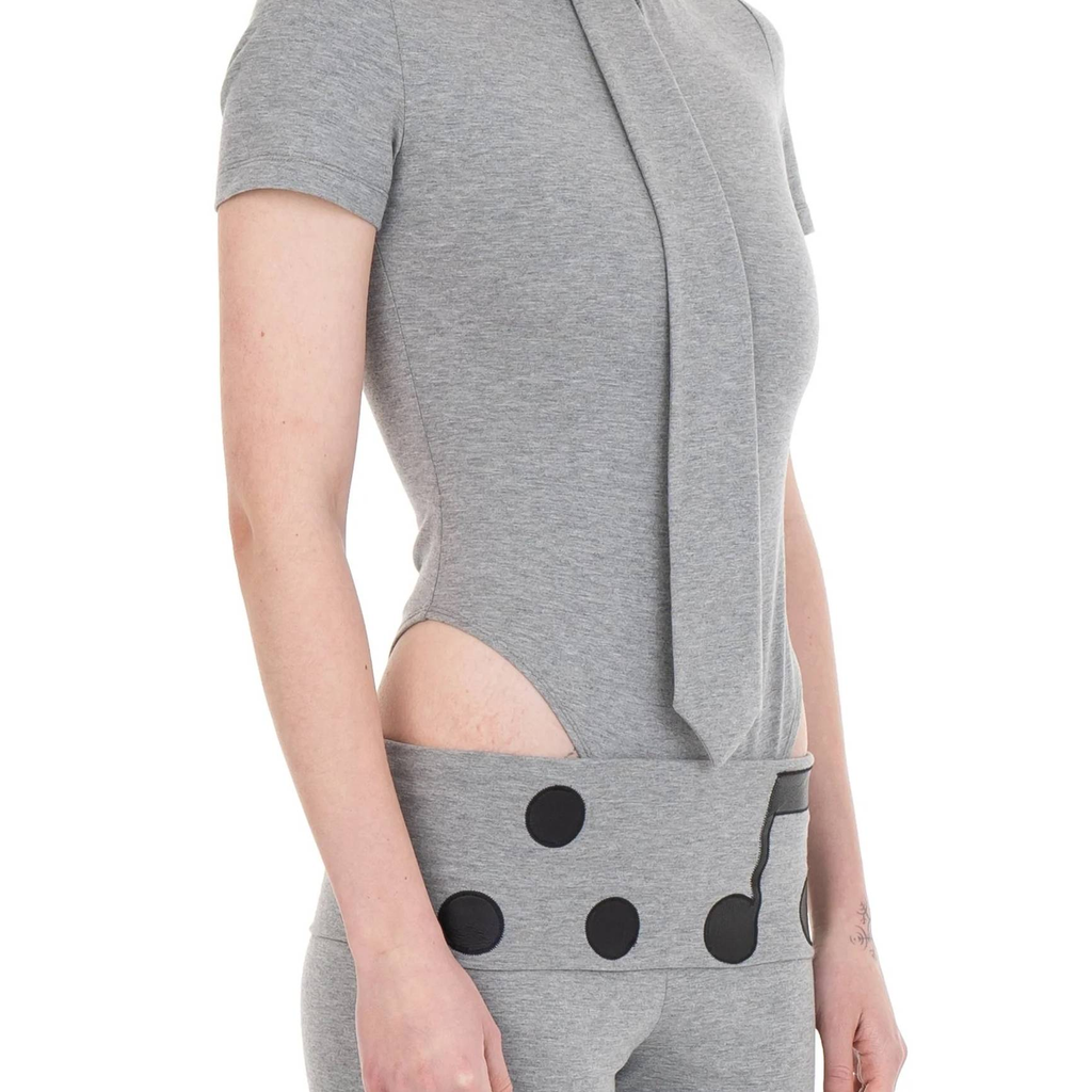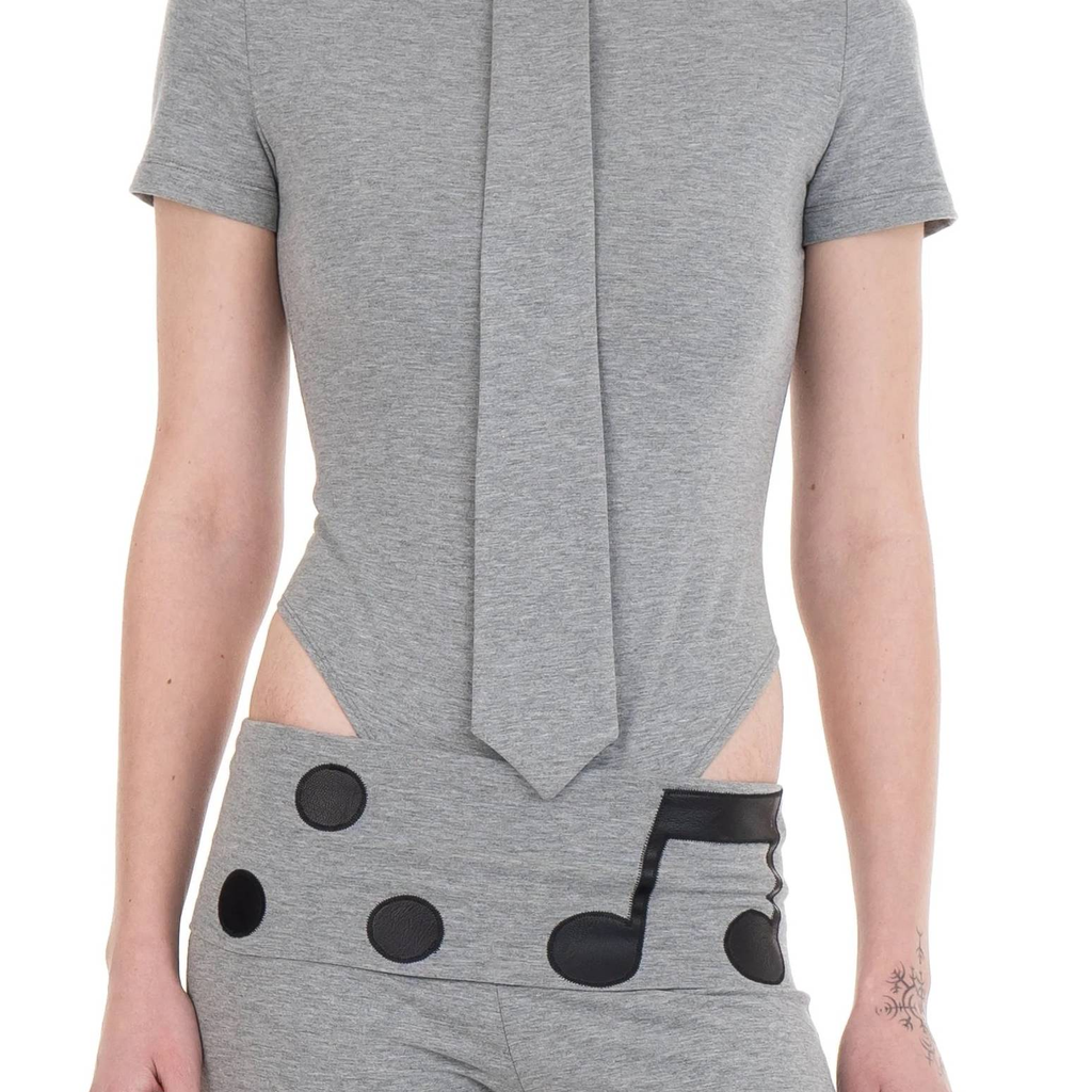 Short sleeved, cotton bodysuit featuring a necktie design. Snap fastening at front and bottom.