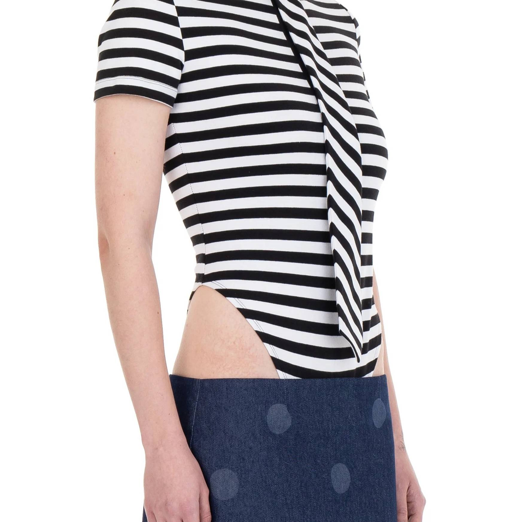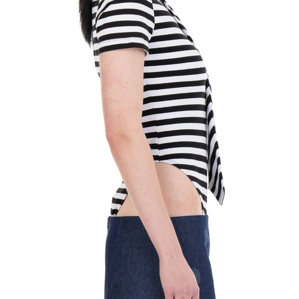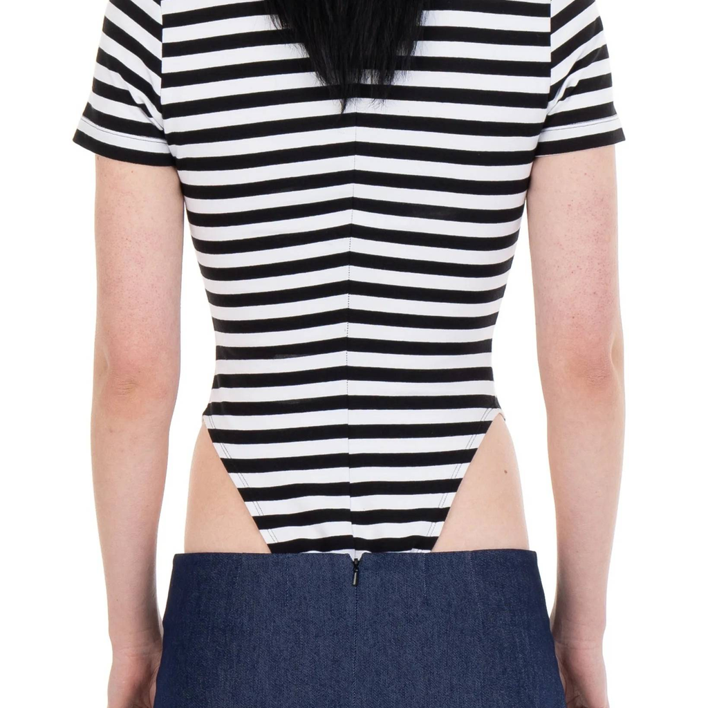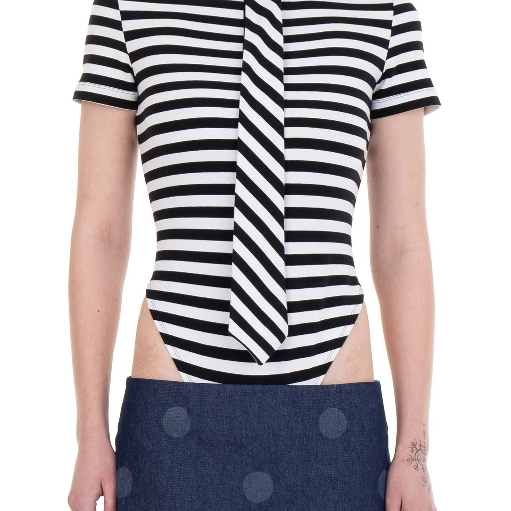 Short sleeved, cotton bodysuit featuring a necktie design. Snap fastening at front and bottom.