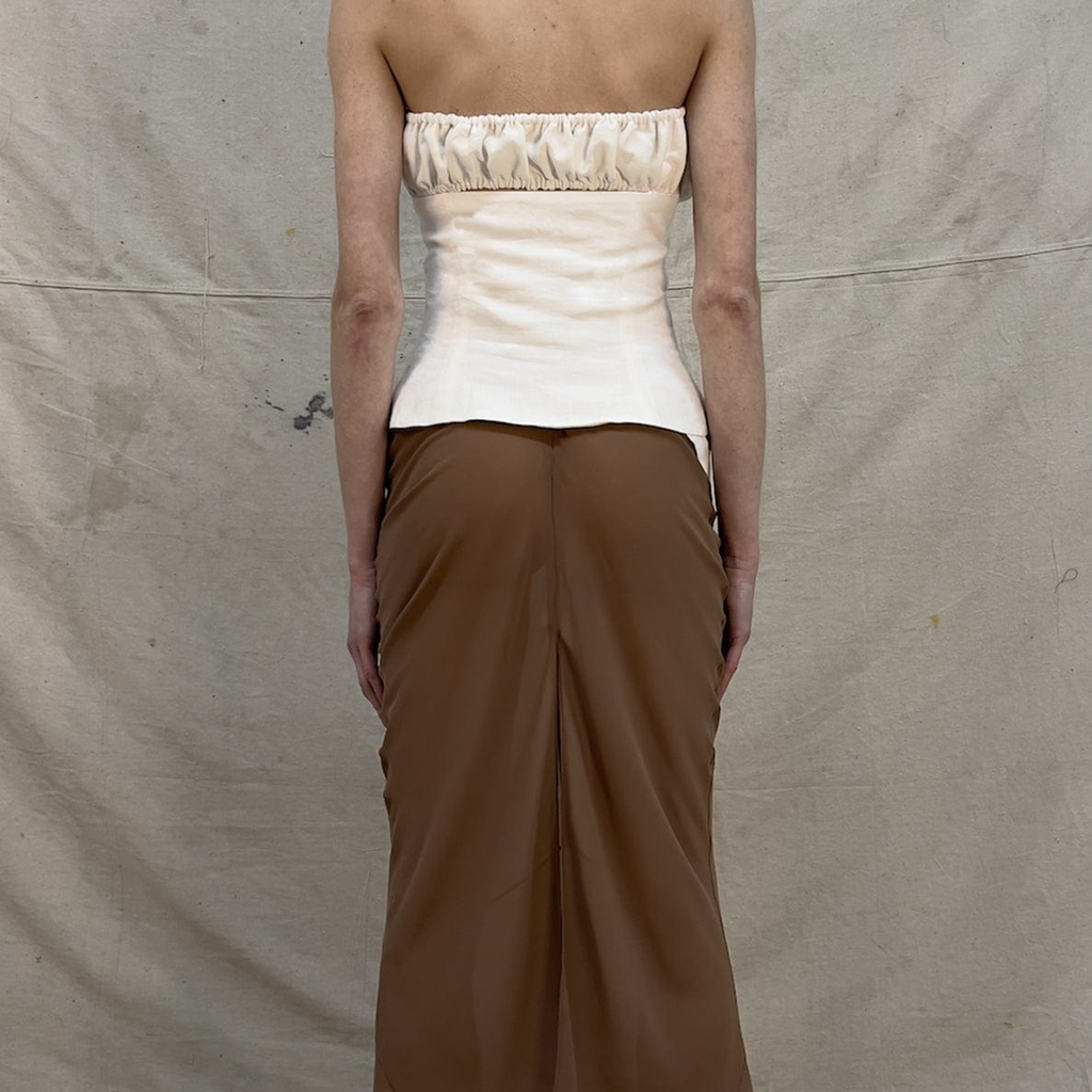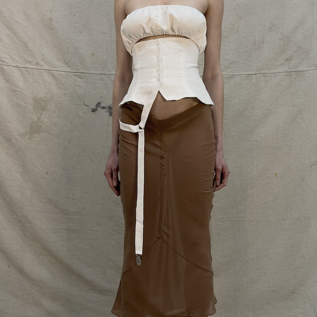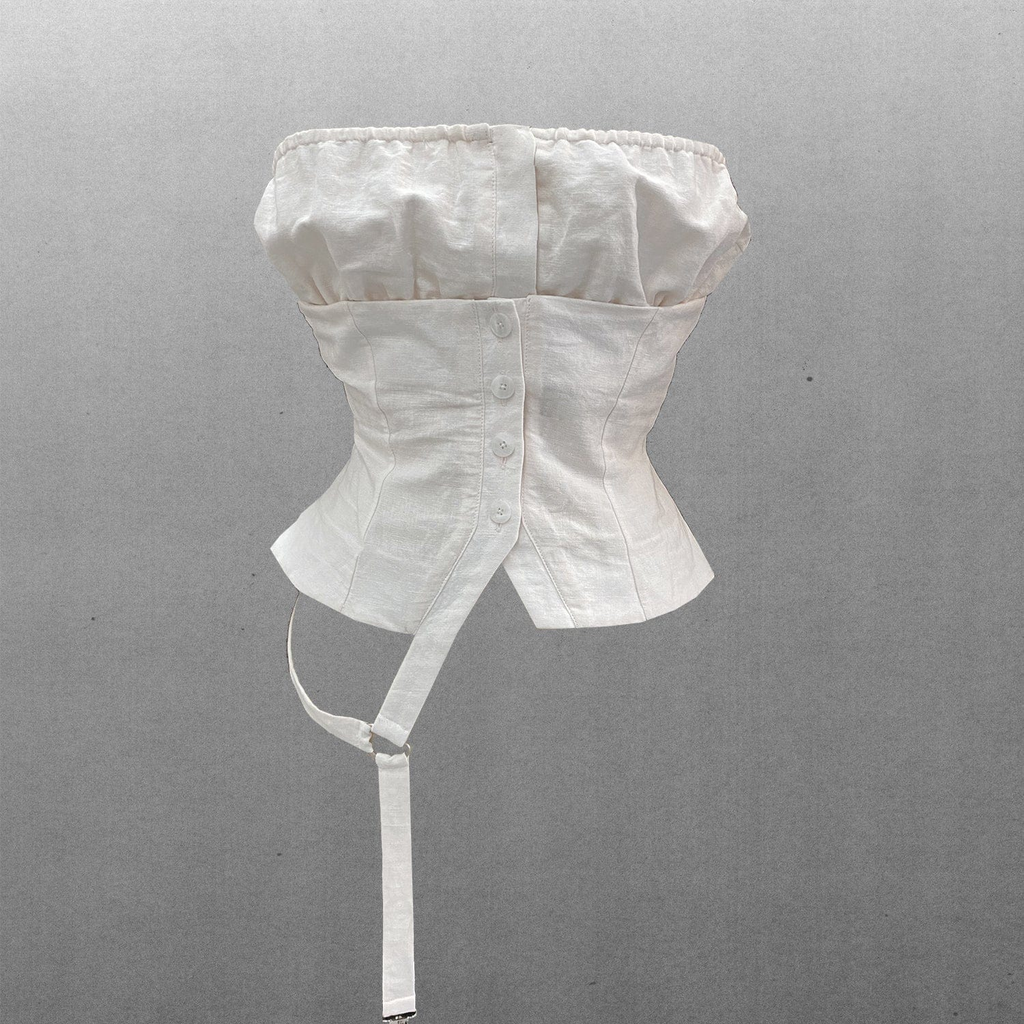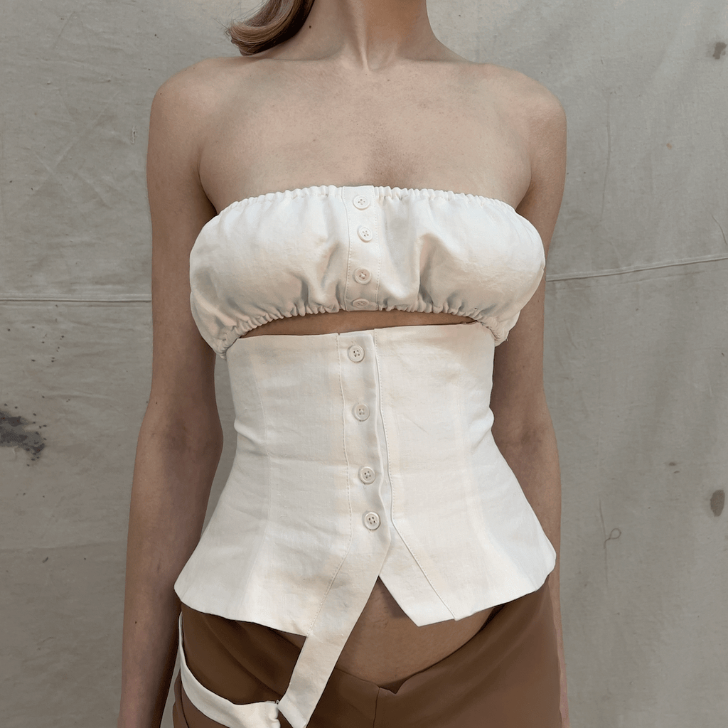 Cut in cotton linen, in color bleach. The top is stabilized, self-lined and features a detachable nested bandeau with center front placketed button closure. The bind dips into a holstered hip band, ending in a functional, custom garter clasp.