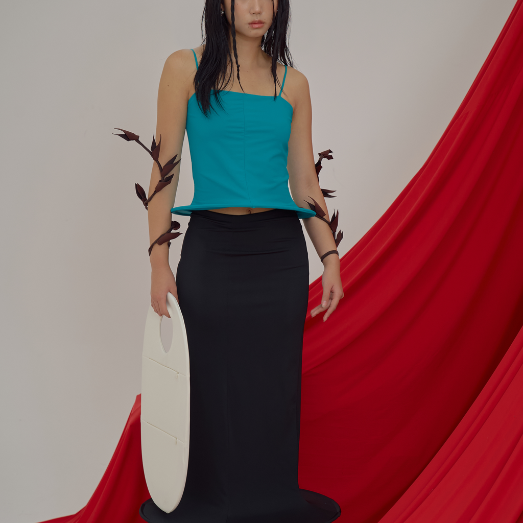 NOINA tube top in Teal. Stretch nylon jersey fabric. Spaghetti straps. Steel wire inserted at the hem.