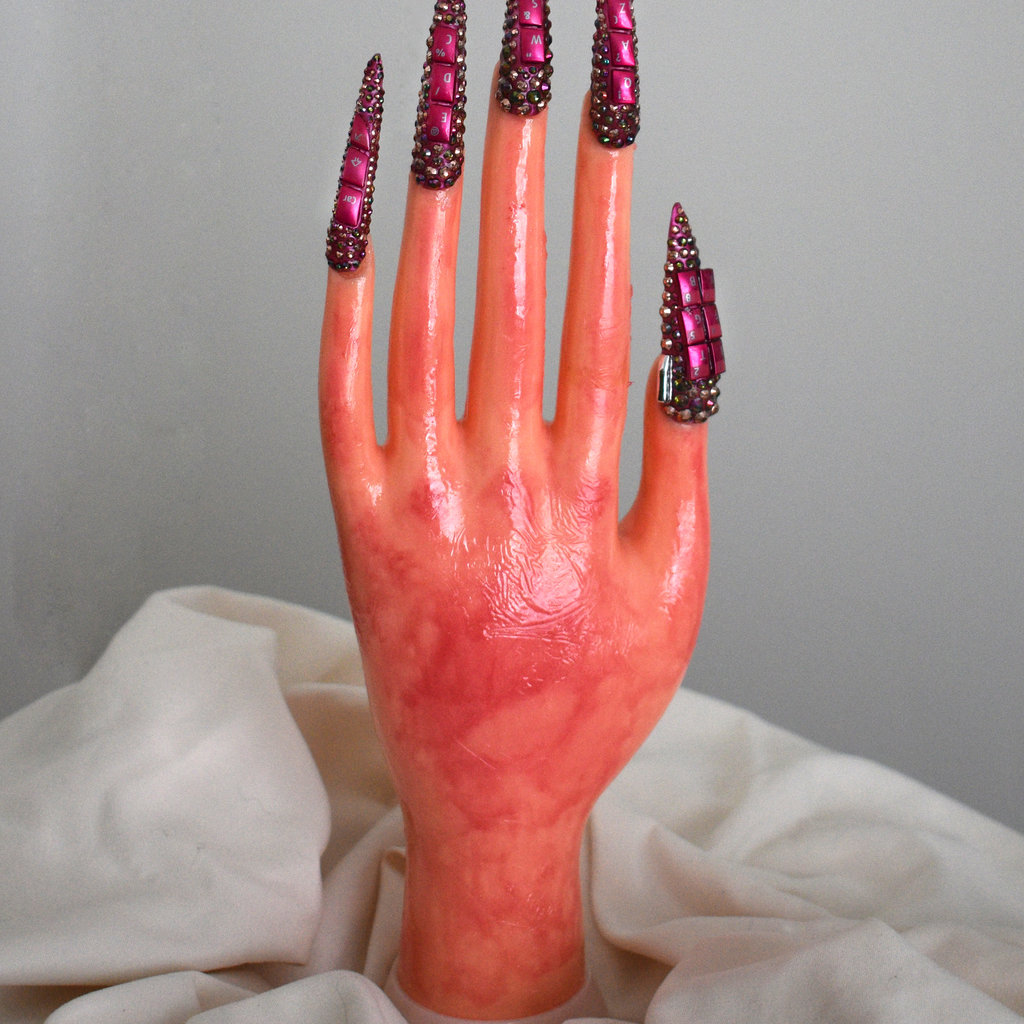 Hotnails666420 is an art installation, nail studio based in Montreal, Quebec seeking to explore themes of technology and the body through the social history of nail art. Hotnails666420 is creating nail sets using locally sourced deadstock objects and electronic components as well as hand painted and encapsulated designs. Most nail sets are 1/1 and will not be restocked.
