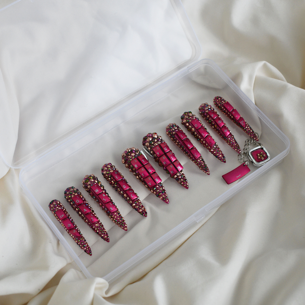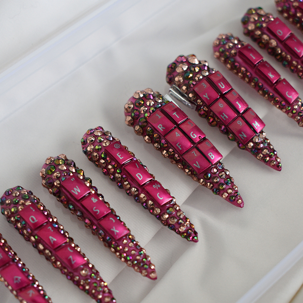 Set of 10 high quality, reusable xxxl press on nails with 450 individually placed crystal gems and full QWERTY keyboard from a deconstructed 2010 Nokia C3 cellphone. Includes detachable cell phone charm.