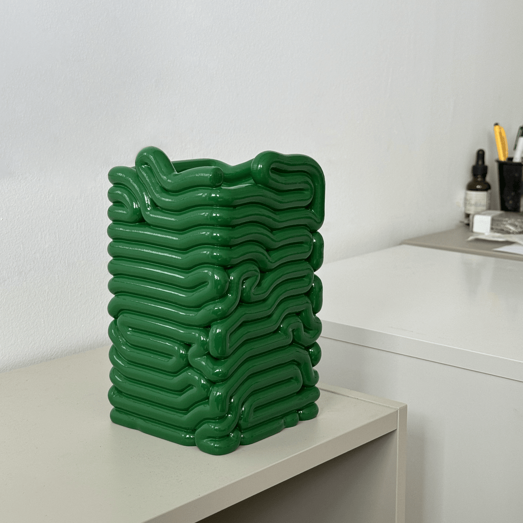 In addition to their predominantly on-screen design practice, Gast Studio now brings a fresh perspective to pottery — by blending traditional craftsmanship with digital innovation. Their unique series of vases is the result of a playful and ongoing exploration of CGI's material qualities, combined with the dynamic tension between manual and automated crafts. These vases are more than just decorative objects; they invite us to reflect on the ever-evolving connection between art and technology, where the lines between the physical and virtual realms of our times are beautifully blurred.
