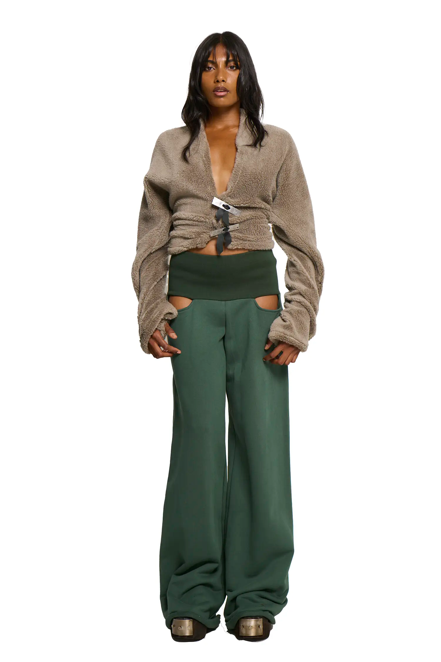 Ribbed waistband. Two front holes (no pocket) Wide leg. Pants come as 36” can be cut to preferred inseam length.