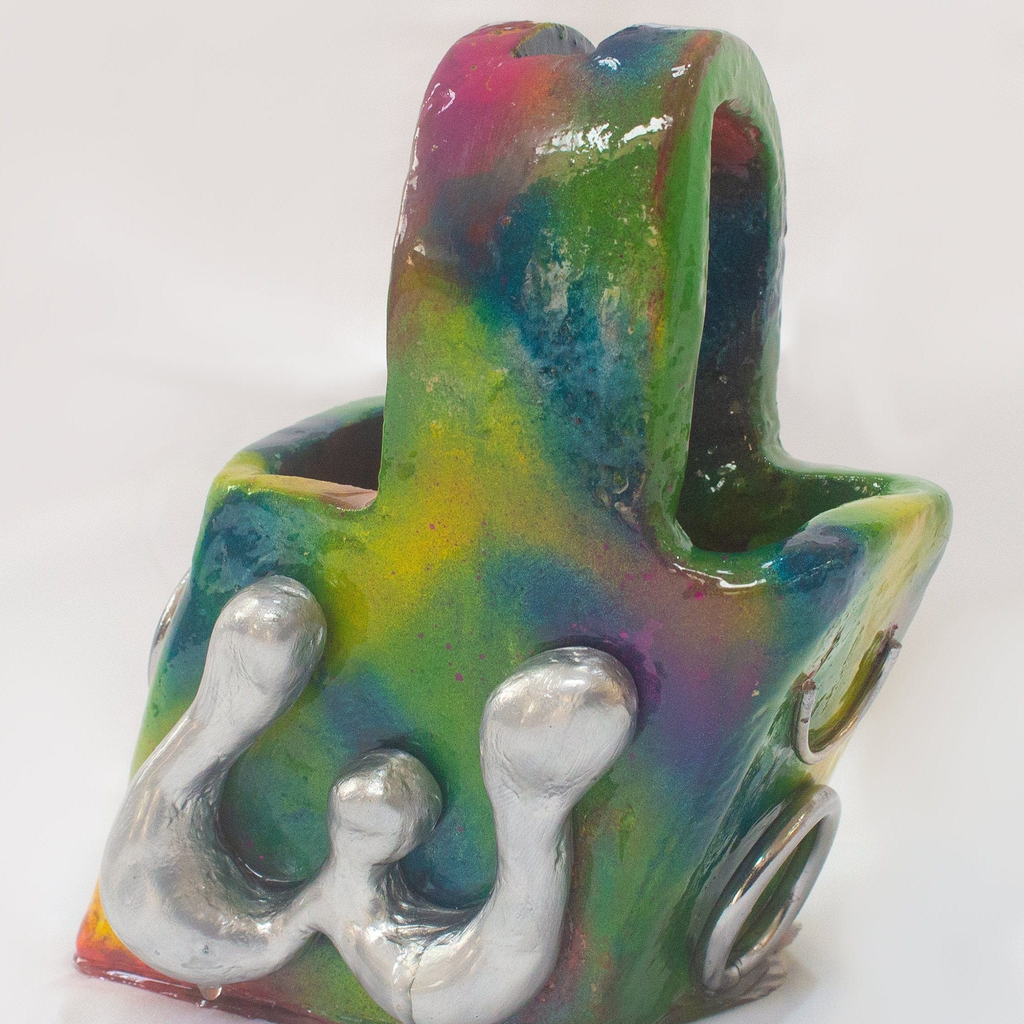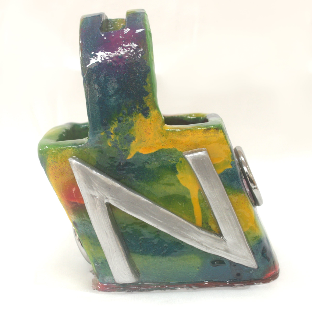 Multicolored ceramic piece in the shape of a bag, with silver chrome letters N & W on each side.