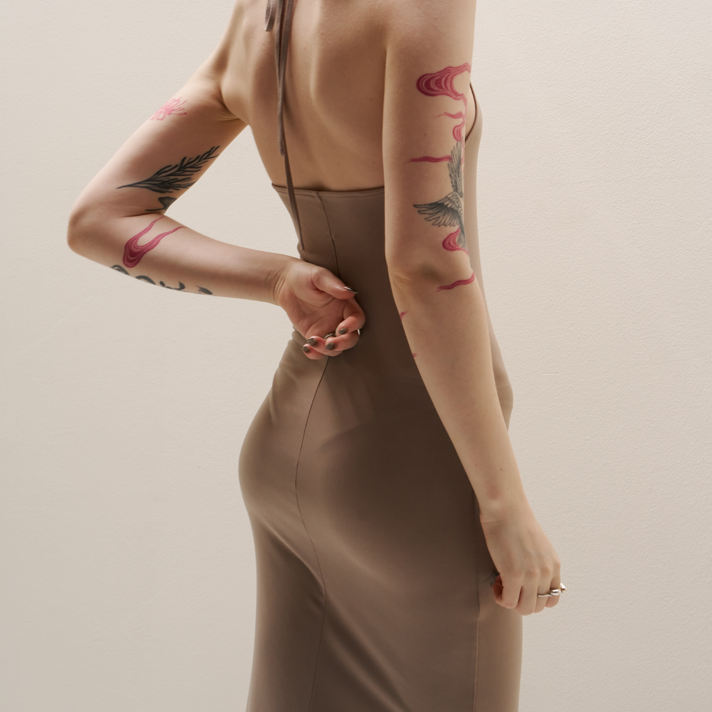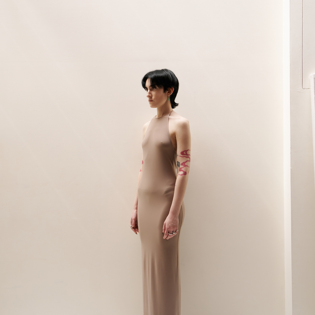Nude Skinny Apron Maxi Dress by arc us arkus.