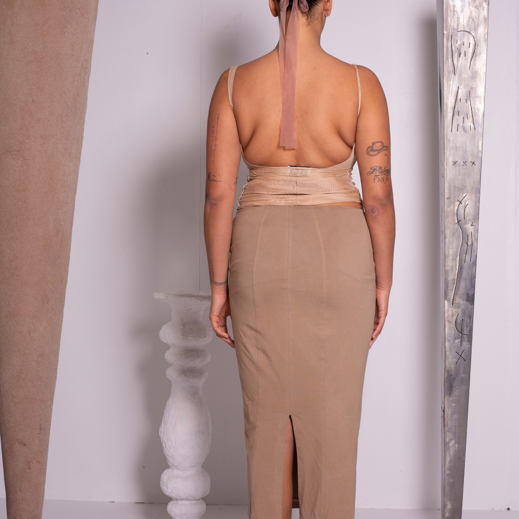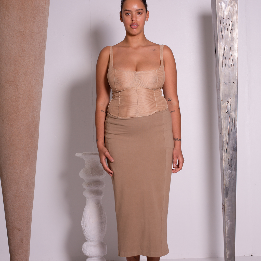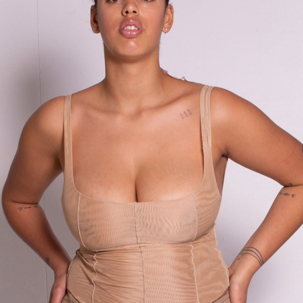 Panelled tank top made to fit like a corset while giving the comfort of a t-shirt. Top is made of 100% Polyamide Jersey. Offers proper chest support with an empire seam waist. Fabrics used are all remnants of jerseys from the 90s adding a rare soft feel to the dress.