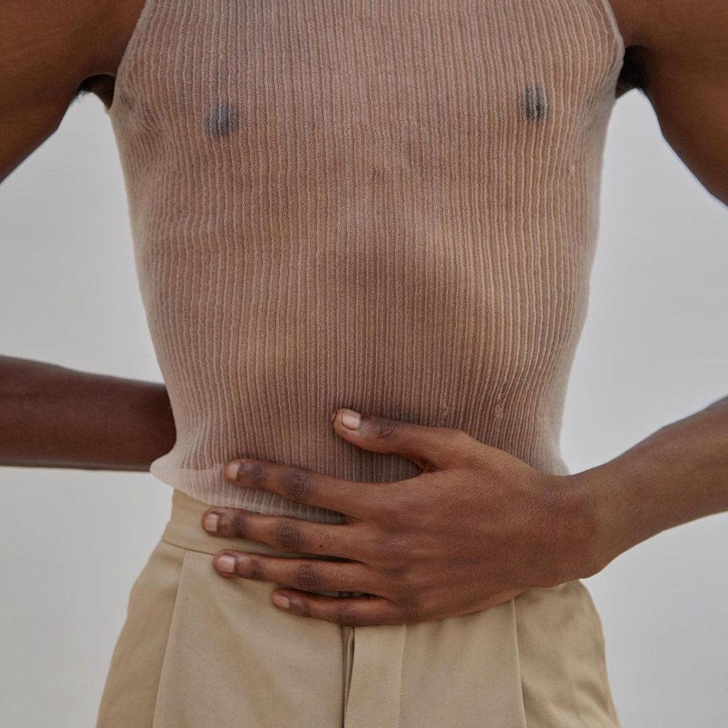 Nude pleated monofilament tank top. The pleats allow the knit to adapt to different body shapes and stretches.