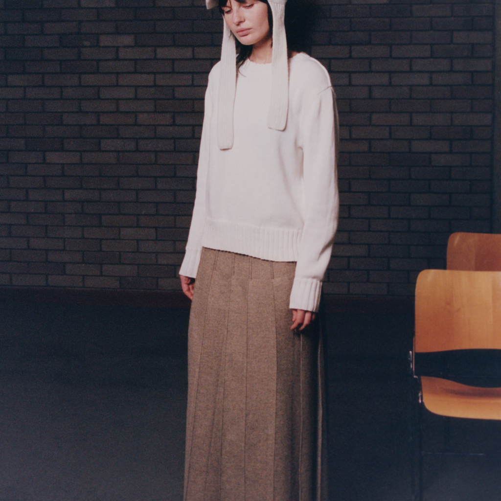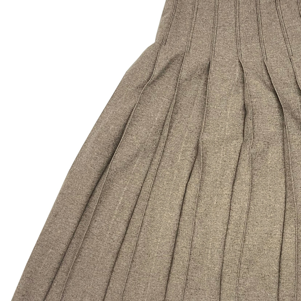 Oatmeal ankle-length skirt with high-waist and knife pleats.