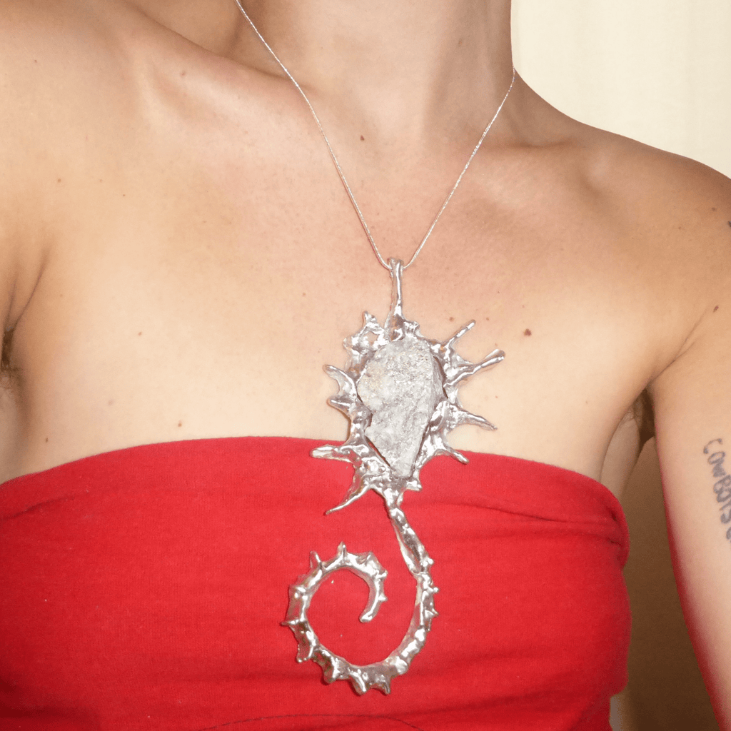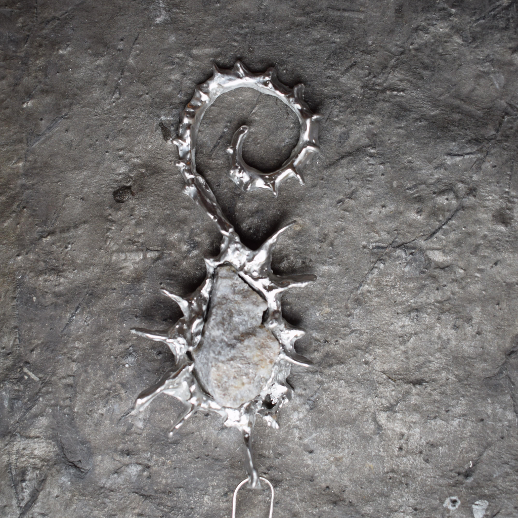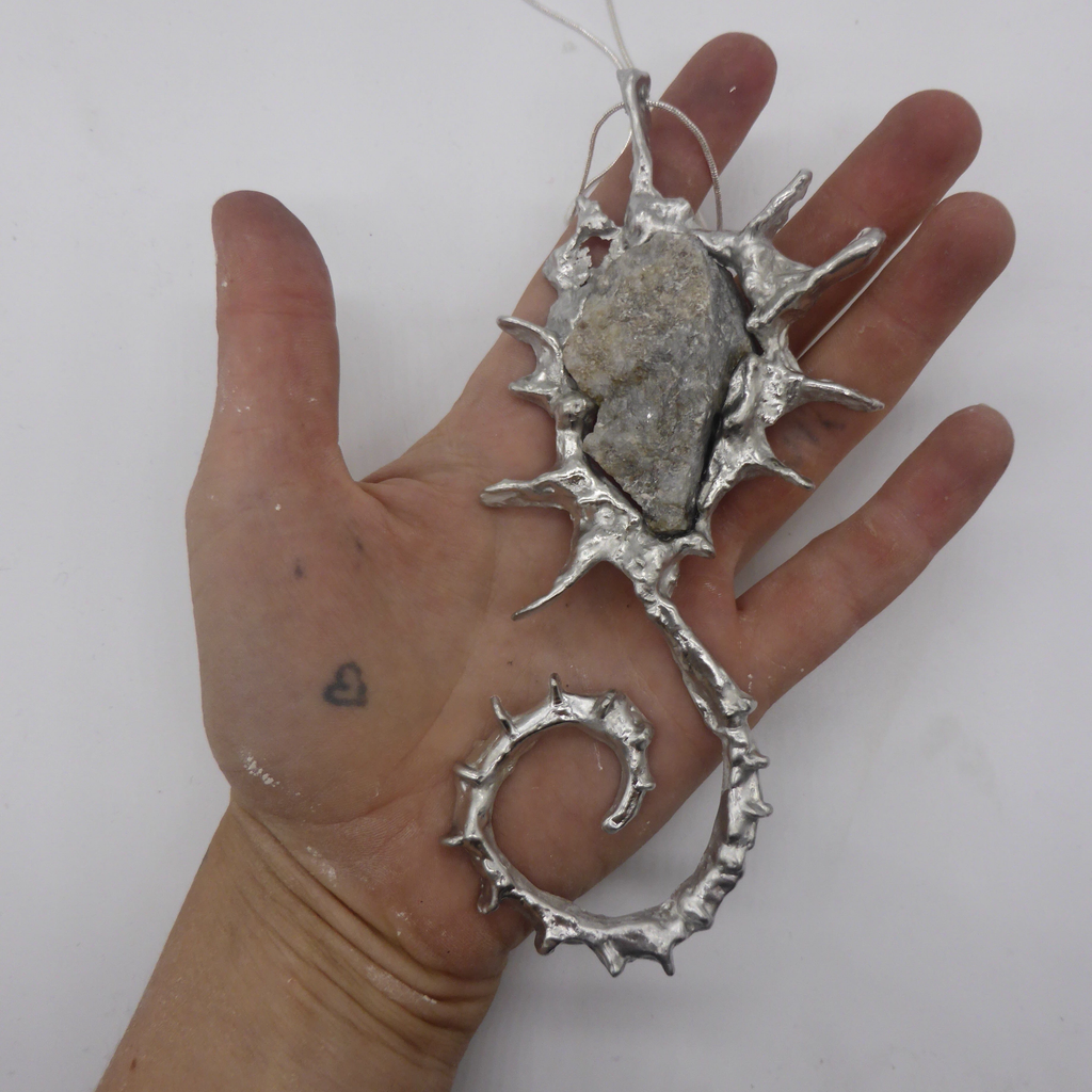 Anniken started making jewellery from stones and crystals in 2021. The materials were collected from when she travelled in a van through Europe. A casual interest in metals and minerals was the impetus for the jewellery making. Casting organically came about through curiosity, trial, and error. Local clay was used, excavated from the local forest, recycled tin from various recycling stores in Norway, and natural objects from multiple areas, for example; pyrite from the fjords of Sogn, druses from the Dolomites in Italy, crystals from Switzerland or quartz from Østmarka in Oslo.