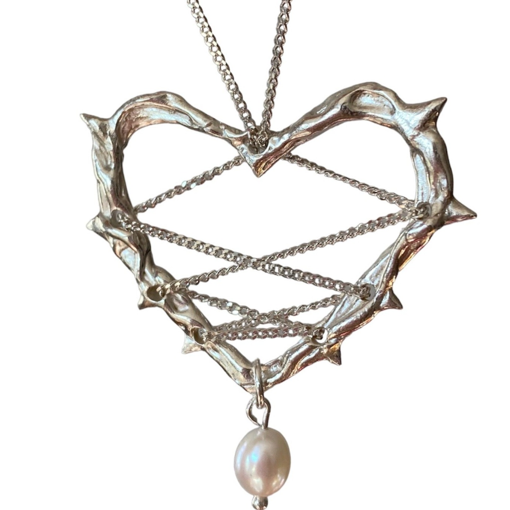 Handcarved, solid sterling silver spikey heart with sterling silver chain. Freshwater pearl hangs from the end of the heart. All metal components are sterling silver.