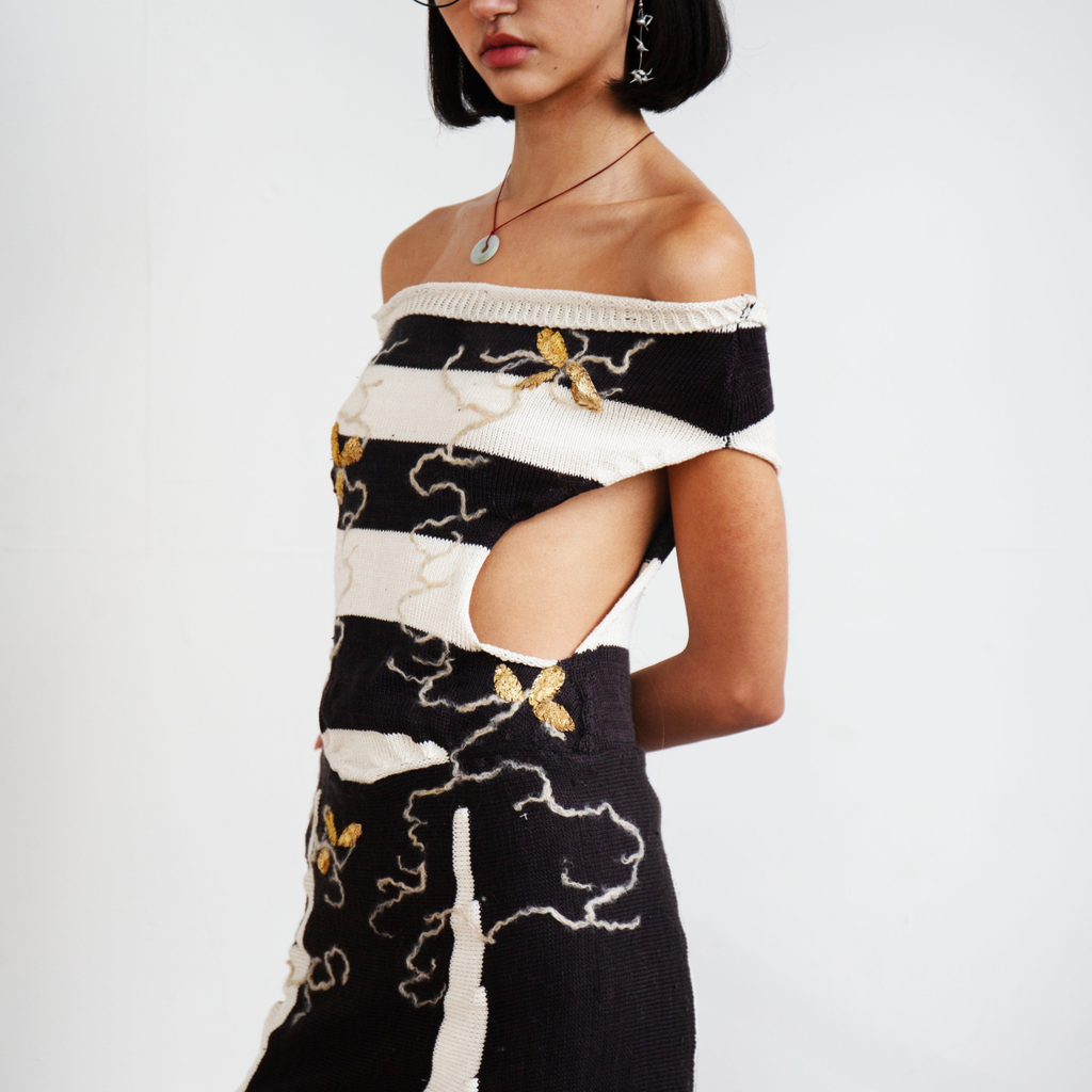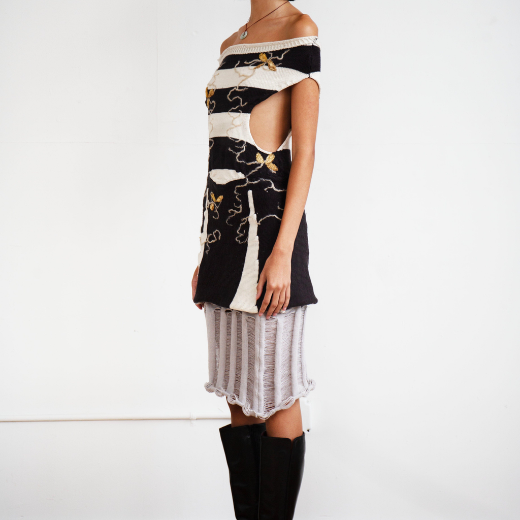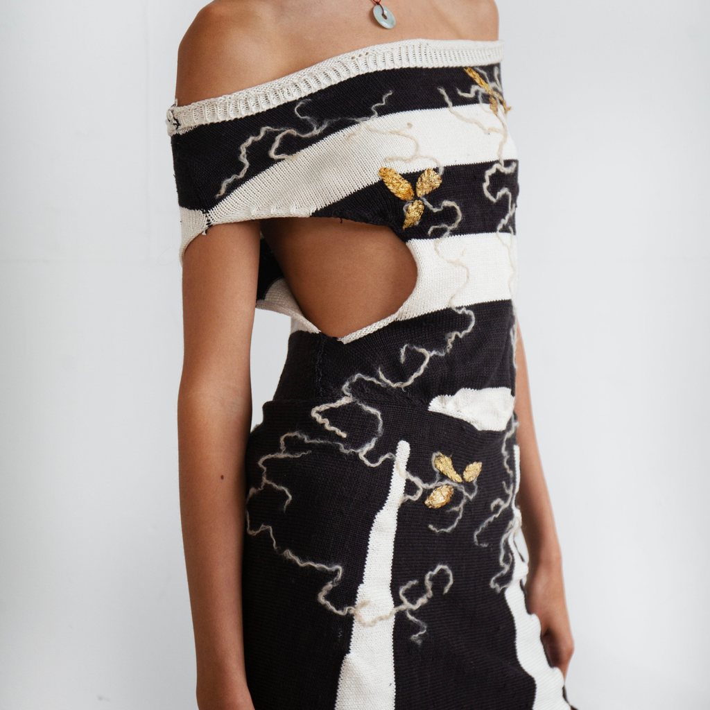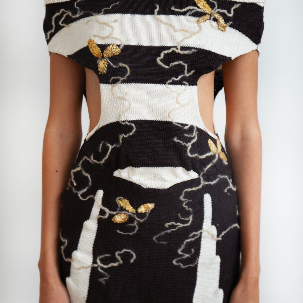 Fully fashioned hand-made top knit with 100% silk and pearlized cotton sourced in NJ and NC. Hand-felted with 100% Wensleydale locks sourced from a farm in PA and embroidered with wild goldenrod cocoons sourced from Japan.