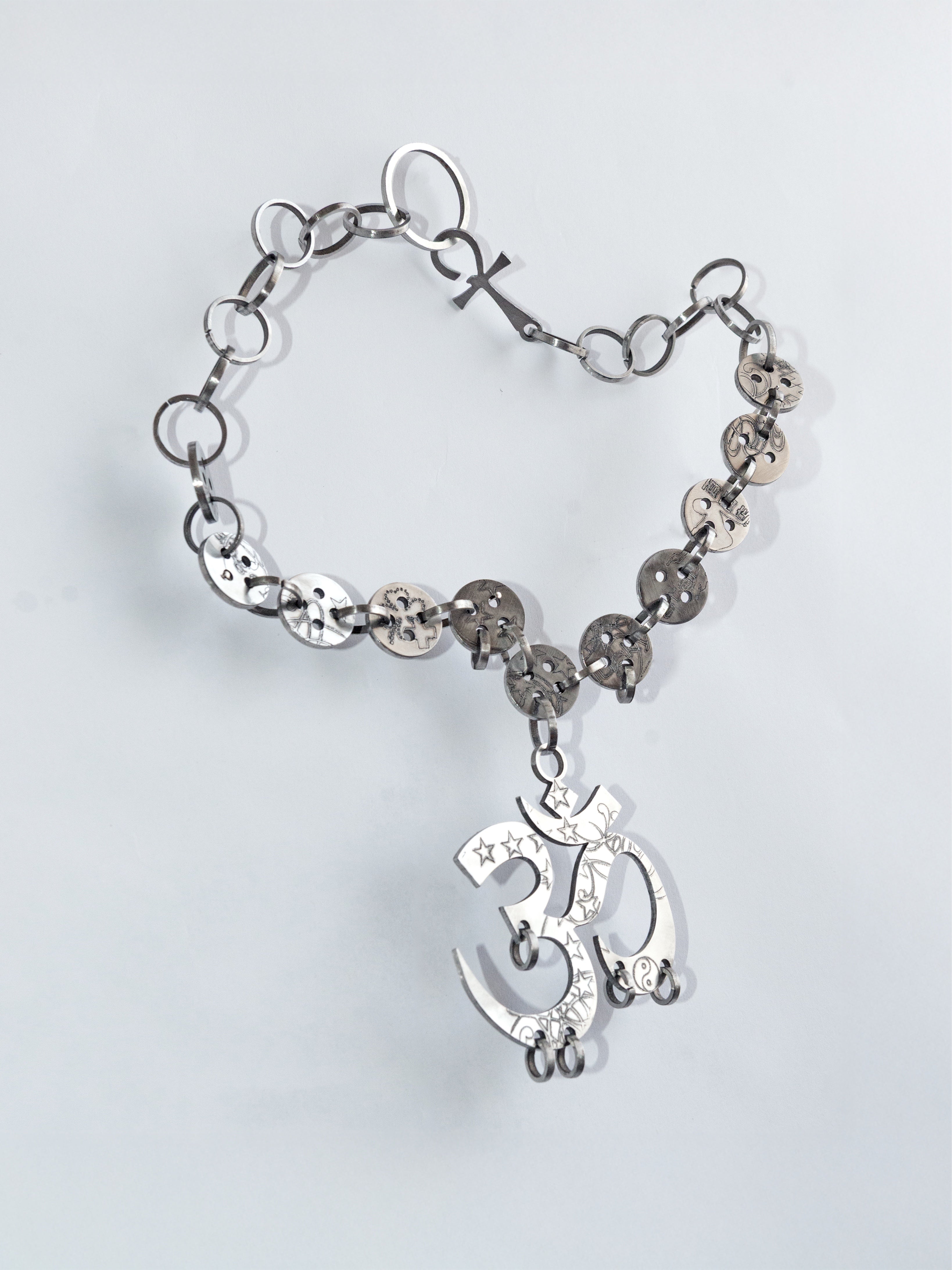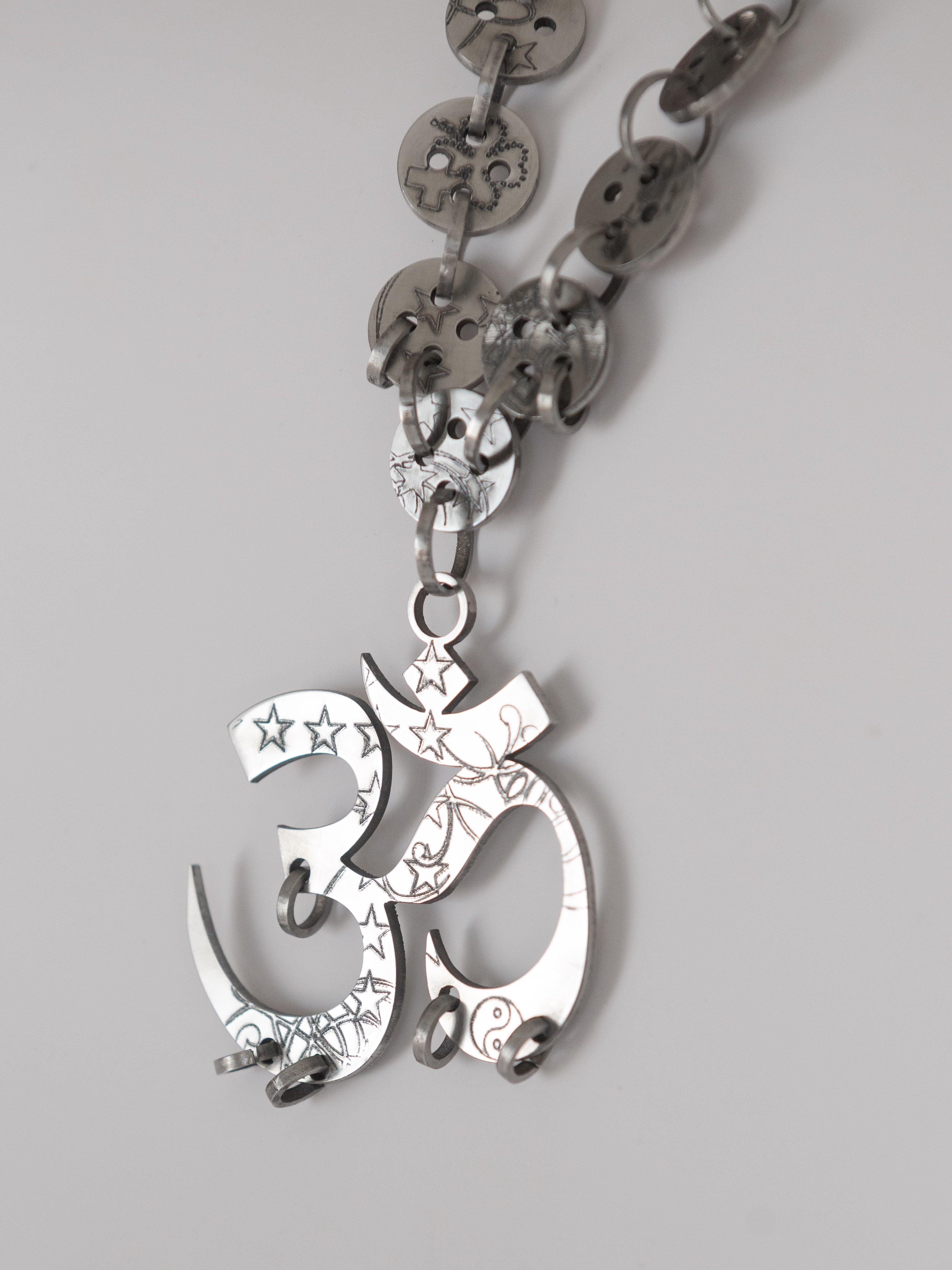 A 1-of-1 necklace that has been laser-cut and engraved from 2 mm stainless-steel sheet.