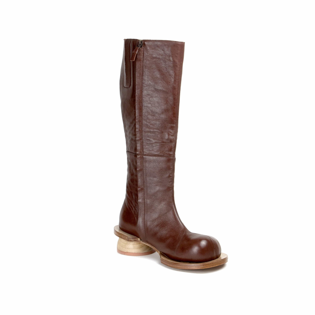 Upcycled leather. Leather sole. Wooden heel.