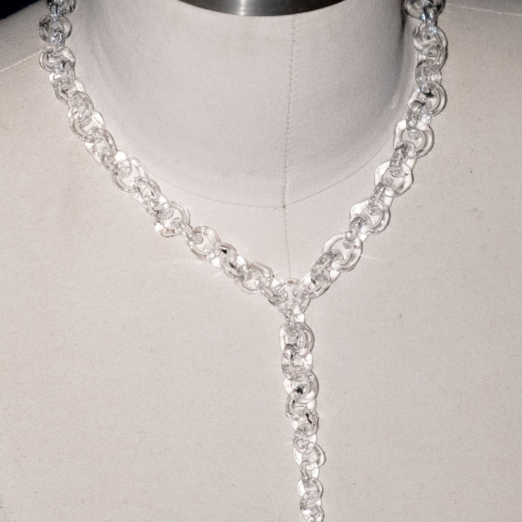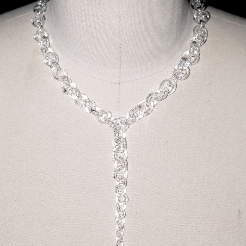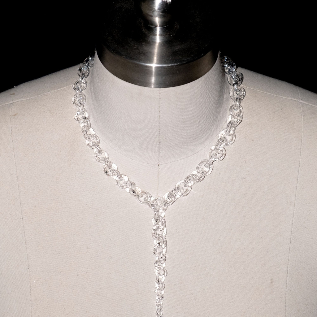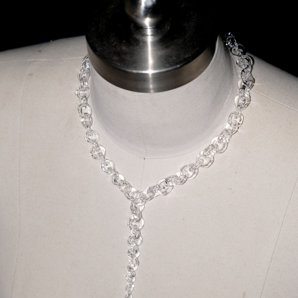 Subtle yet bold glass chains, handmade from borosilicate glass. Each necklace is crafted with precision and care. The necklace is adjustable in size, allowing it to be worn as a choker or longer piece.