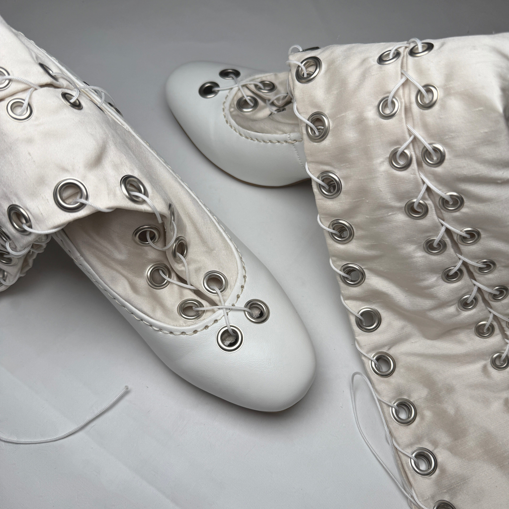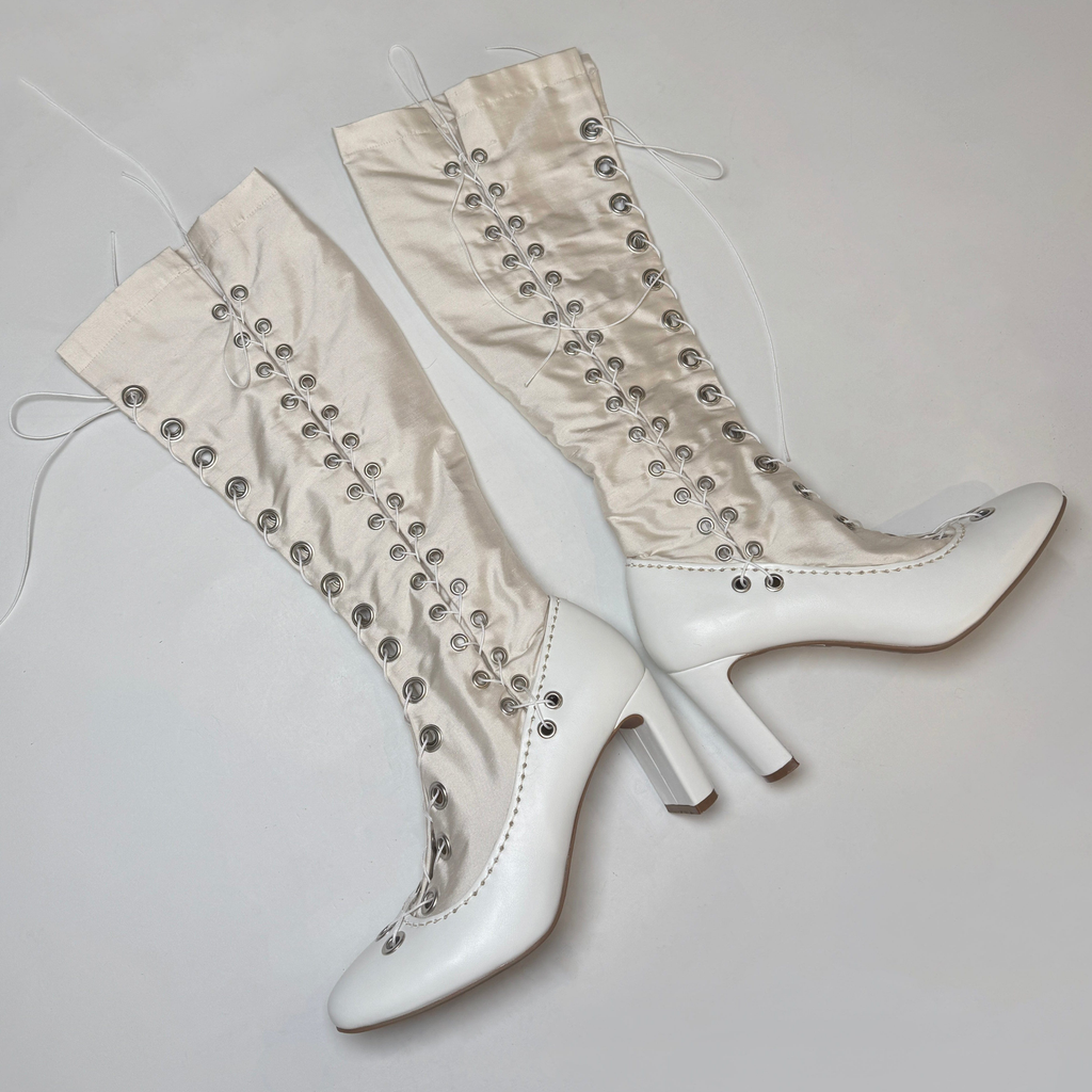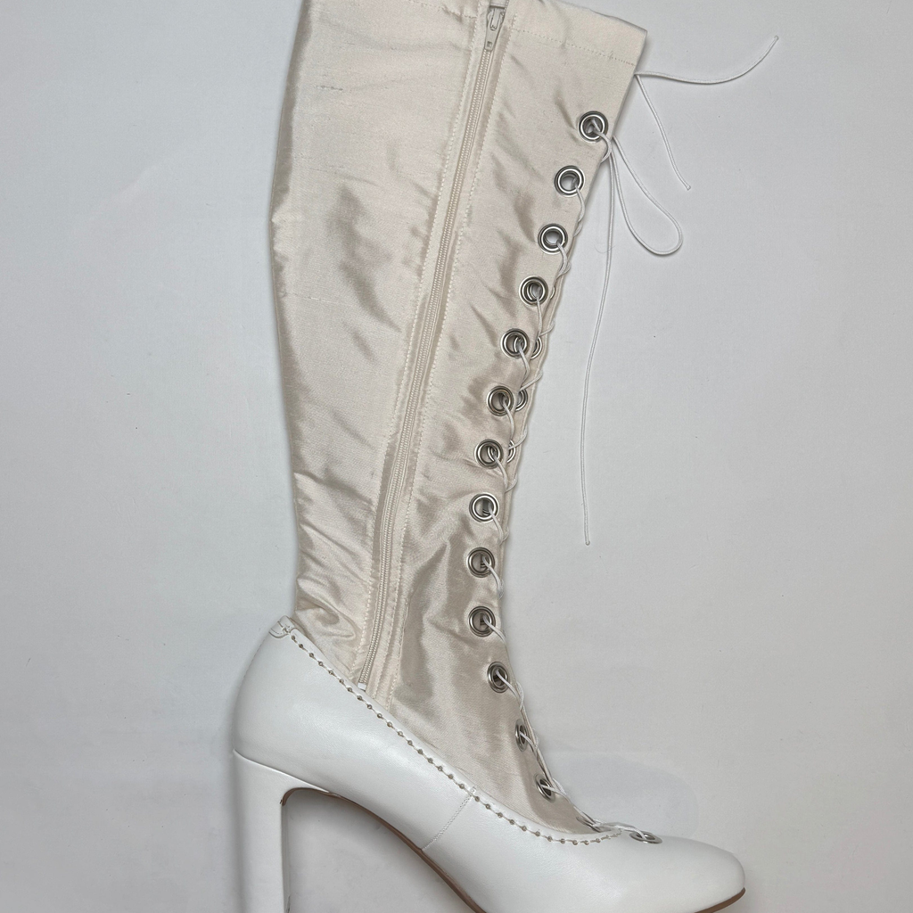 Constructed from silk satin and faux leather heels, Sylvi Sundkler signature Gaiter Boots features over 40 set eyelets and two full-length lace-up closures.