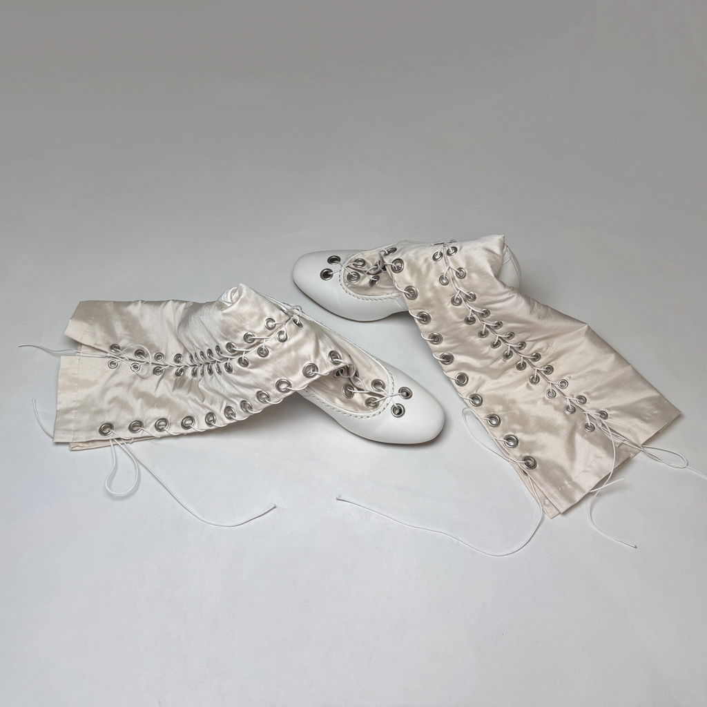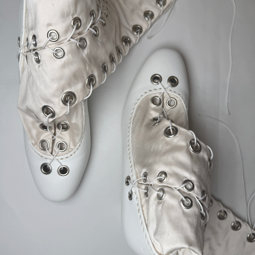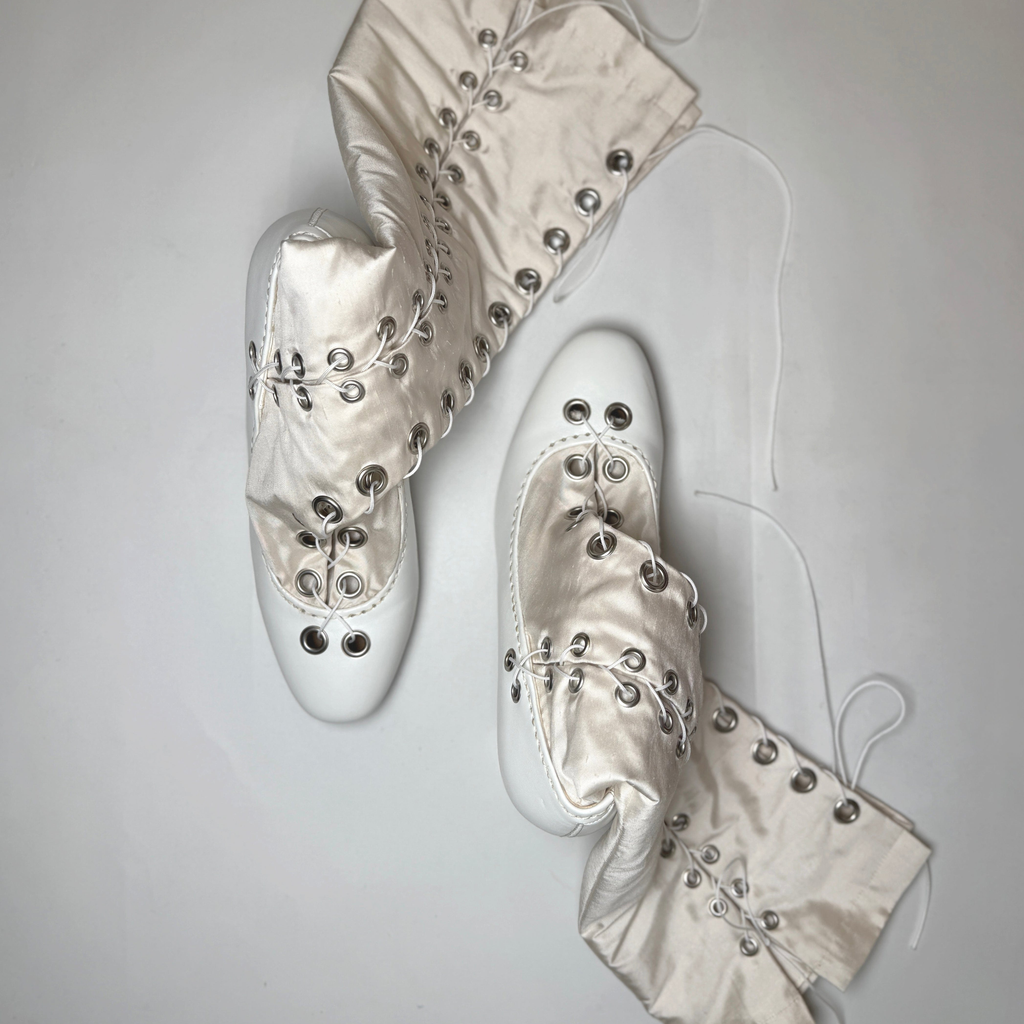 Constructed from silk satin and faux leather heels, Sylvi Sundkler signature Gaiter Boots features over 40 set eyelets and two full-length lace-up closures.
