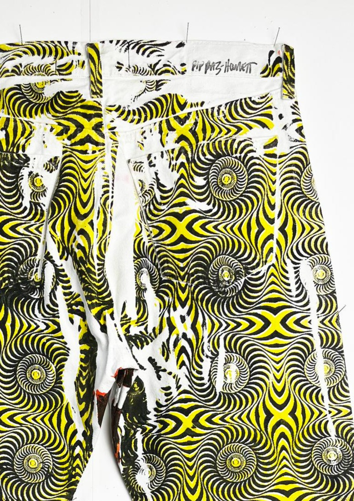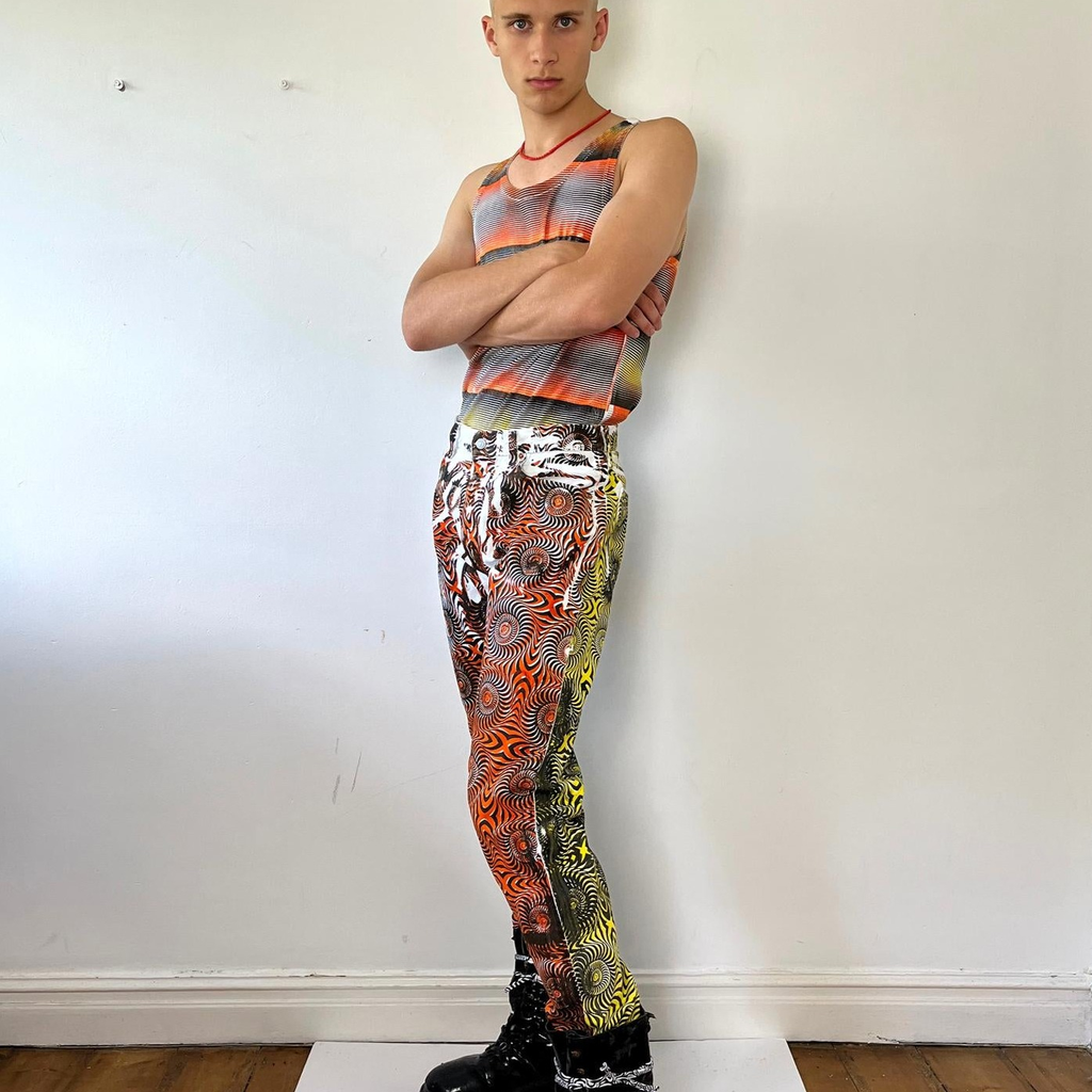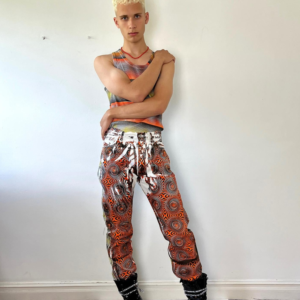 Recently Graduated from Central Saint Martins, Pip Paz-Howlett is in the early stage of setting up his brand, creating one of a kind pieces through upcycling, repurposing and silk screen printing/fabric manipulation. Pip's work is a saturated and sexual exploration of menswear referencing queer music and culture, vintage gay porn and psychedelic induced hedonism.