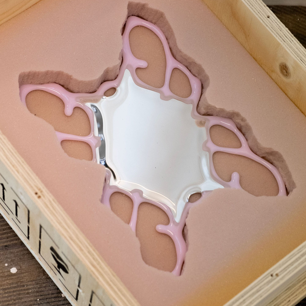 The Orbital Mirror bridges the organic and digital realms, exploring illusion, virtuality, and material transformation. By waterjet cutting, fusing, polishing and silvering the glass, the intricate, web-like patterns combine structure and abstraction, juxtaposing new media techniques with glass.