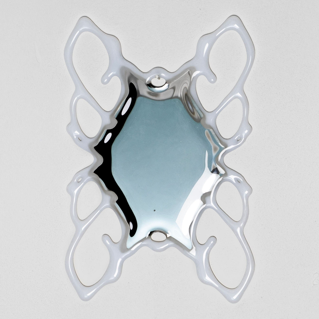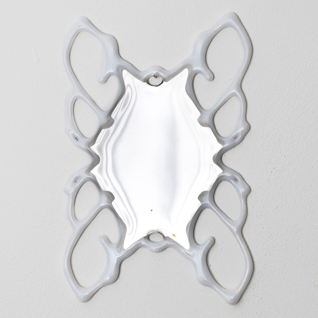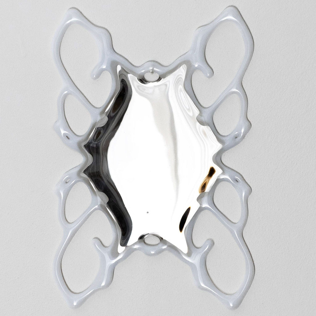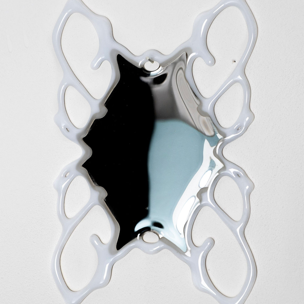 The Orbital Mirror bridges the organic and digital realms, exploring illusion, virtuality, and material transformation. By waterjet cutting, fusing, polishing and silvering the glass, the intricate, web-like patterns combine structure and abstraction, juxtaposing new media techniques with glass.