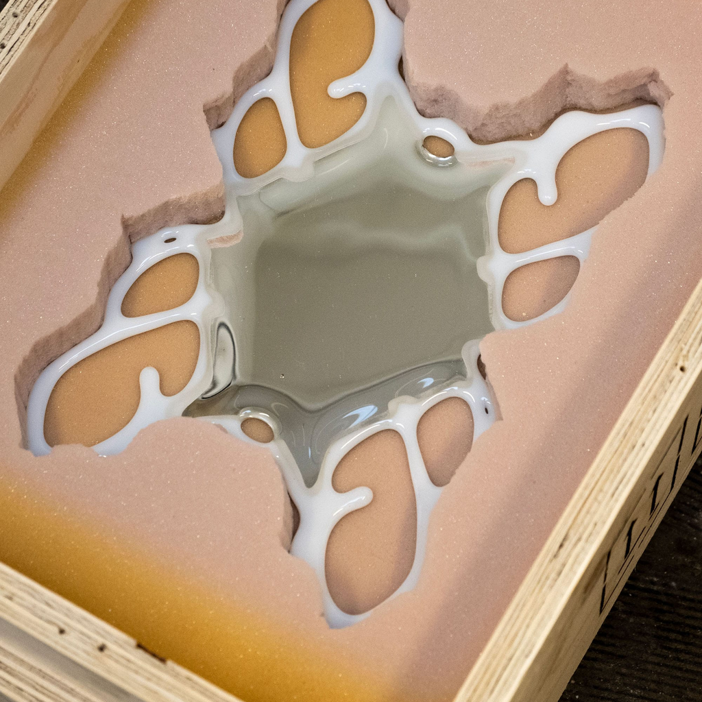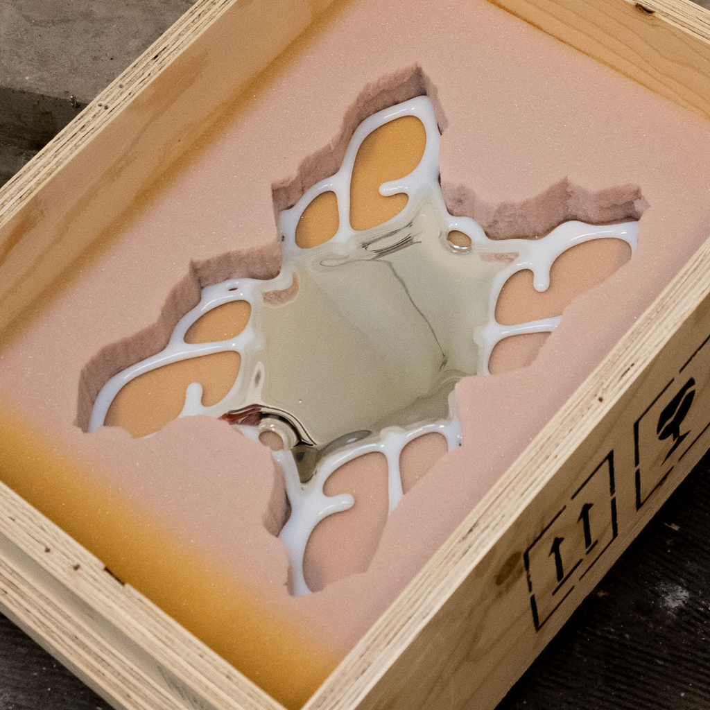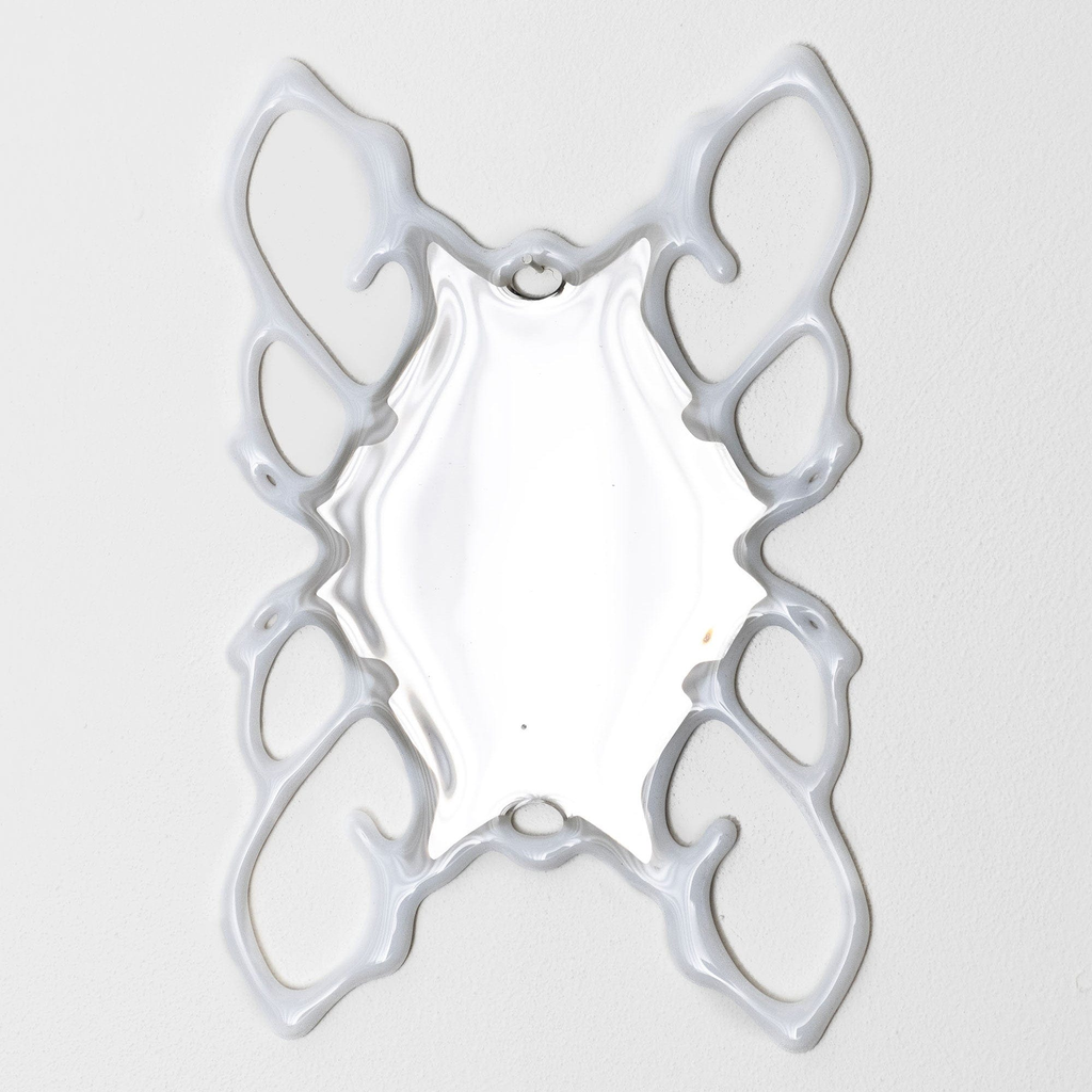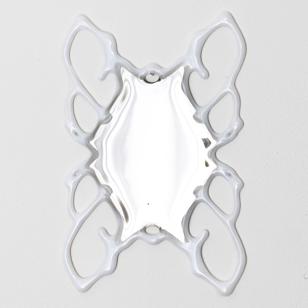 The Orbital Mirror bridges the organic and digital realms, exploring illusion, virtuality, and material transformation. By waterjet cutting, fusing, polishing and silvering the glass, the intricate, web-like patterns combine structure and abstraction, juxtaposing new media techniques with glass.