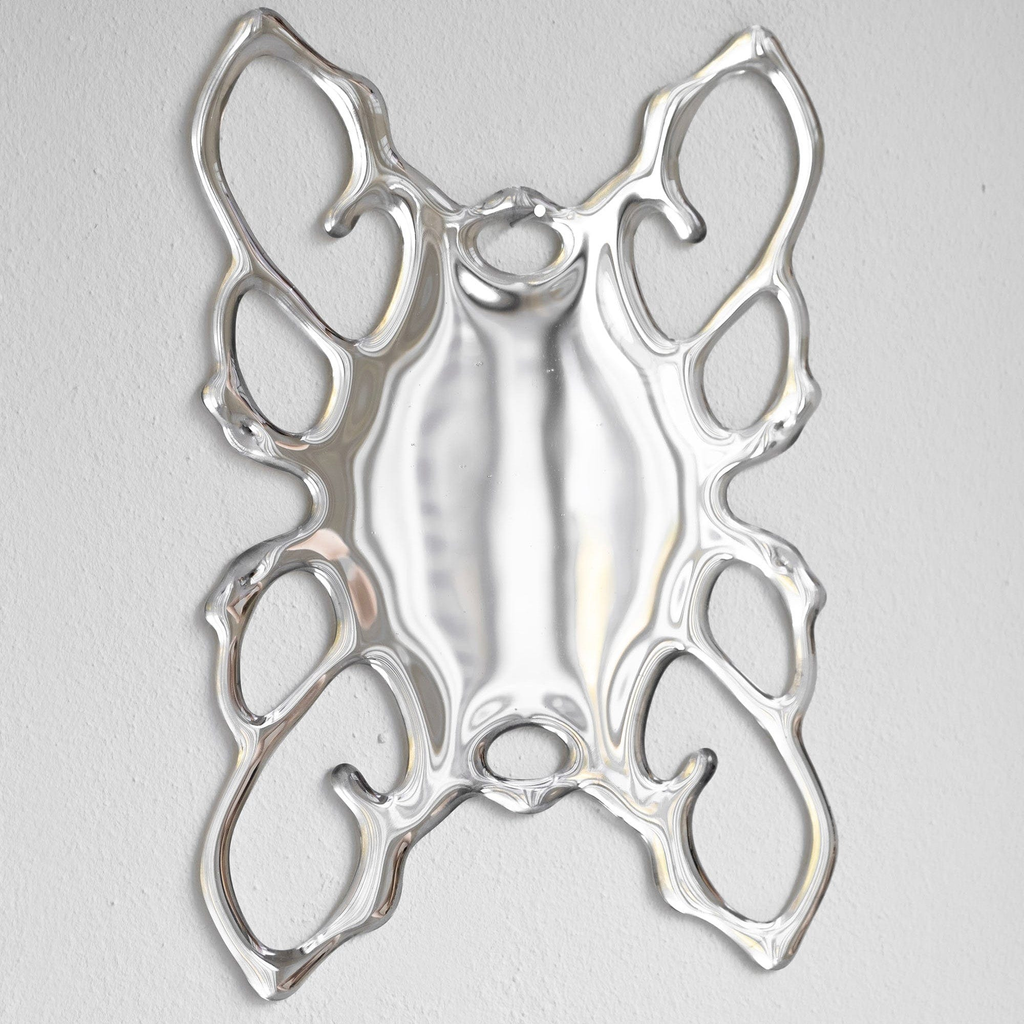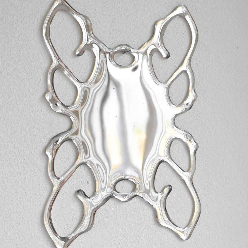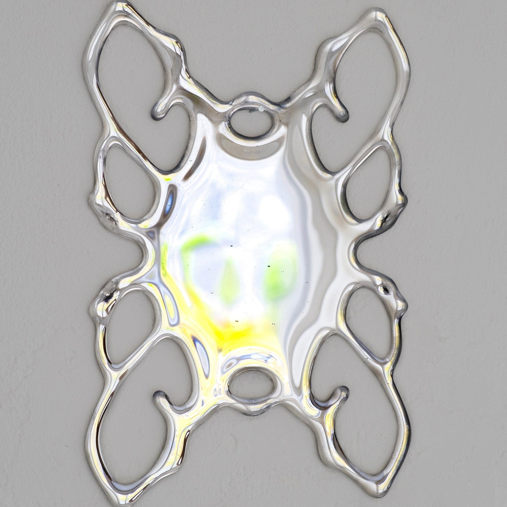 The Orbital Mirror bridges the organic and digital realms, exploring illusion, virtuality, and material transformation. By waterjet cutting, fusing, polishing and silvering the glass, the intricate, web-like patterns combine structure and abstraction, juxtaposing new media techniques with glass.
