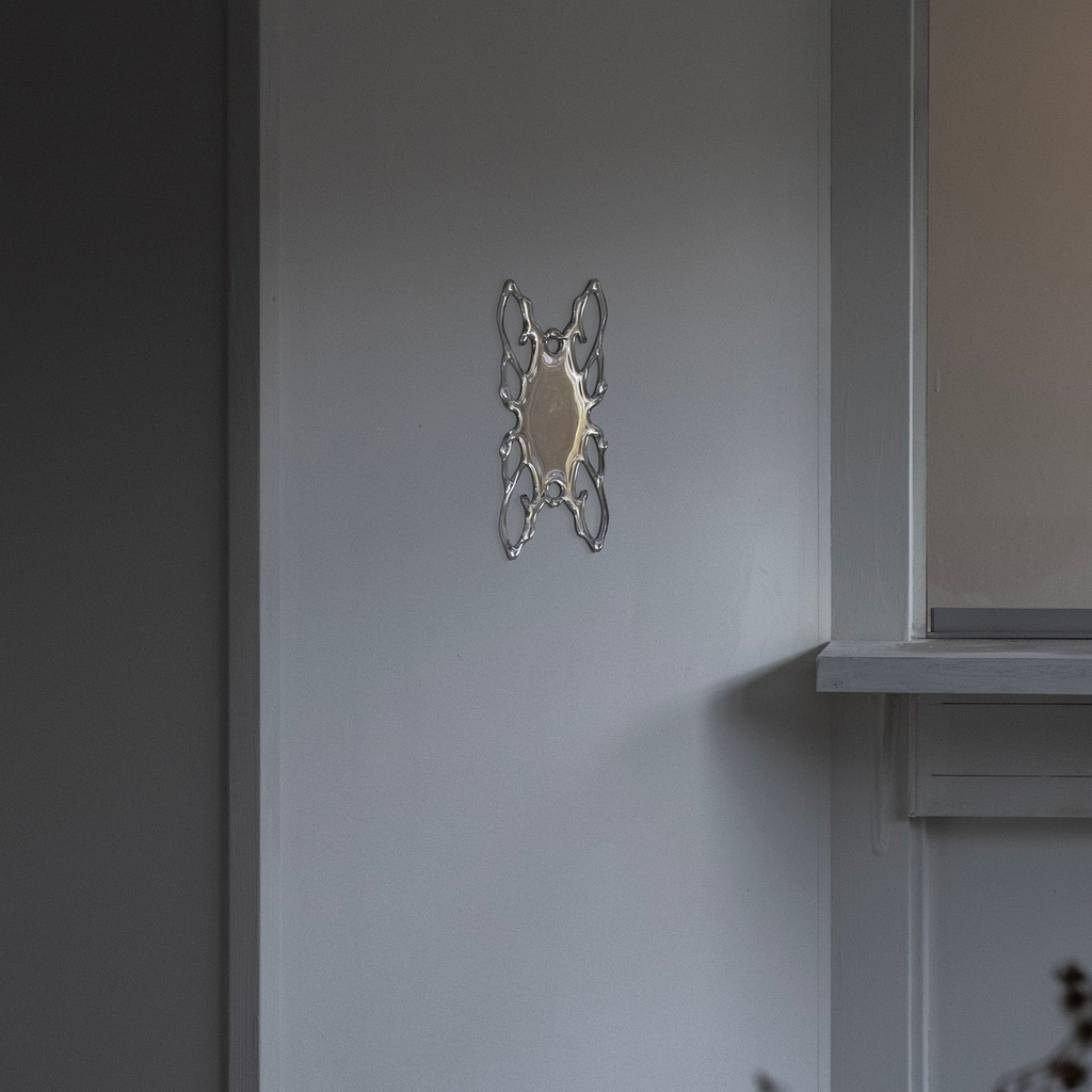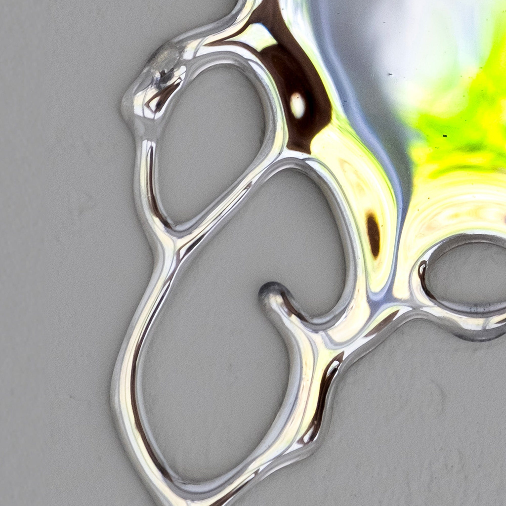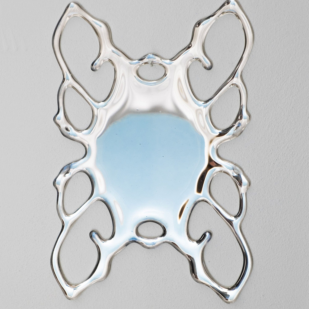 The Orbital Mirror bridges the organic and digital realms, exploring illusion, virtuality, and material transformation. By waterjet cutting, fusing, polishing and silvering the glass, the intricate, web-like patterns combine structure and abstraction, juxtaposing new media techniques with glass.
