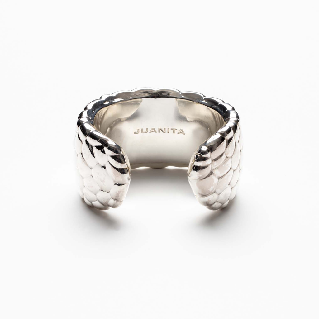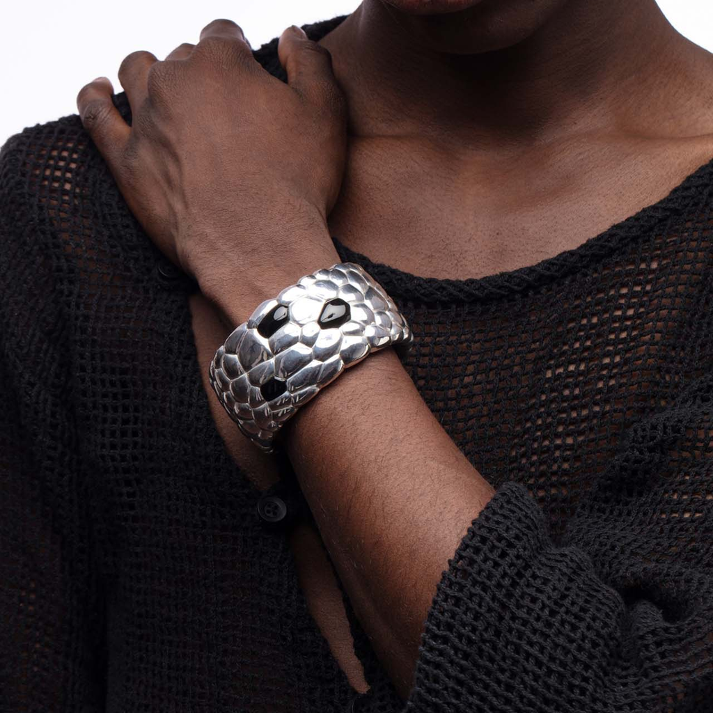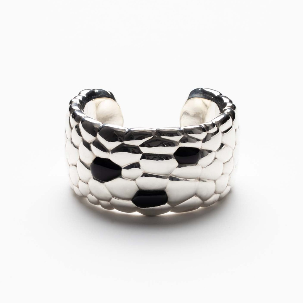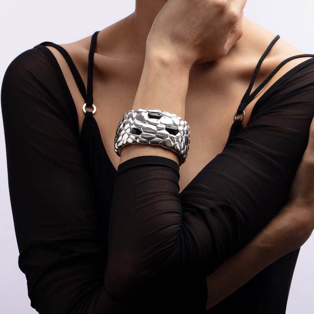 Bracelet based on the walls of Cusco, Peru, and on patterns of organisation of matter on a biological and cultural level. With three onyx stones inlaid. Patterns: reptiles, cells, natural bark, corn.