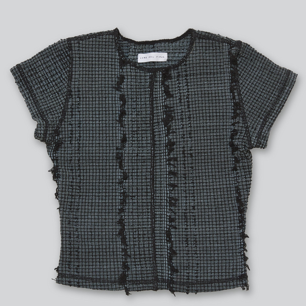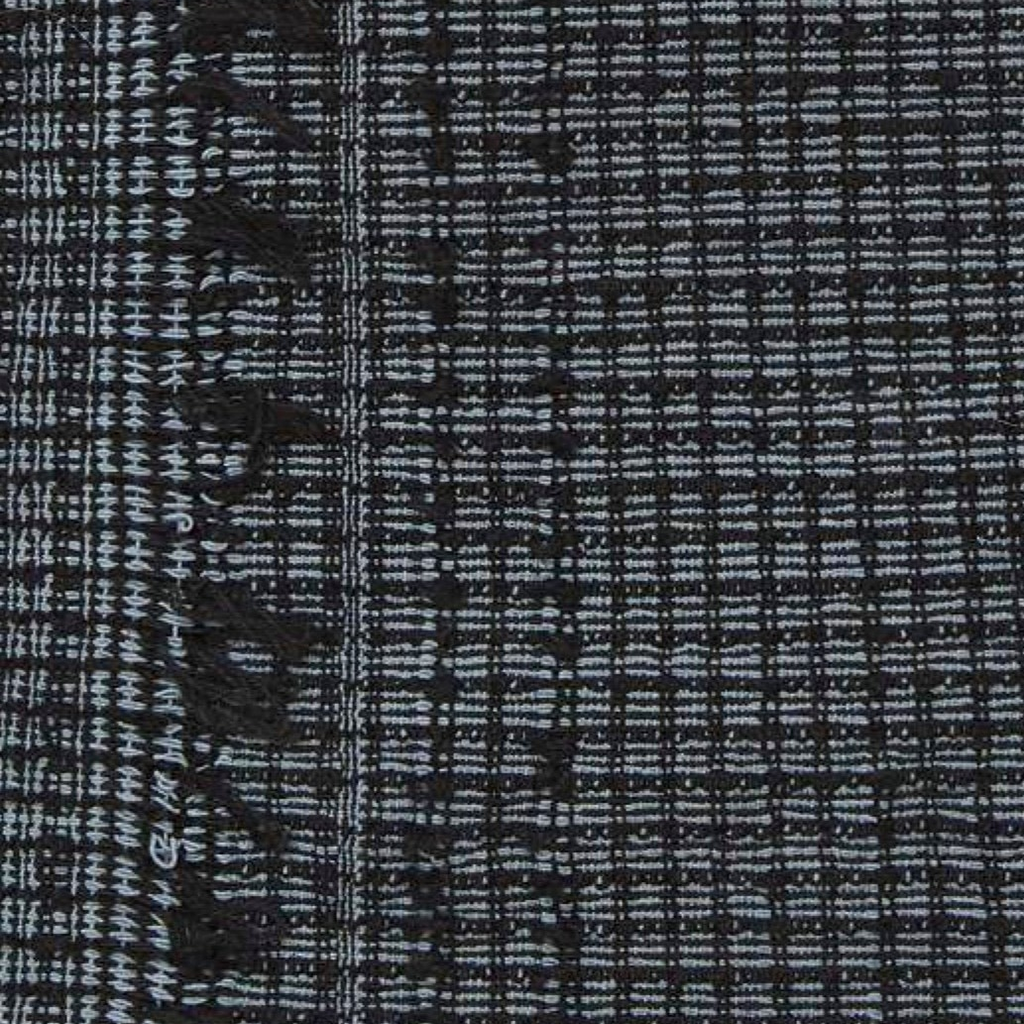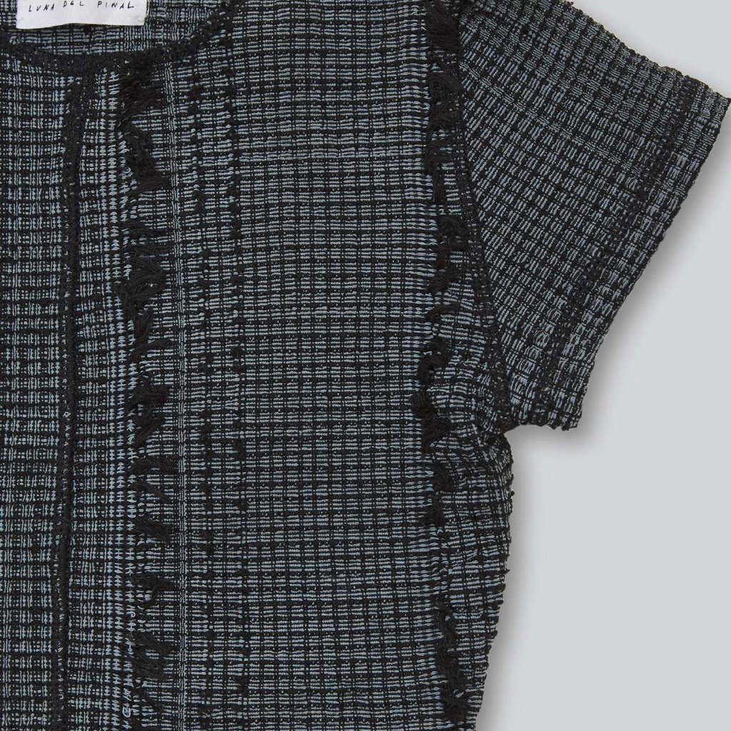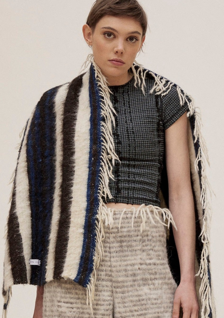 Hand woven stretch weave textile in black and white. Stitched together and finished with overlock detail before overdying it in black, giving it that charcoal grey look.