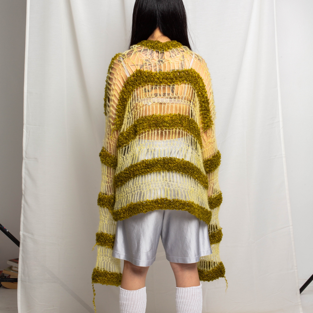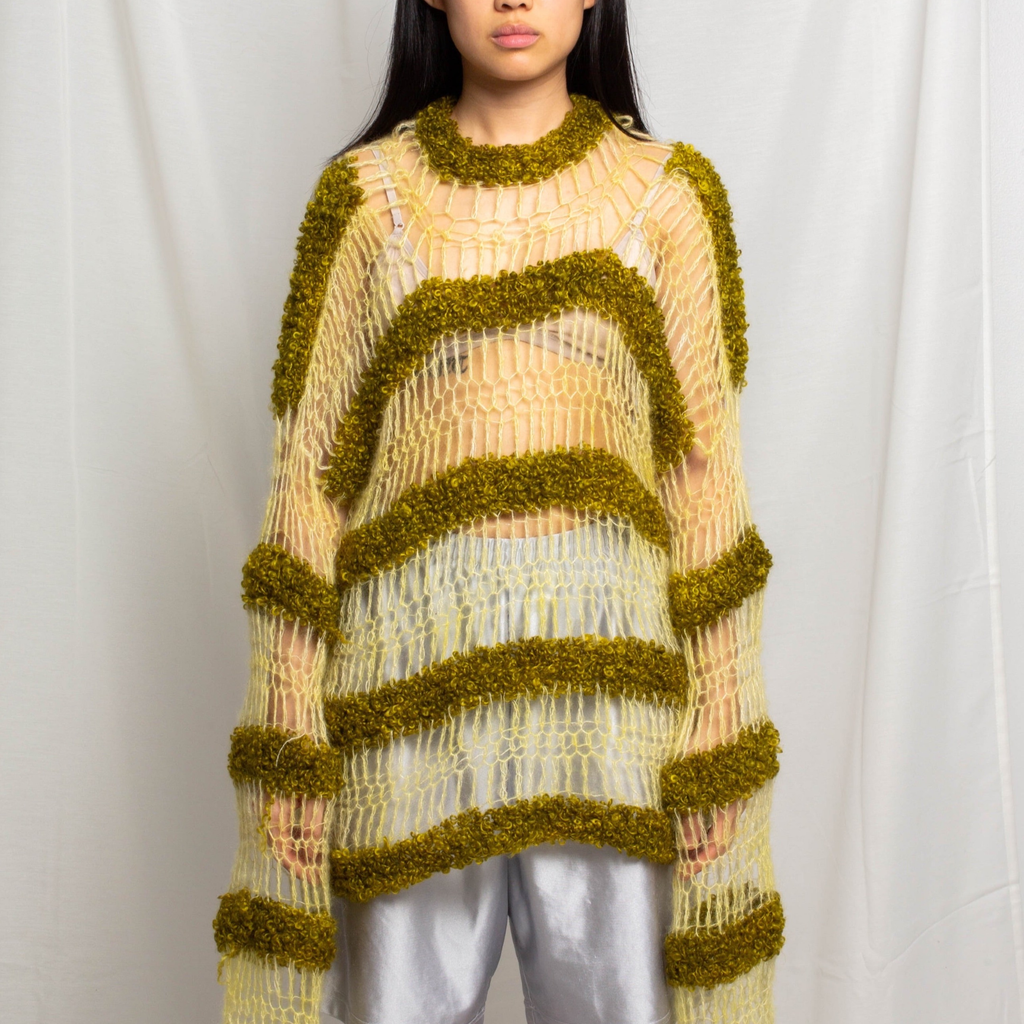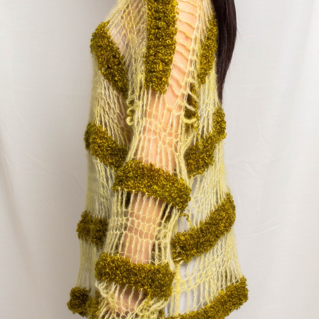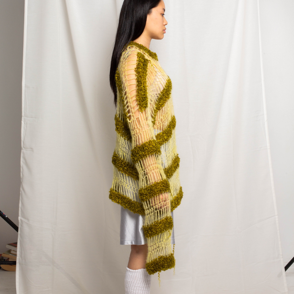 Hand-made crochet jumper by VAISSEAU using ethically sourced and hand-dyed fibres from Quebec, Canada.
