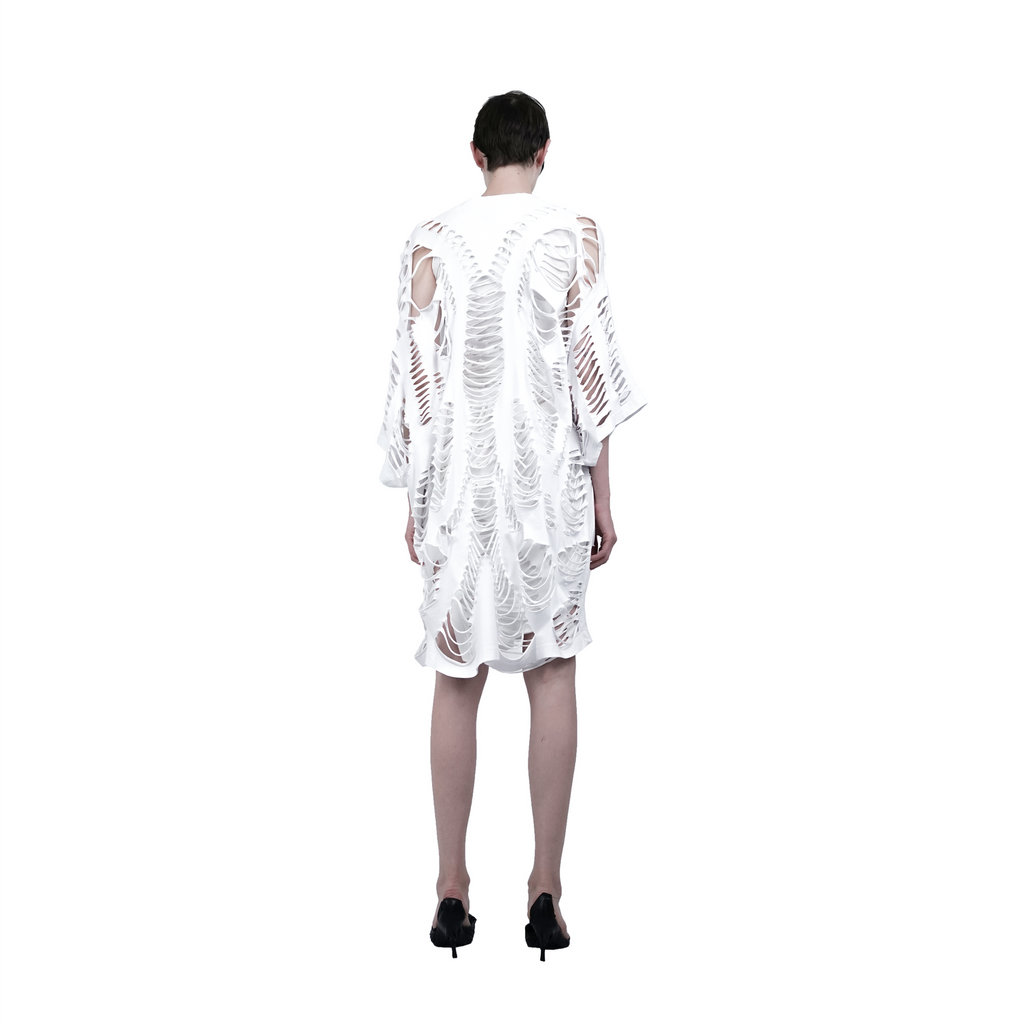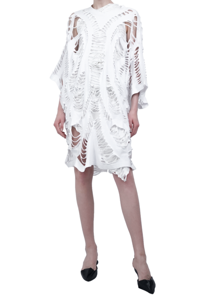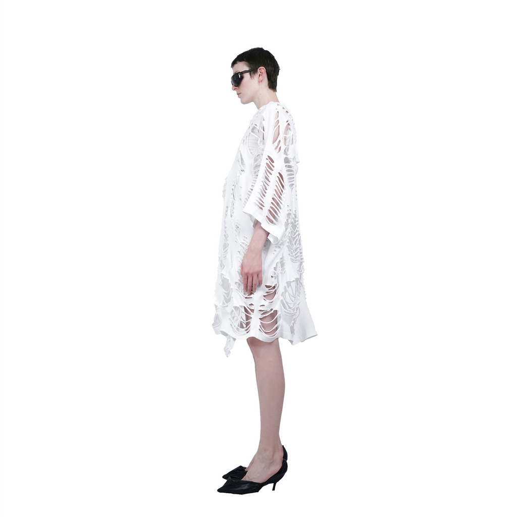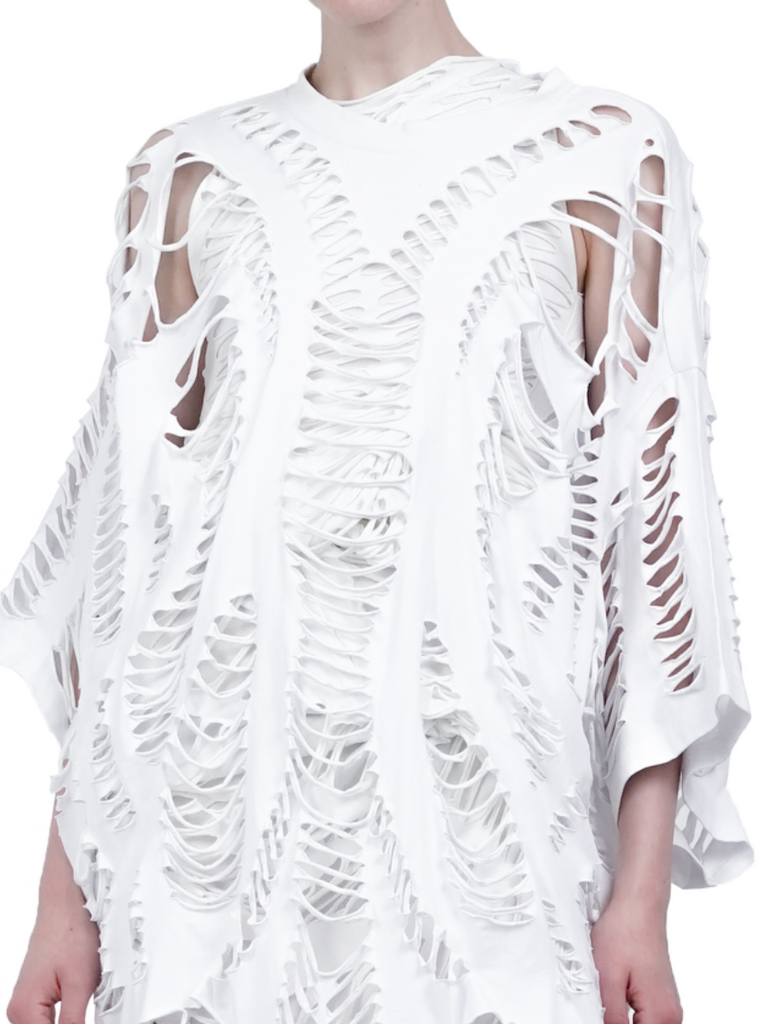 Oversized short-sleeved tee, showcasing our distinctive signature cut pattern throughout, creating a lace-like appearance.