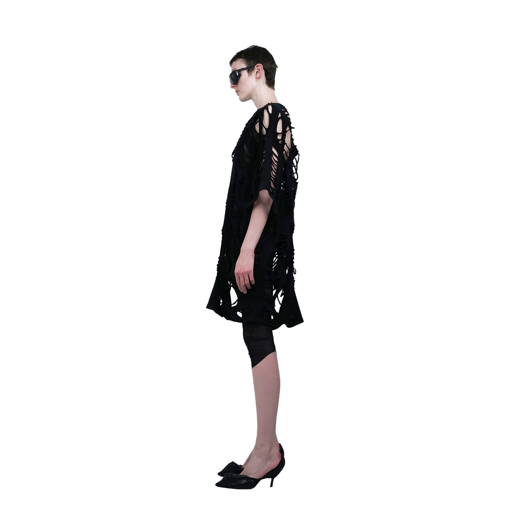 Oversized short-sleeved tee, showcasing our distinctive signature cut pattern throughout, creating a lace-like appearance.