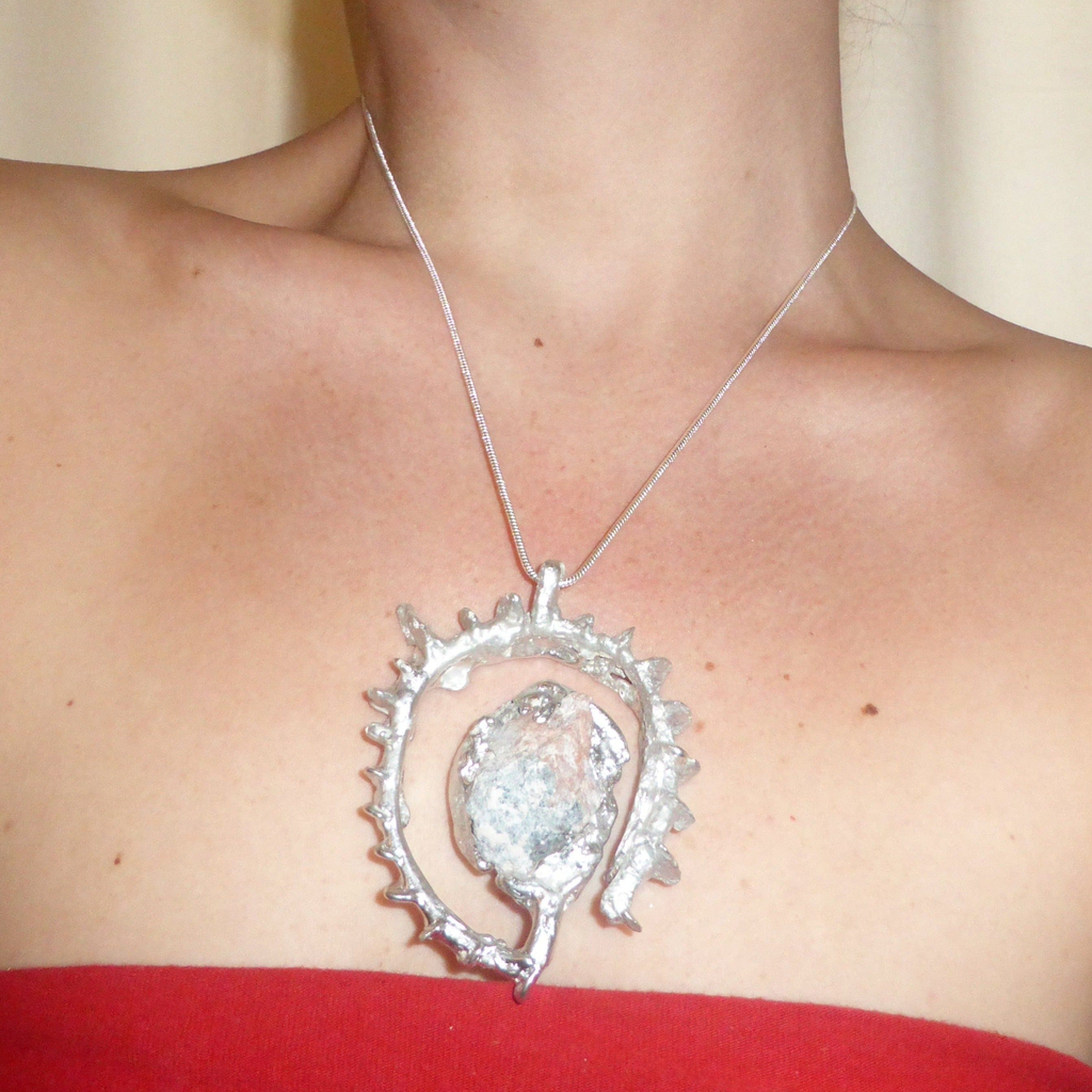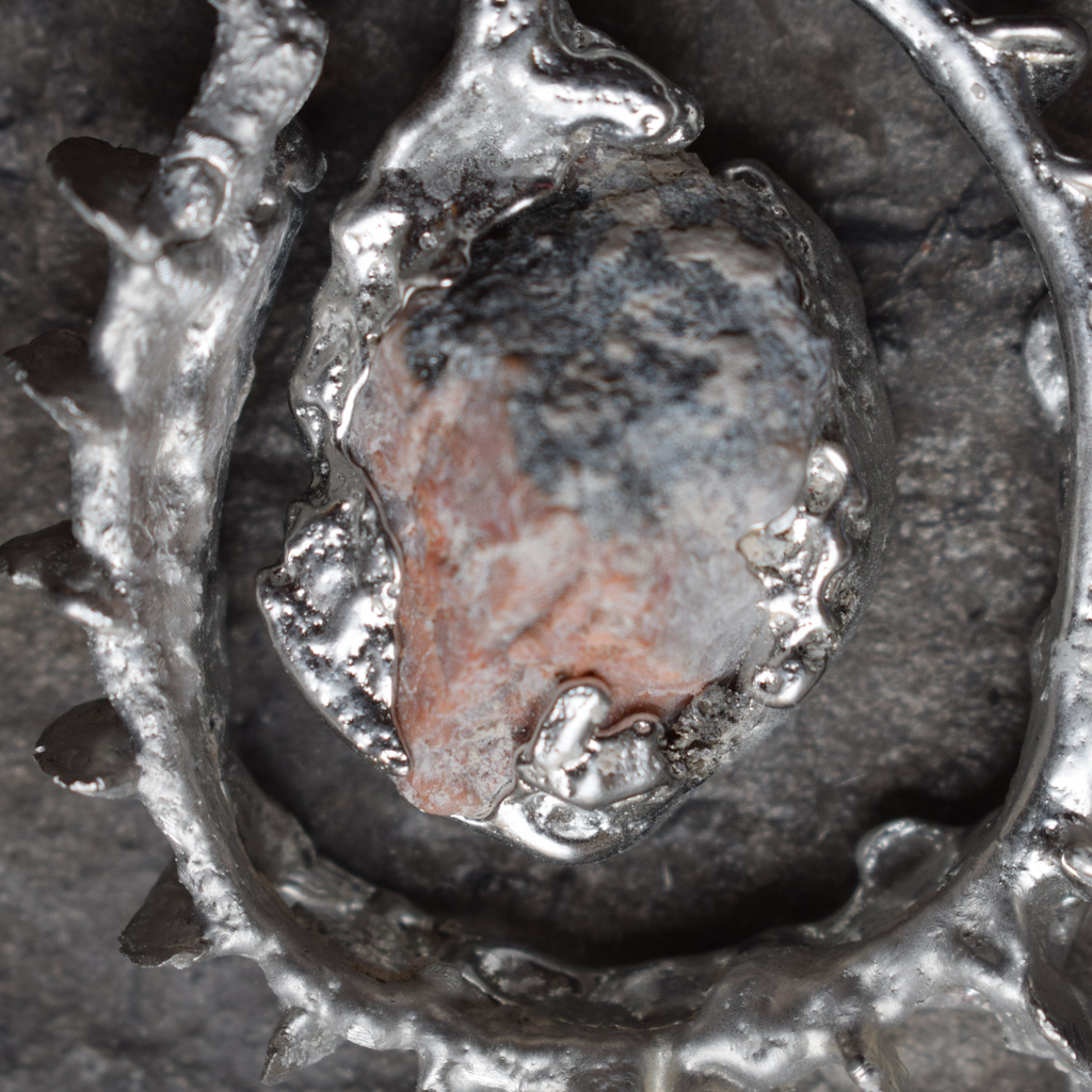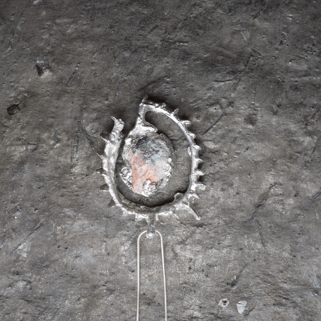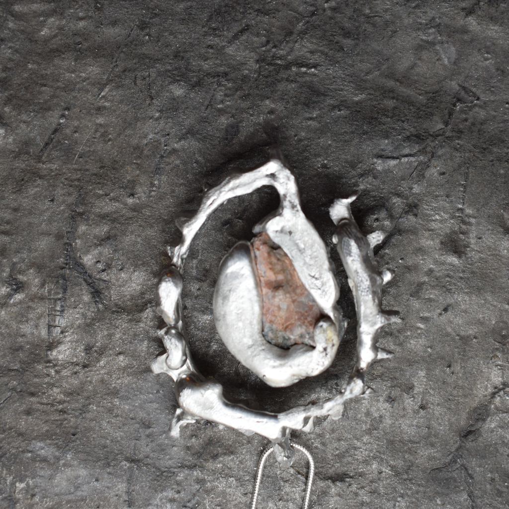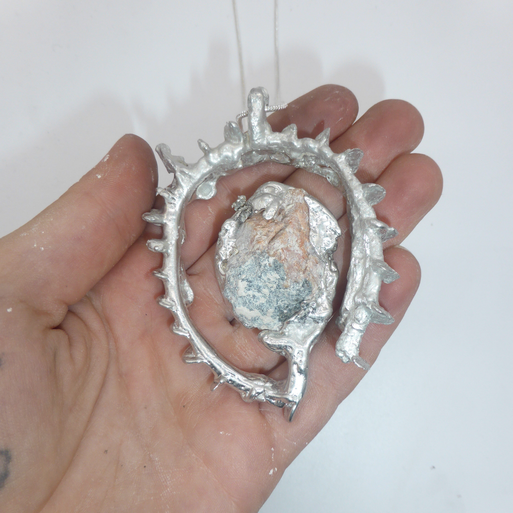 Anniken started making jewellery from stones and crystals in 2021. The materials were collected from when she travelled in a van through Europe. A casual interest in metals and minerals was the impetus for the jewellery making. Casting organically came about through curiosity, trial, and error. Local clay was used, excavated from the local forest, recycled tin from various recycling stores in Norway, and natural objects from multiple areas, for example; pyrite from the fjords of Sogn, druses from the Dolomites in Italy, crystals from Switzerland or quartz from Østmarka in Oslo.