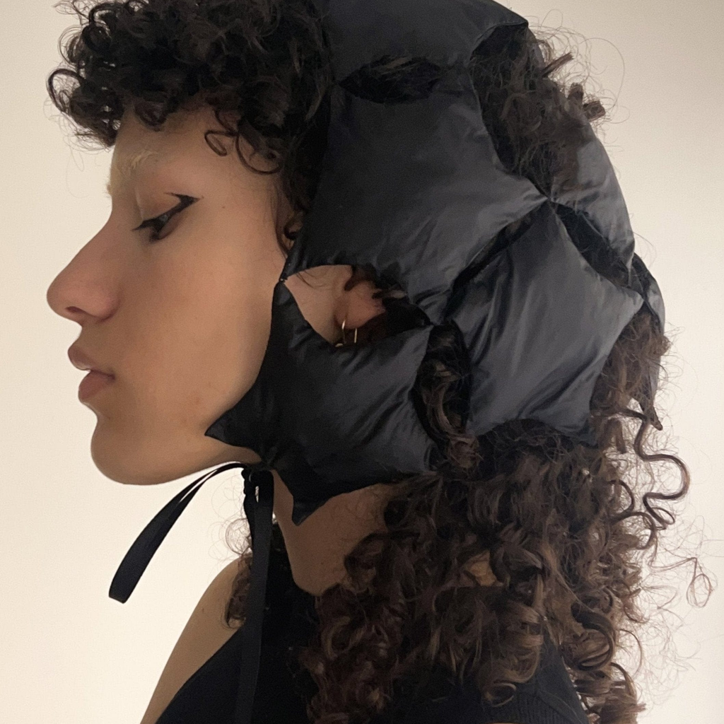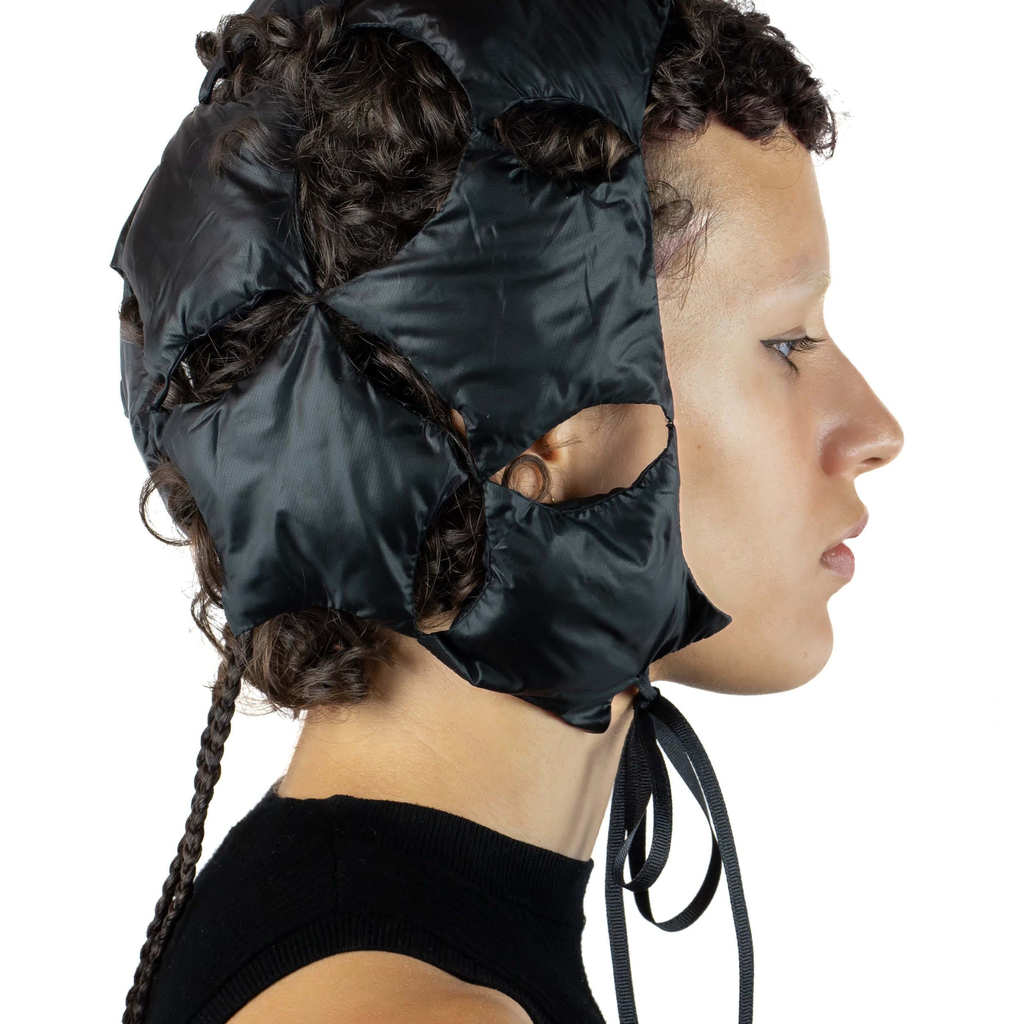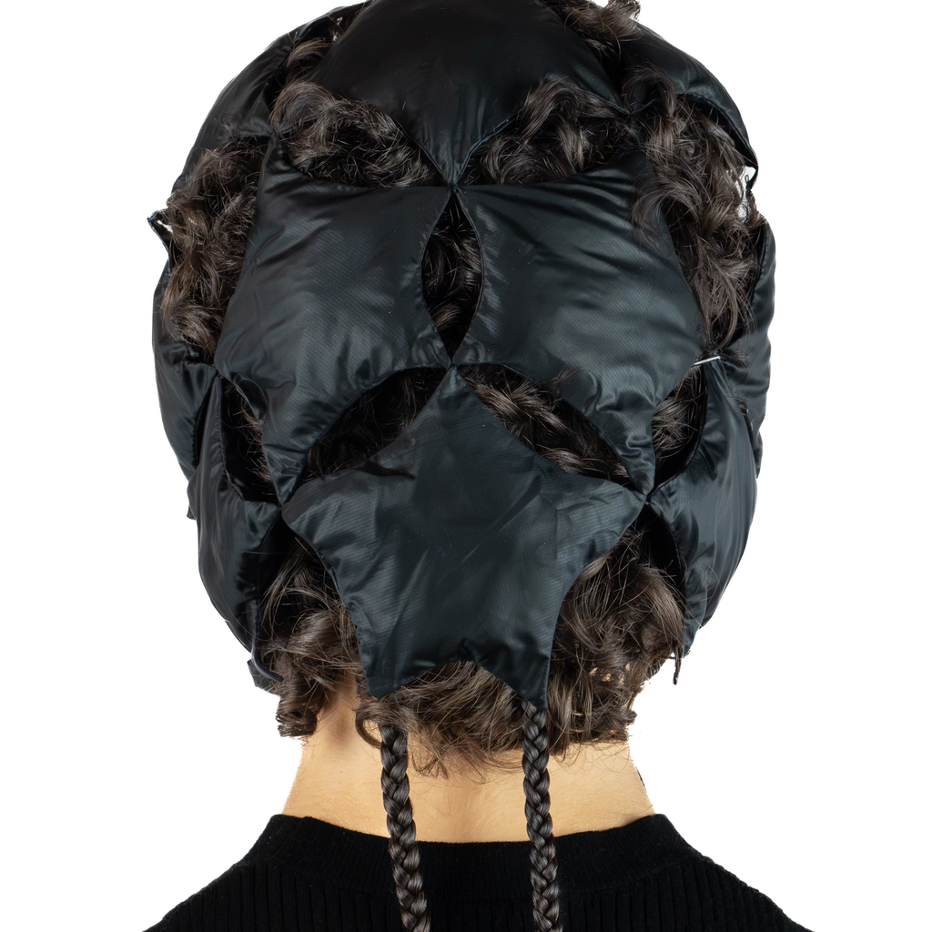 The Padded Nylong Starry Bonnet by Sila Ersayin is composed of 13 padded stars, hand-sewn together. Inspired by microscopic images of sand, and chiral pentagonal tiling.