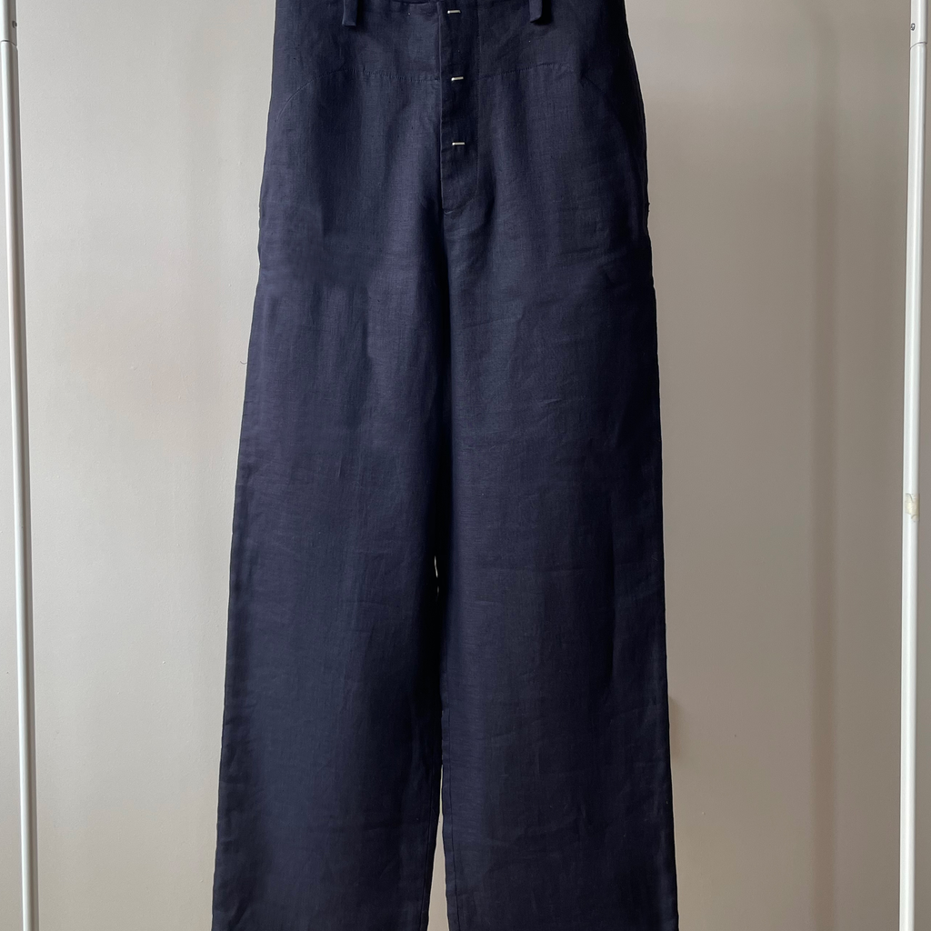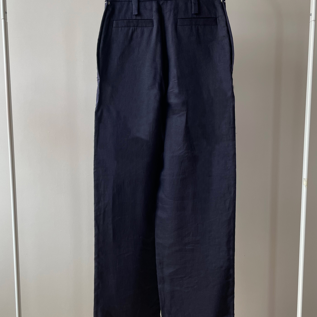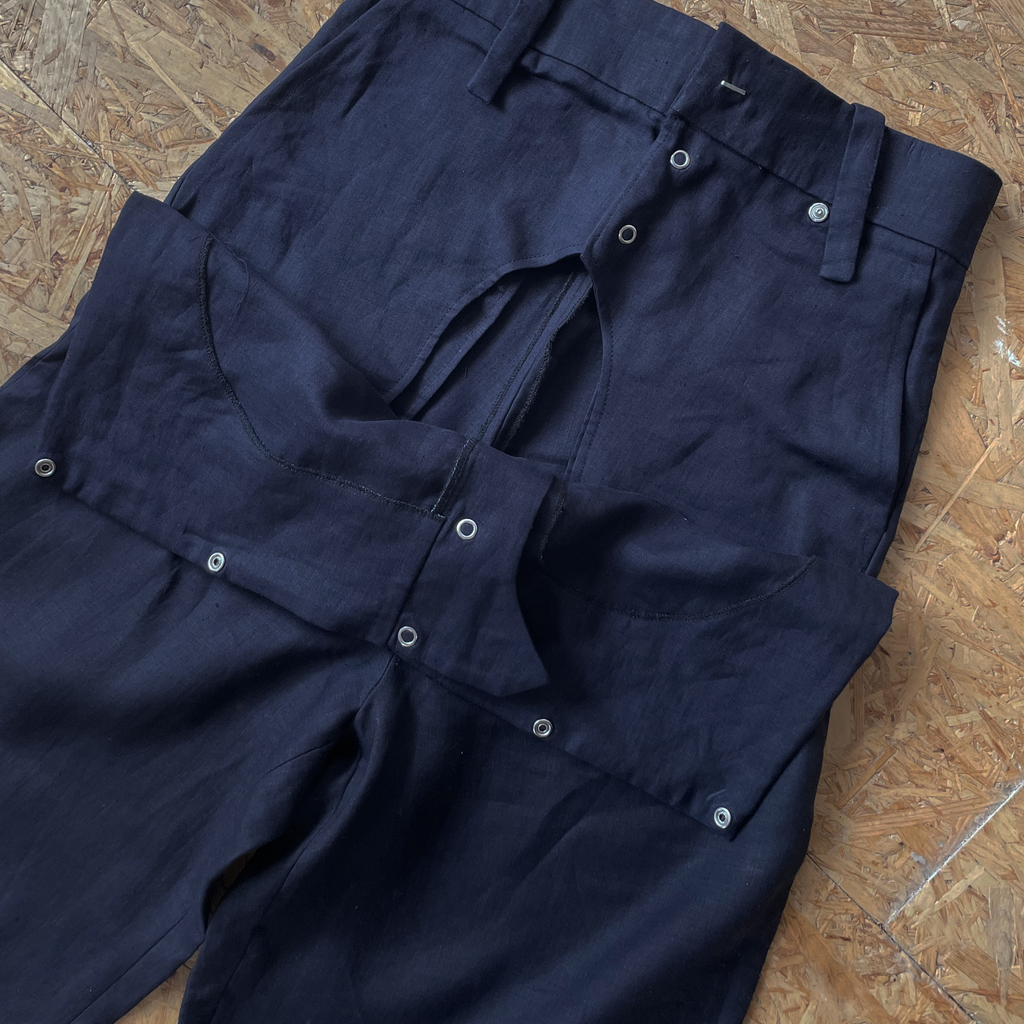 High waisted fold-down front trousers made with dead-stock French linen. Finished with handmade staples as a decorative elements for the snaps closure to give the illusion of things being ‘stapled’ together when the snap are closed.