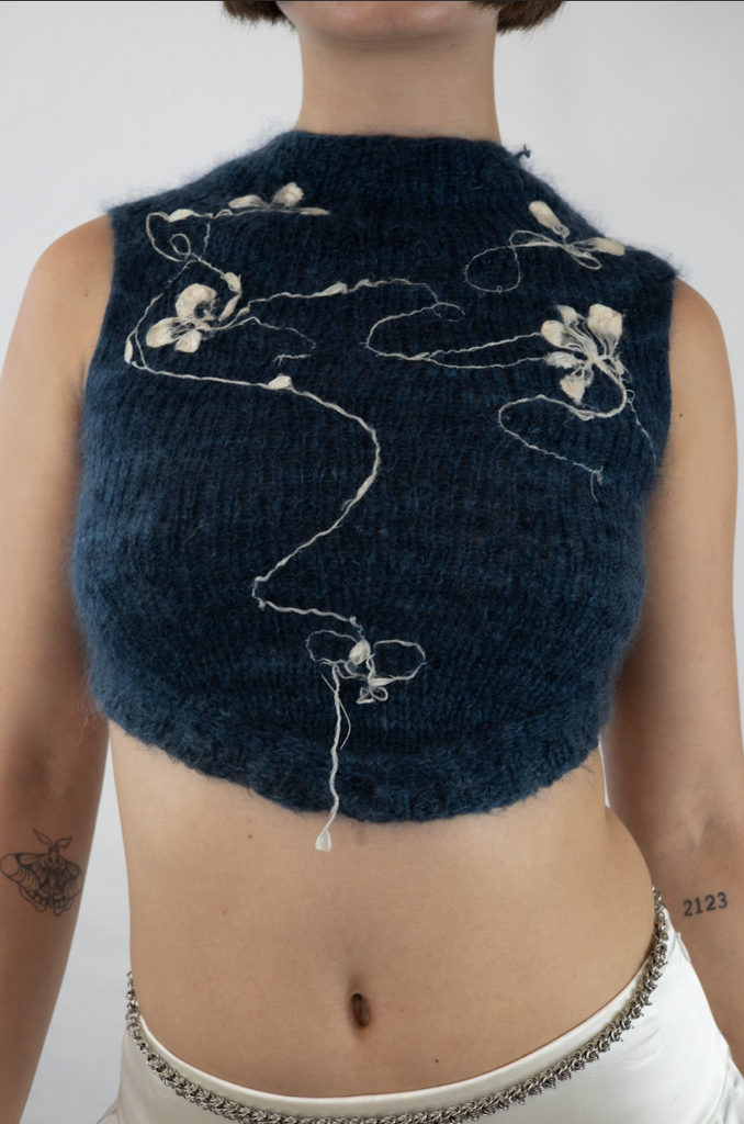 This Ink Painting Top is hand-knit with a skein of artisanal mohair from a female farmer in Nova Scotia. Embroidered with hand-raised silk cocoons hatched from silkworm eggs and raised over the course of three months in Brooklyn NYC by GRACE GUI Studio.