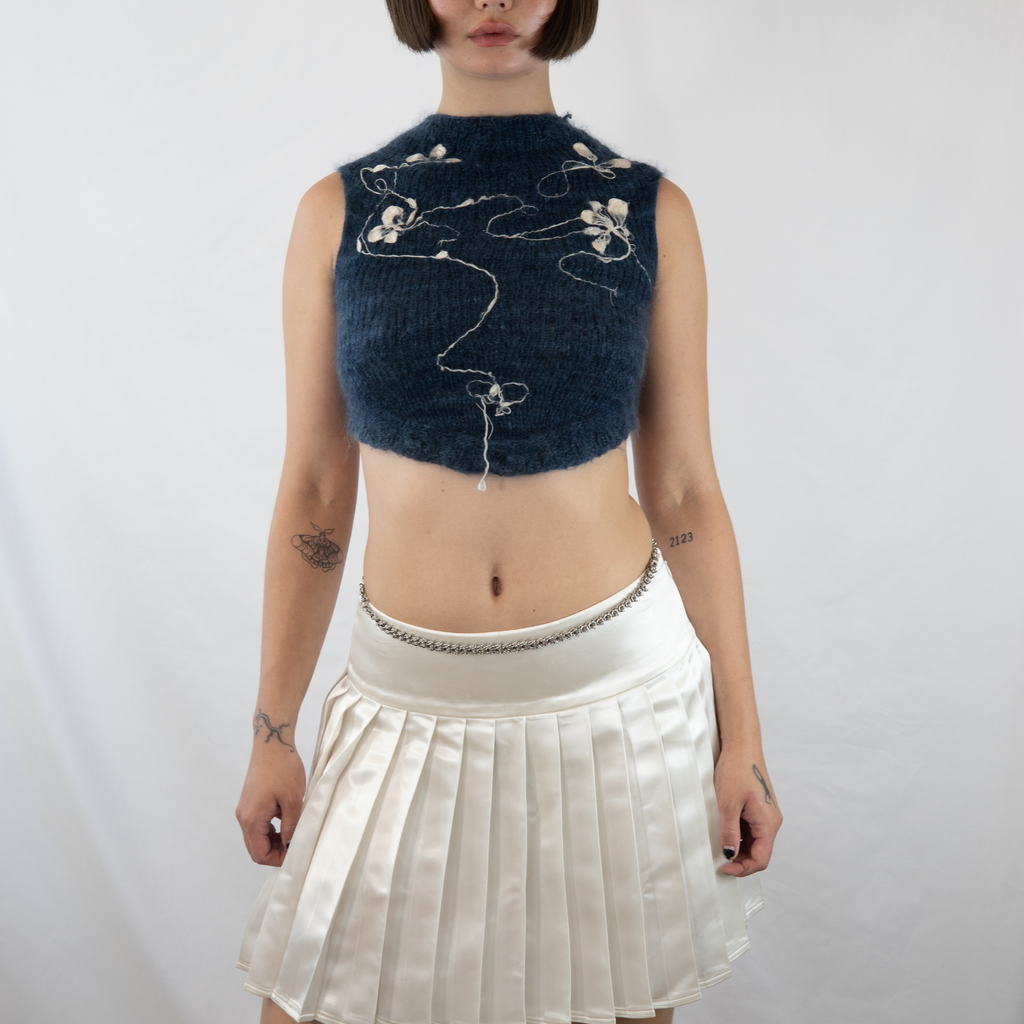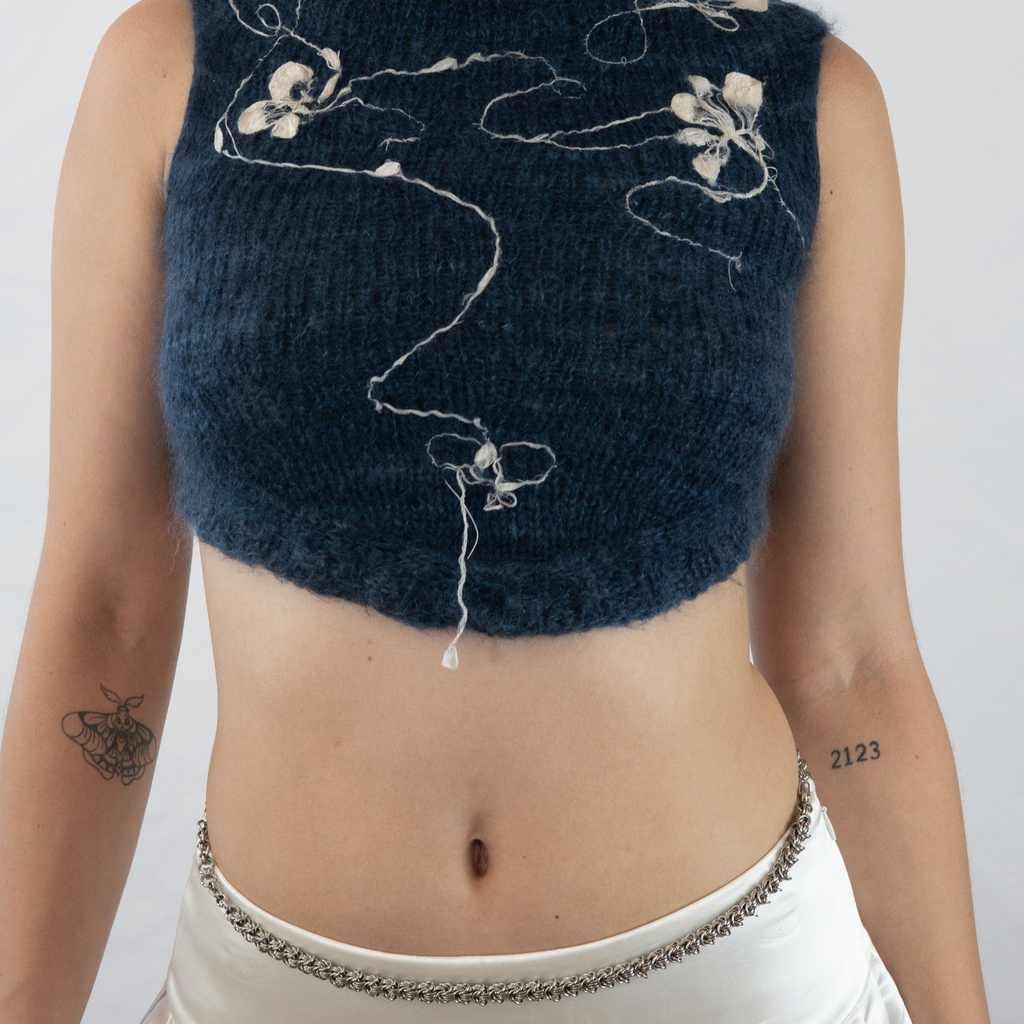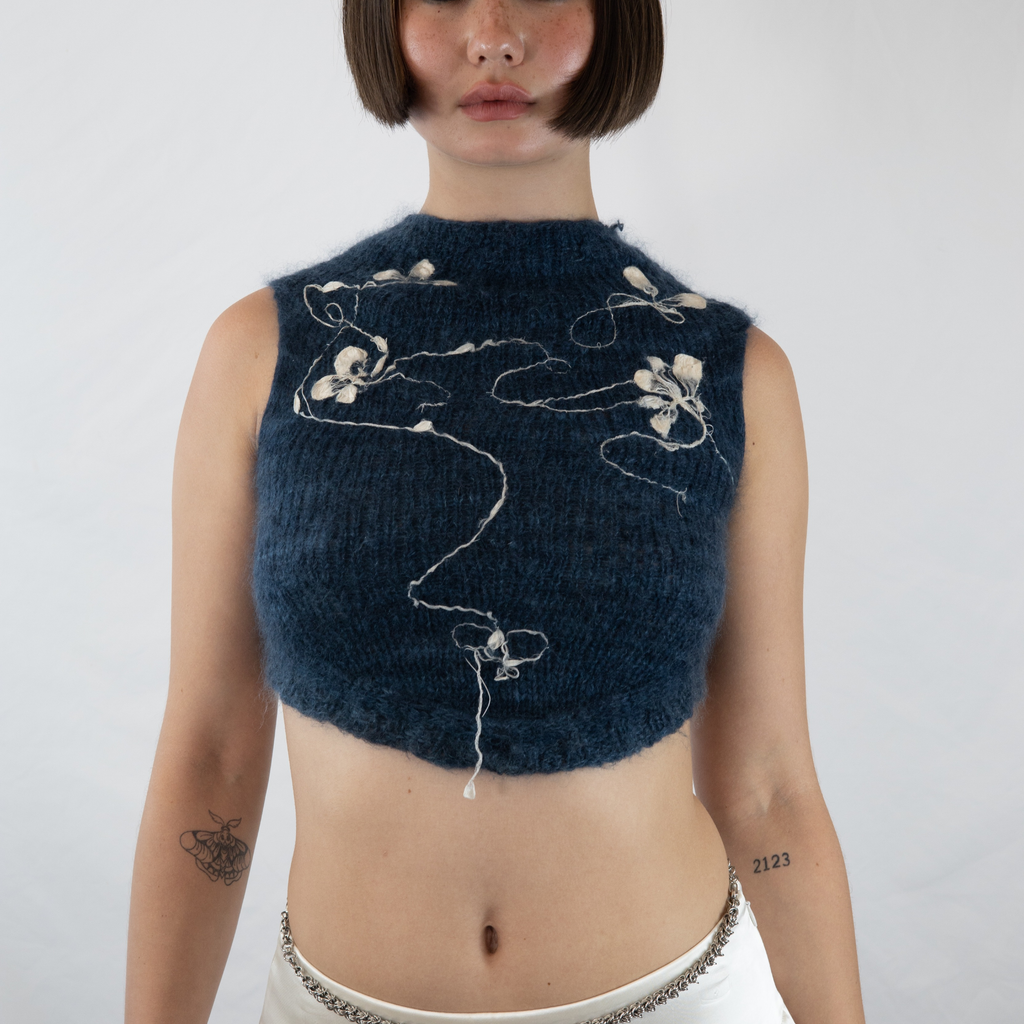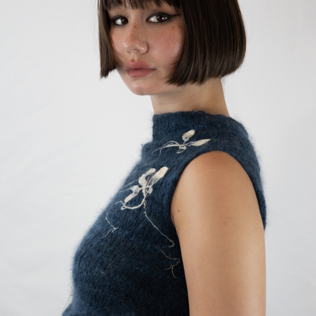 This Ink Painting Top is hand-knit with a skein of artisanal mohair from a female farmer in Nova Scotia. Embroidered with hand-raised silk cocoons hatched from silkworm eggs and raised over the course of three months in Brooklyn NYC by GRACE GUI Studio.