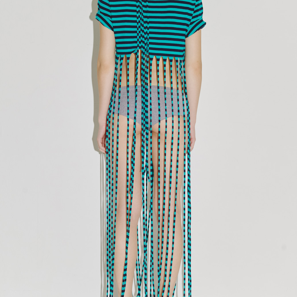 Loose fit t-shirt, multi-way styling, strings are made by pulling fabric strips (raw edge), logo embroidery, (string length will be slightly shorter than pictures to increase wearability)