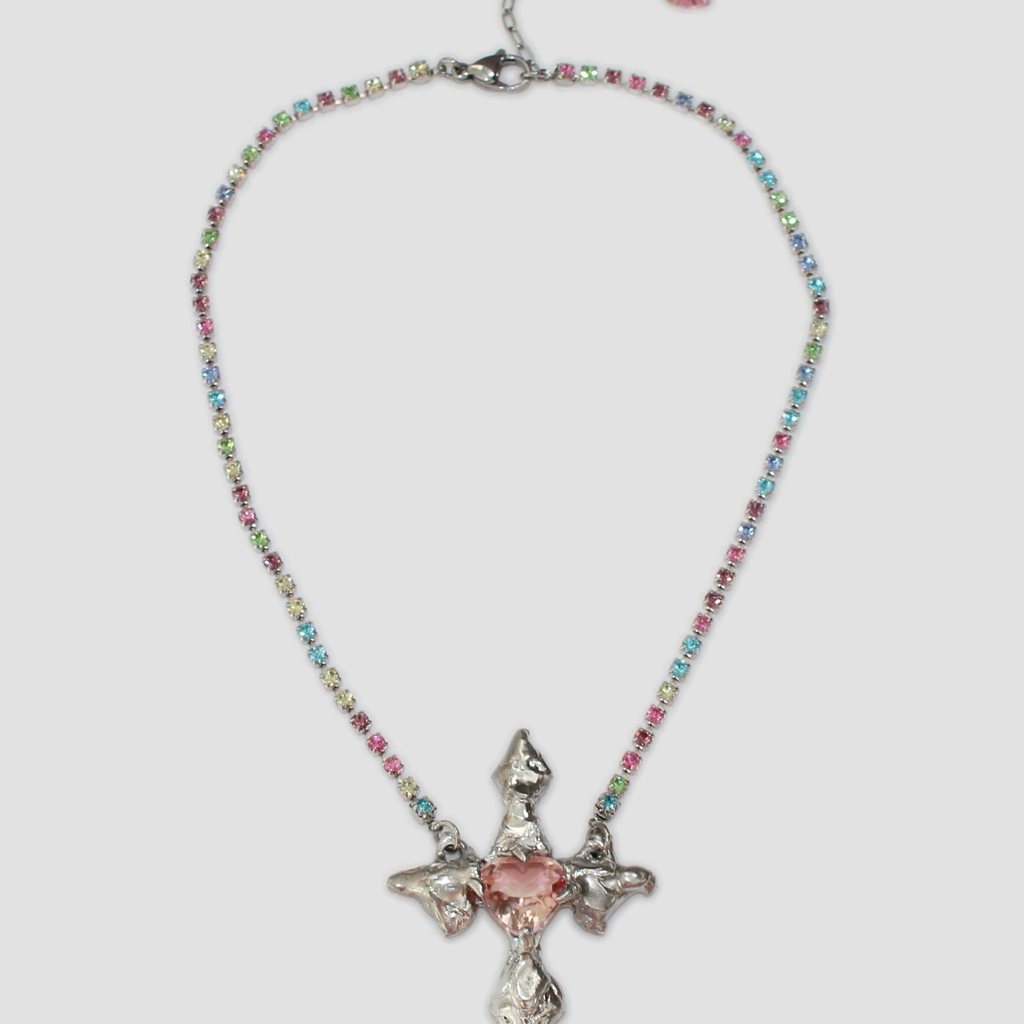 Brass, silver, tin, peach glass heart, silver tone rainbow crystal chain